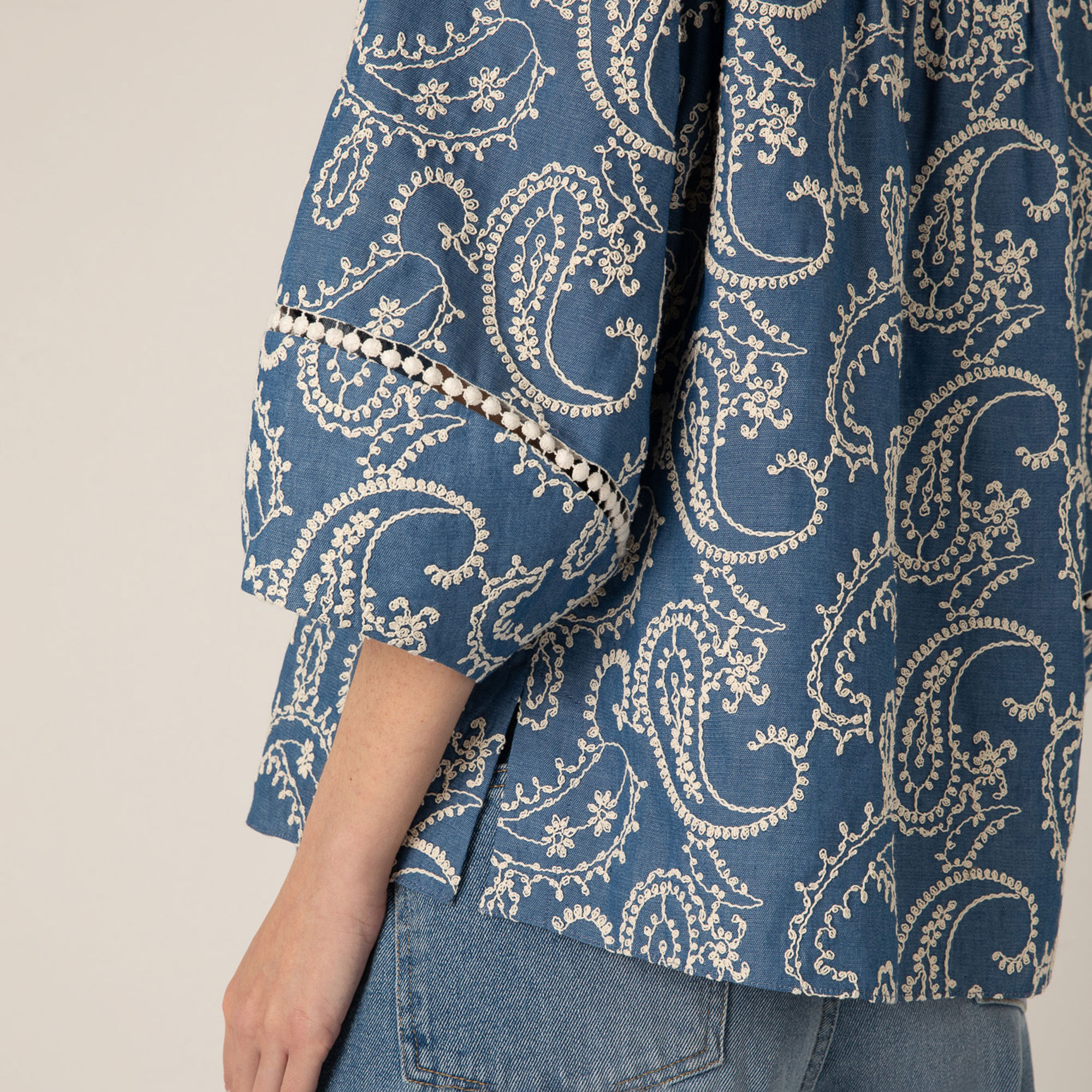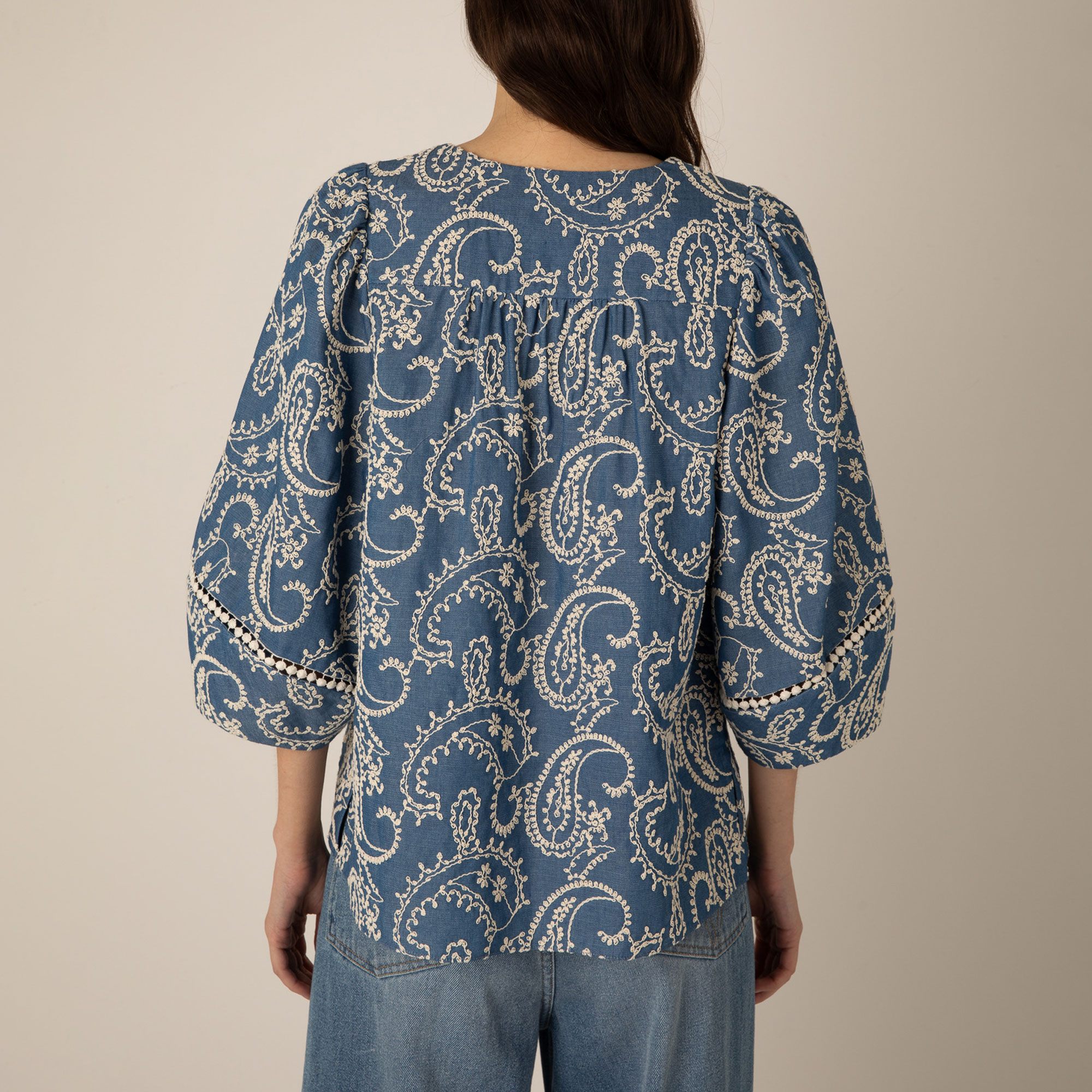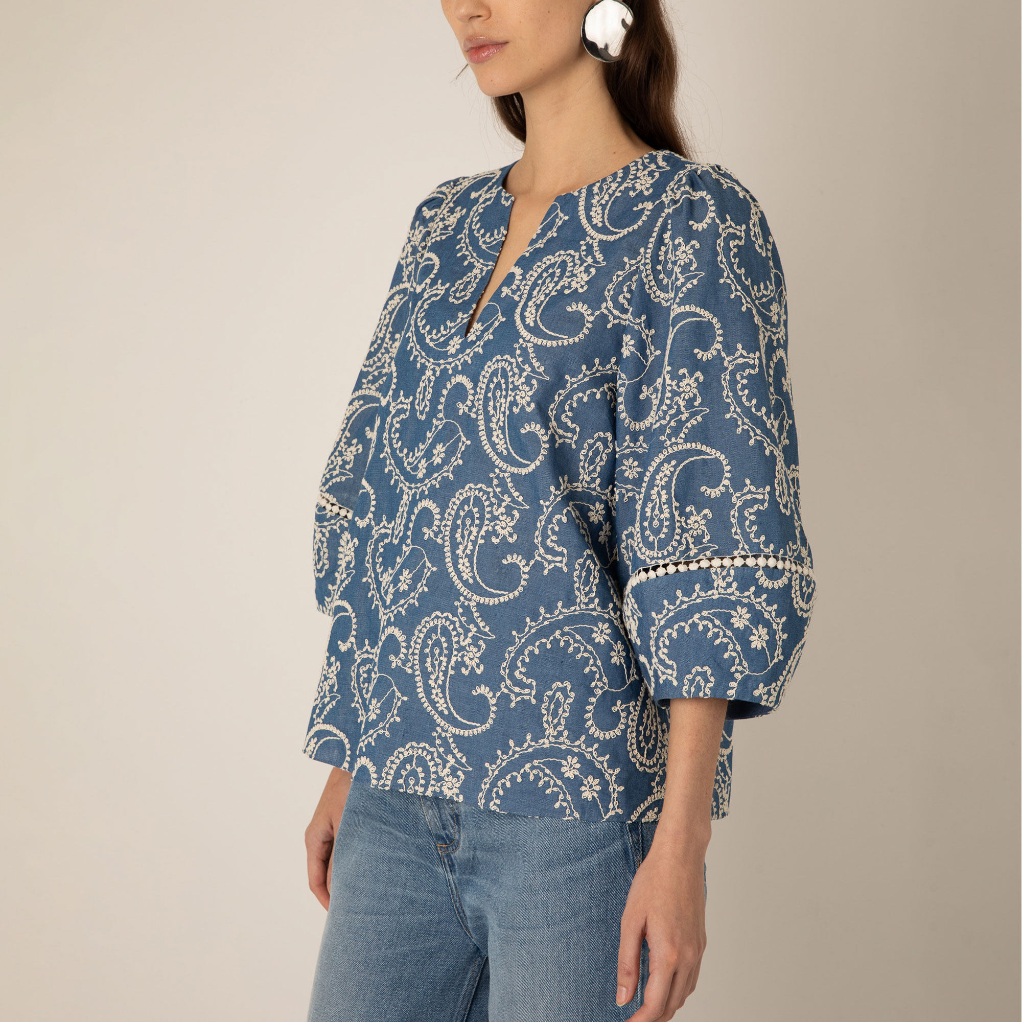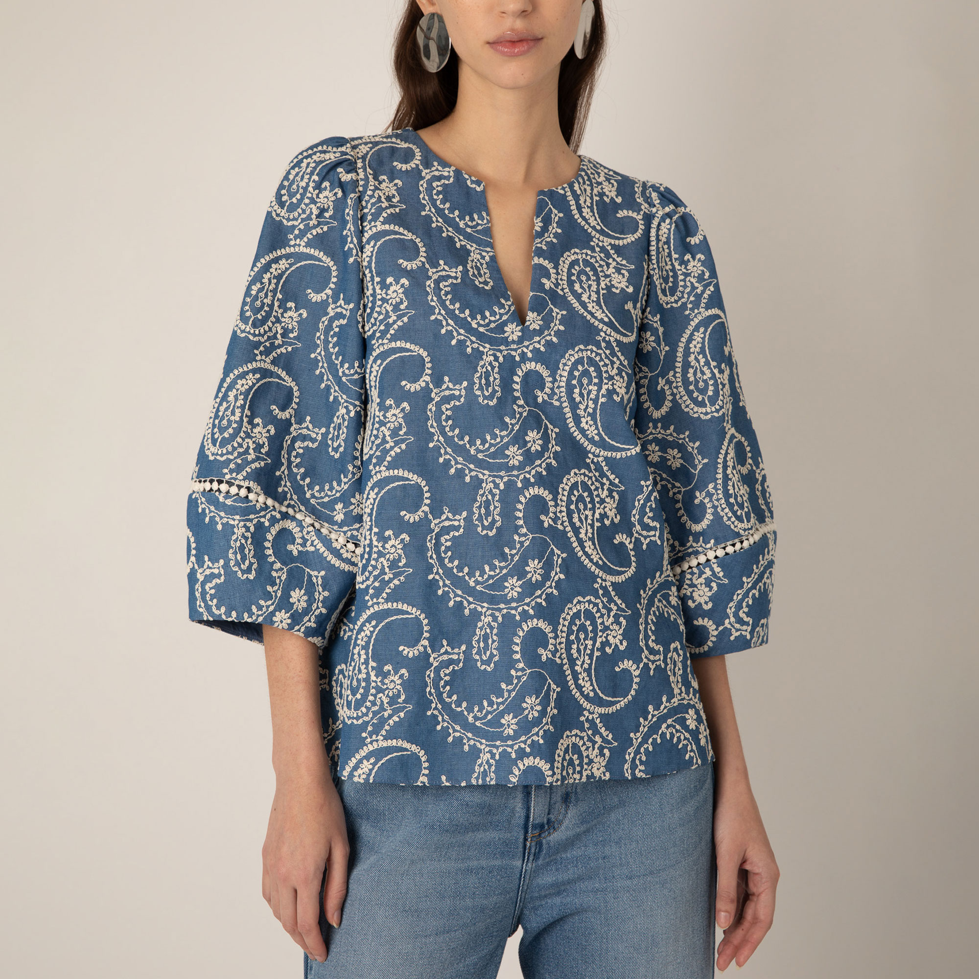 • Paisley embroidery, V-neckline, cropped sleeves, structured shoulders