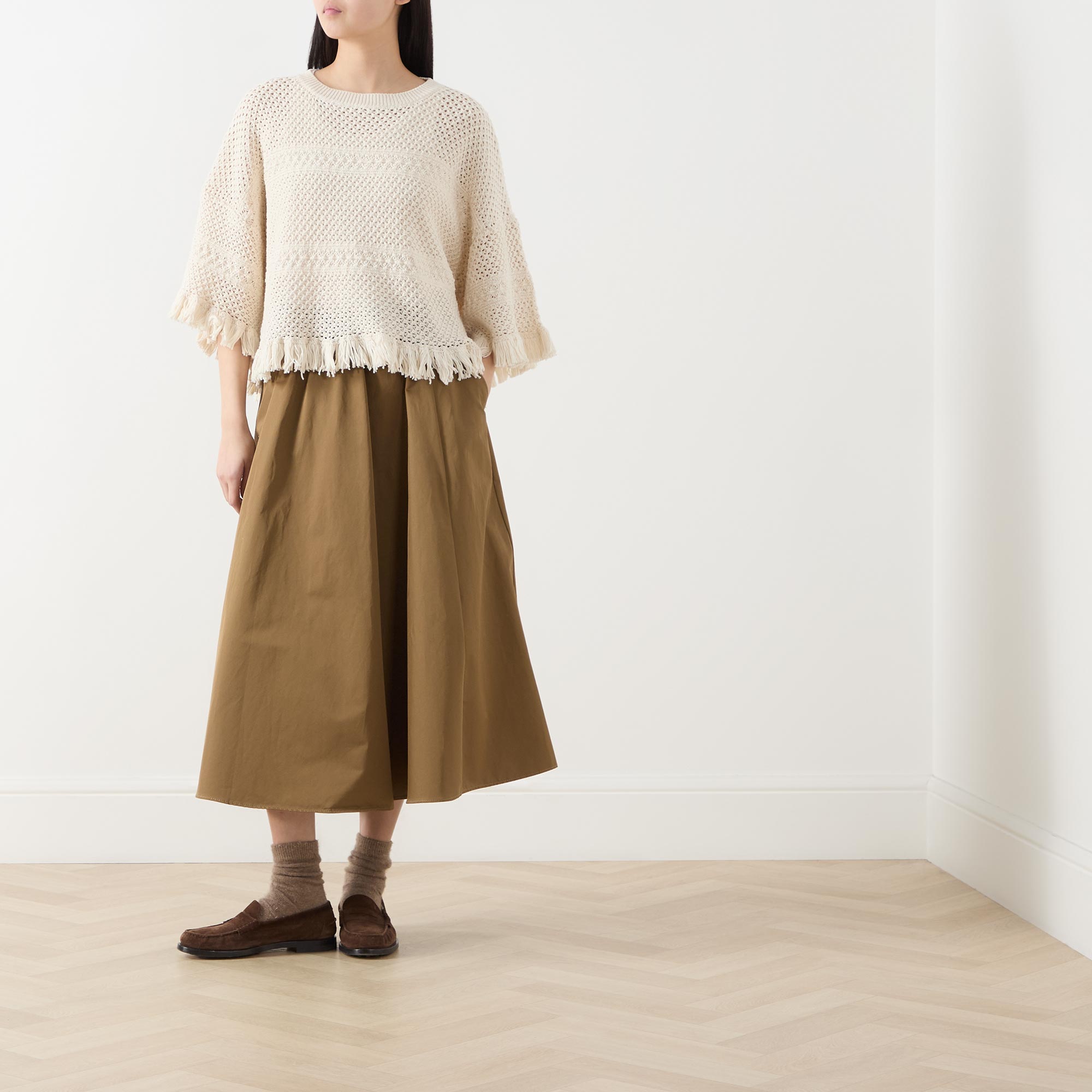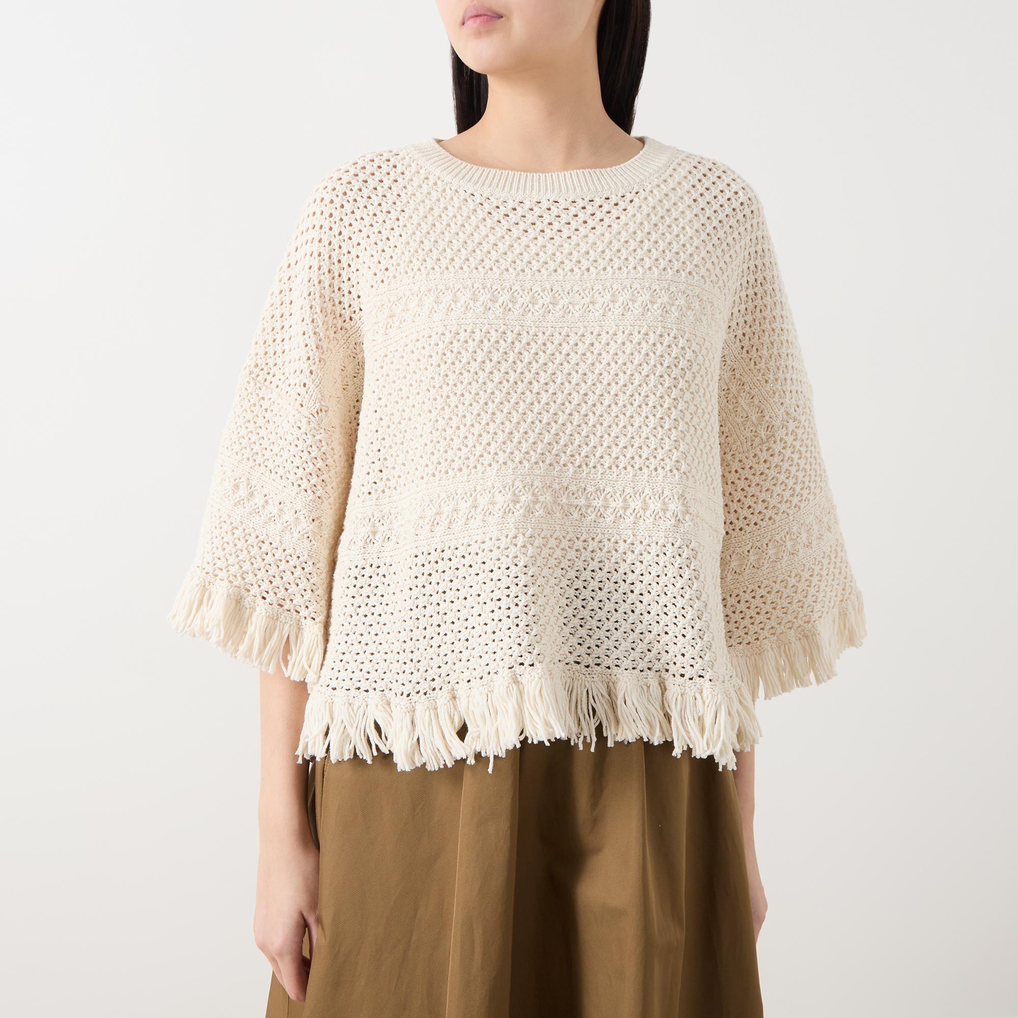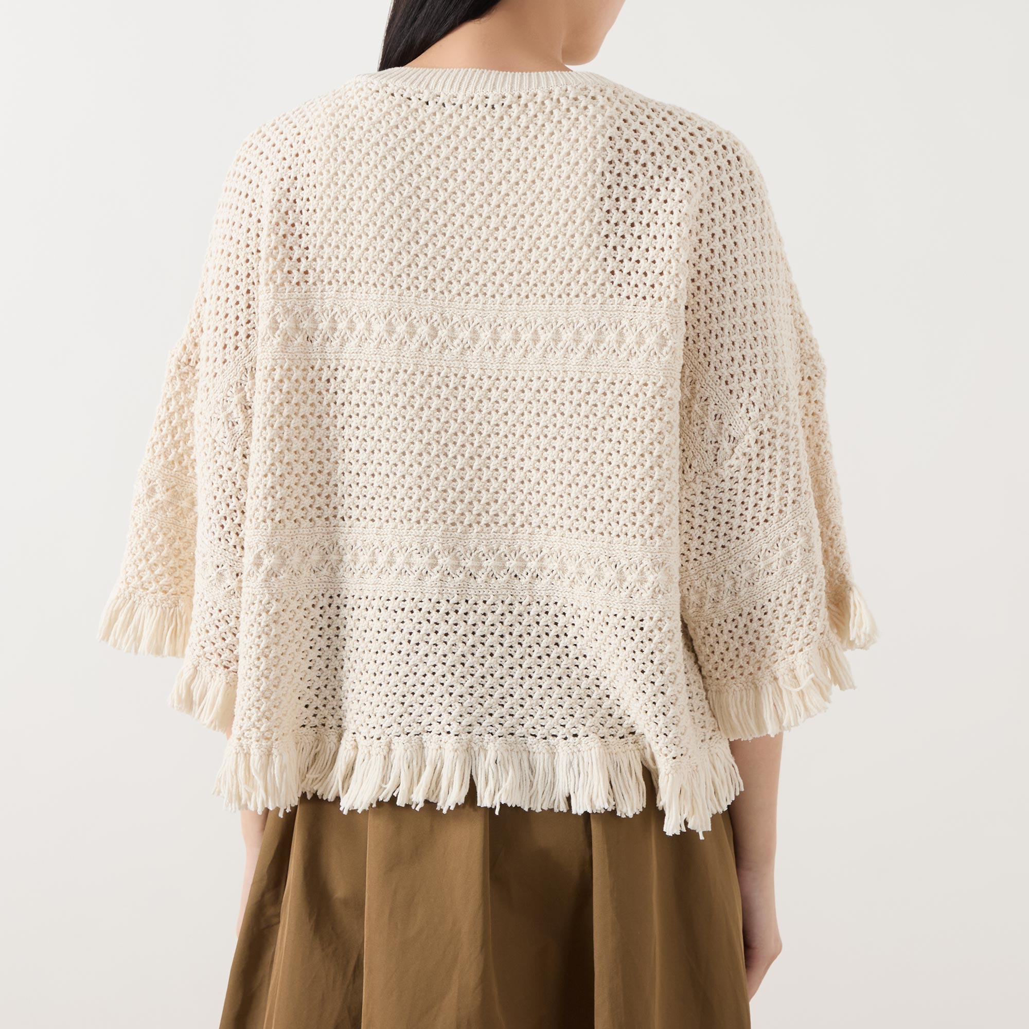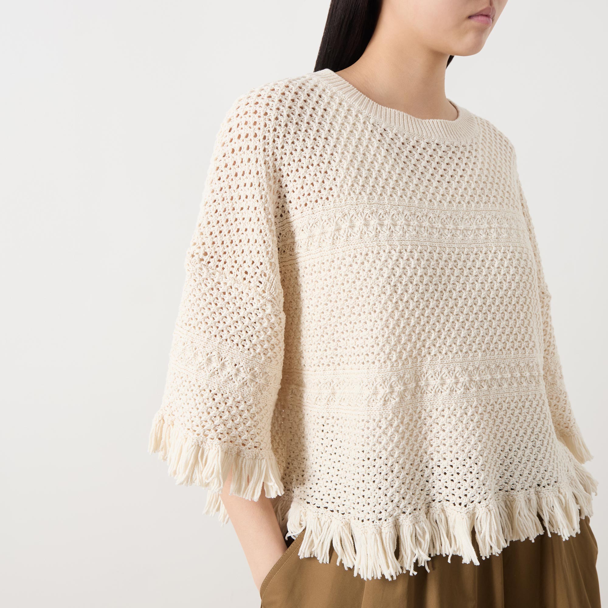 - Round neckline, three-quarter-length inset sleeves, fringed trims, crochet structure