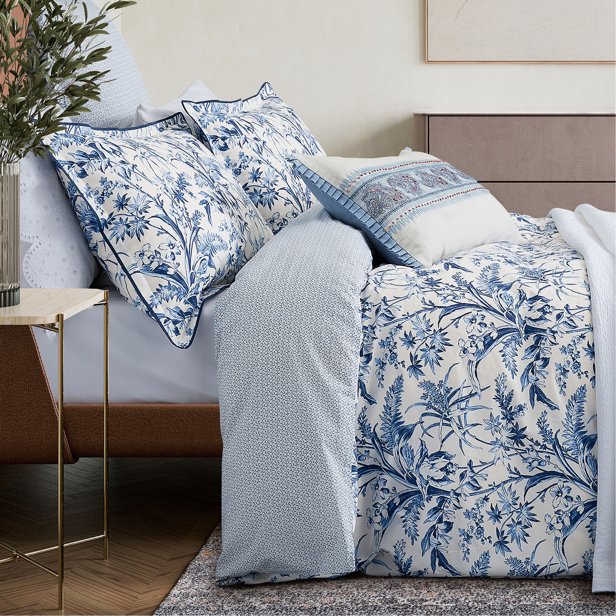 Este showcases intricate renderings of blooming florals and delicate foliage in an elegant indigo blue palette, beautifully contrasted against a crisp white base. A small-scale swirling print provides the perfect coordinate, appearing on the reverse of the duvet cover and the oxford pillowcases which are included in the duvet set, for a refined finishing touch. To complete the look, add in the square pillowcase pair feature delicately embroidered floral edges.