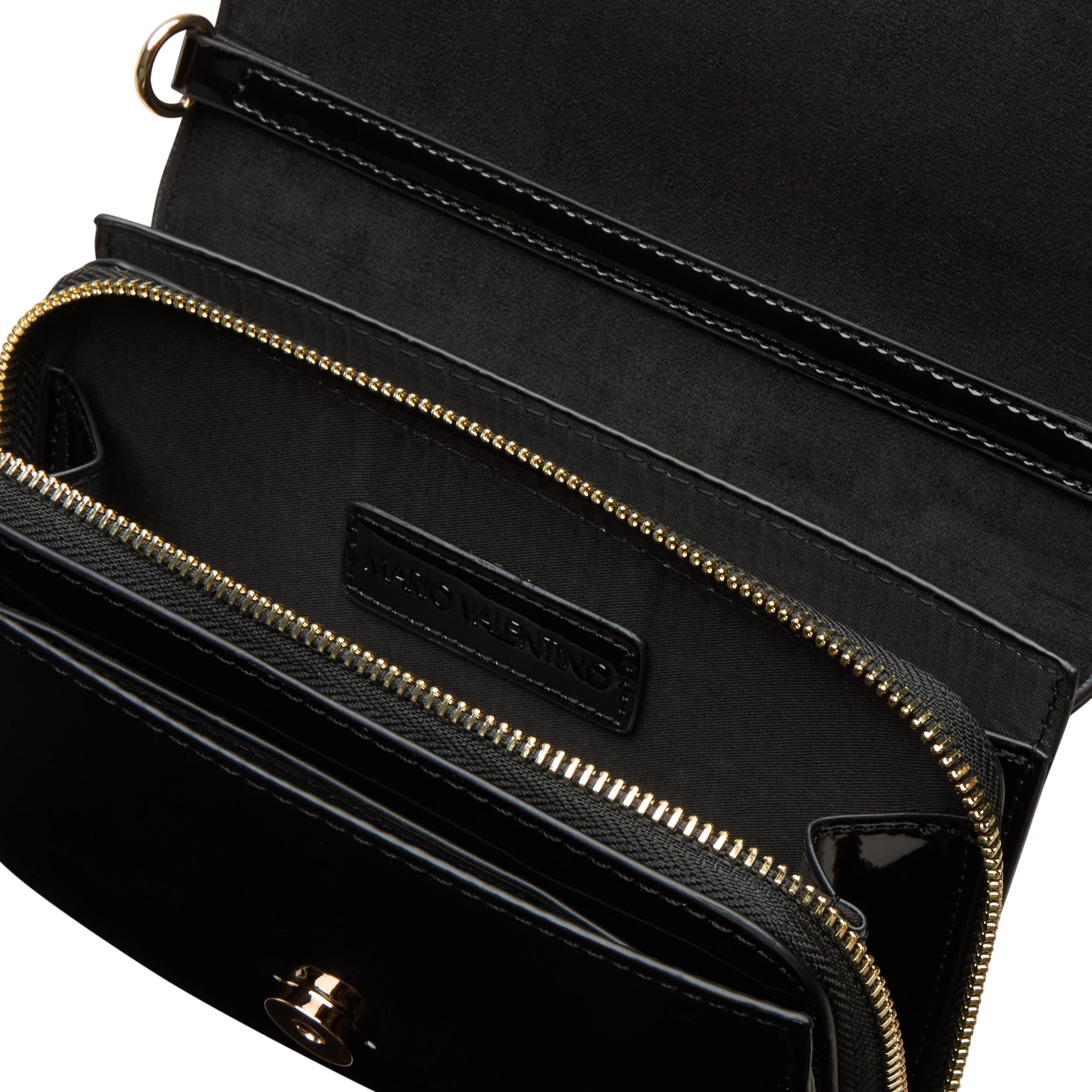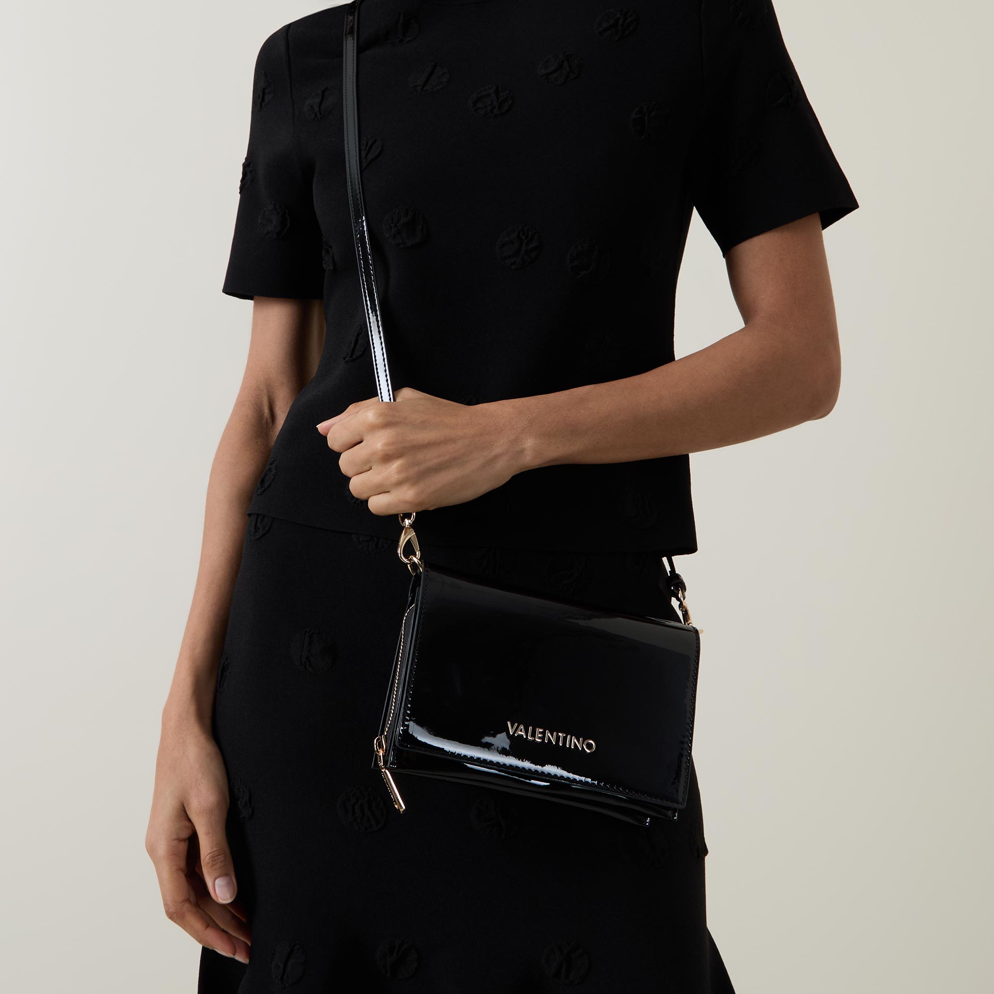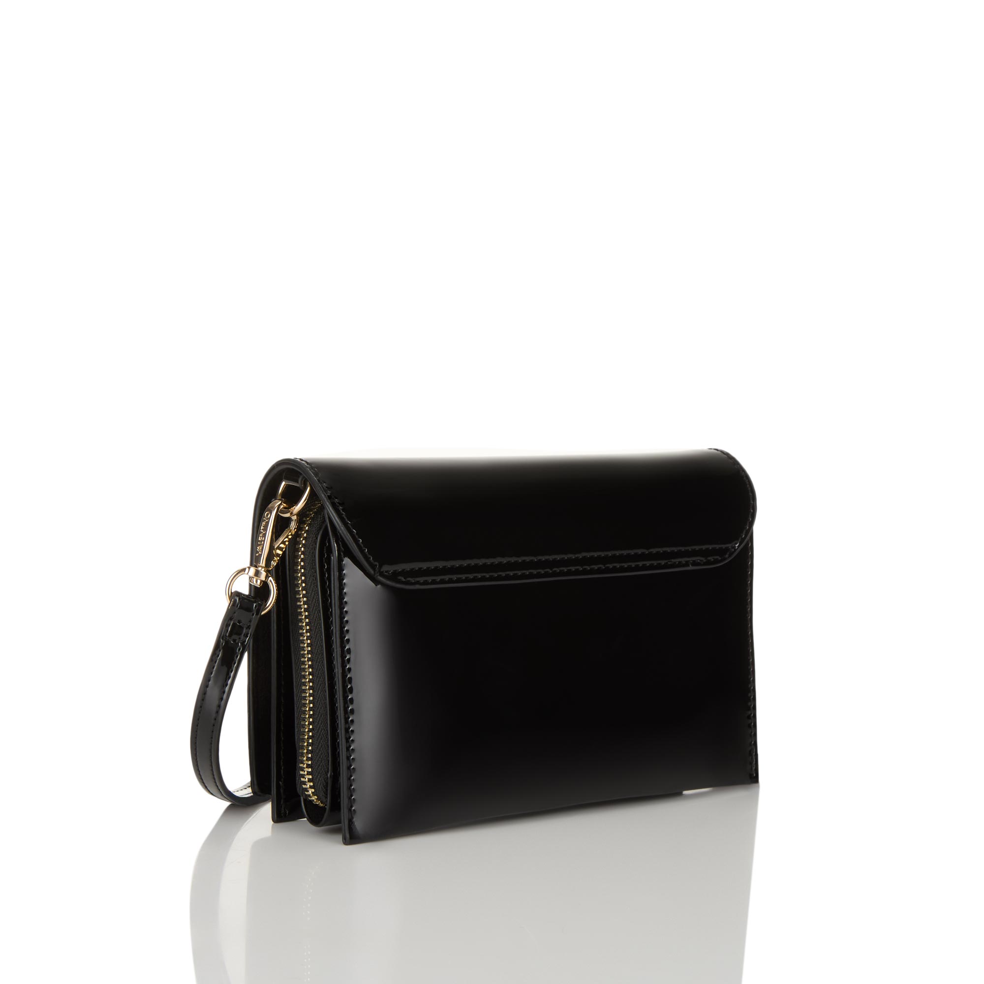 • Foldover flap closure, snap-button fastening, detachable crossbody strap, gold-tone hardware, front logo lettering, tonal stitching, shiny patent finish