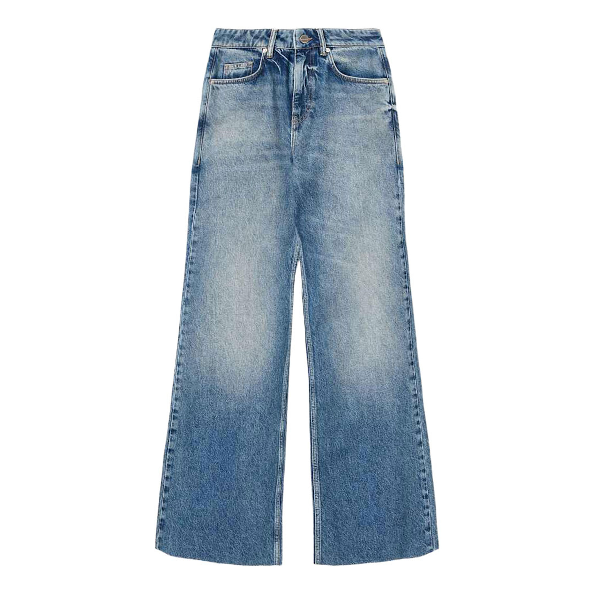 - Relaxed flared silhouette, rigid denim, logo detail at back waistband