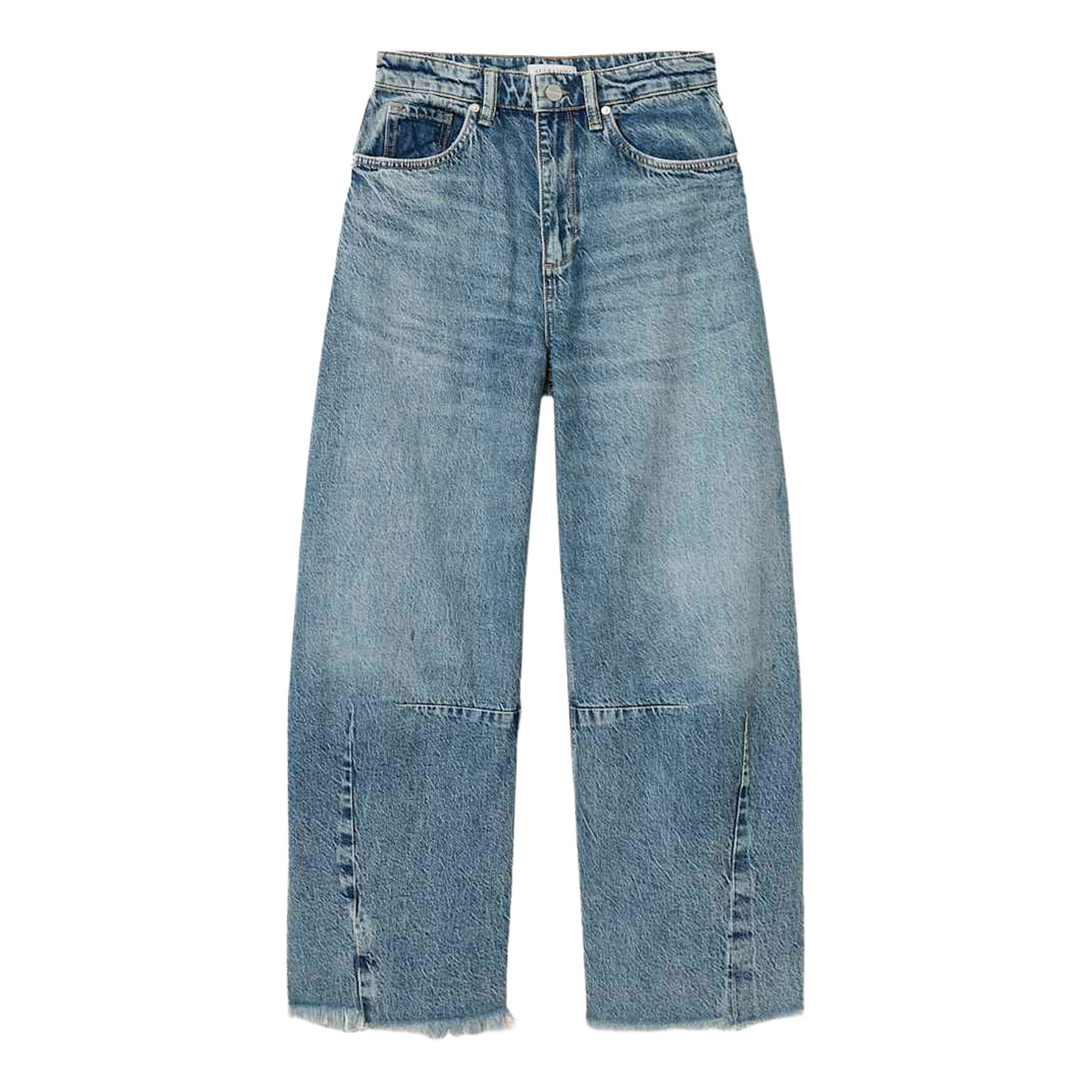 - Barrel leg, raw hem edge, button closure with fly zipper, logo detail at back waistband