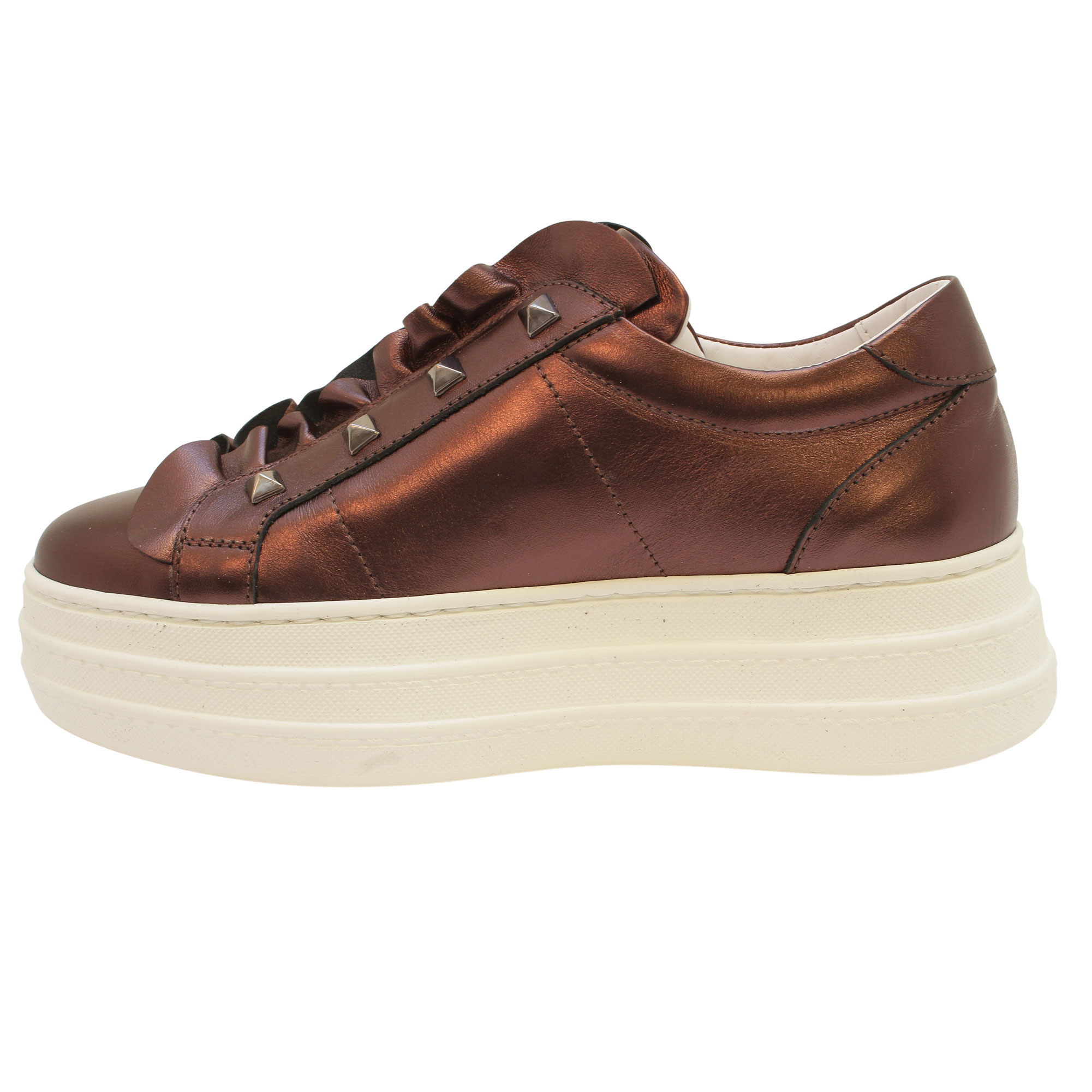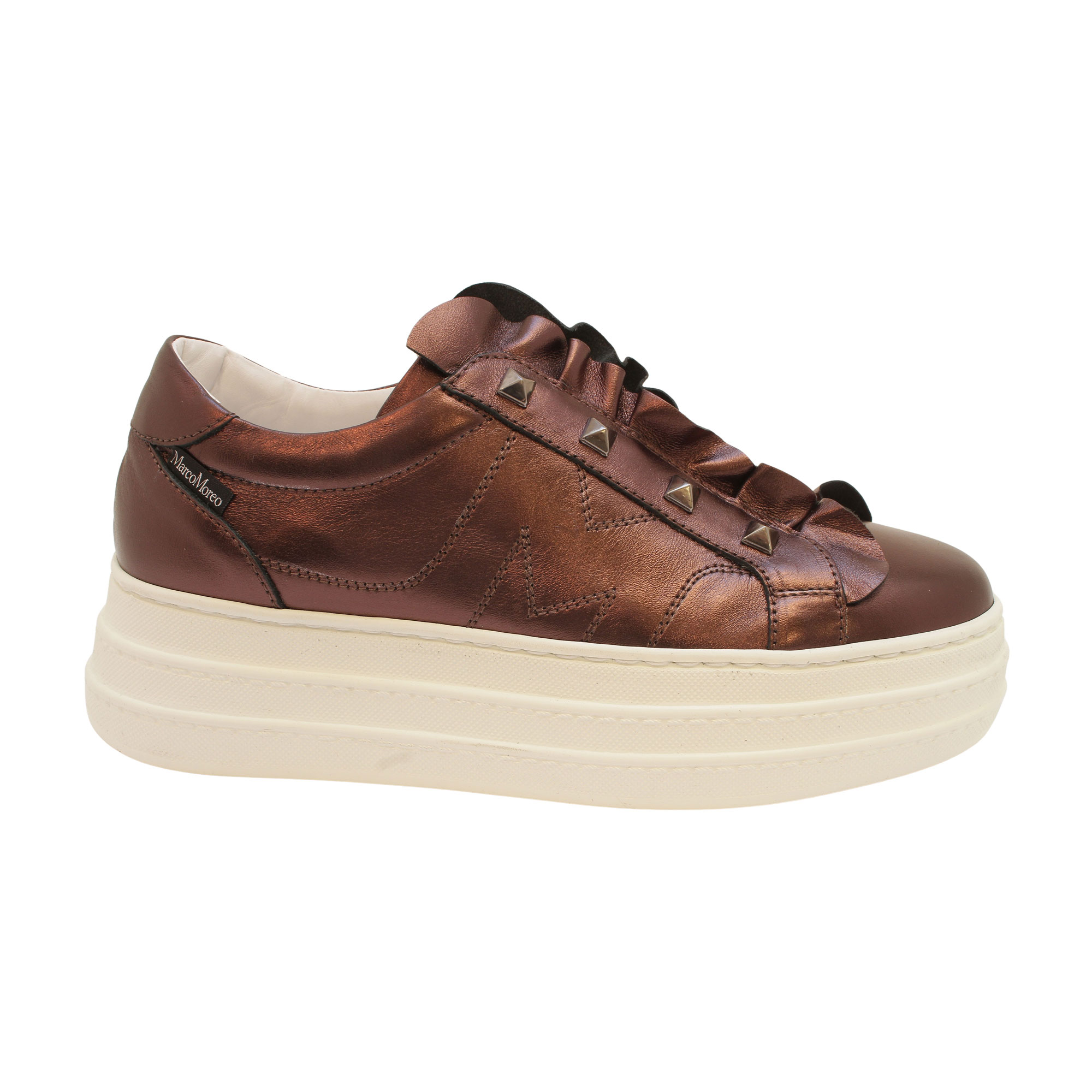 Whitney is Marco Moreo's statement platform trainers in metallic anthracite. The upper is traced by the signature stitched “M”, while a soft ruffle ripples over the tongue and a studded strap adds a rock-chic touch. Set on Marco’s ultra-light, height-boosting platform sole, it delivers cushioned comfort from morning to night. Everyday glamour, unmistakably Marco Moreo.