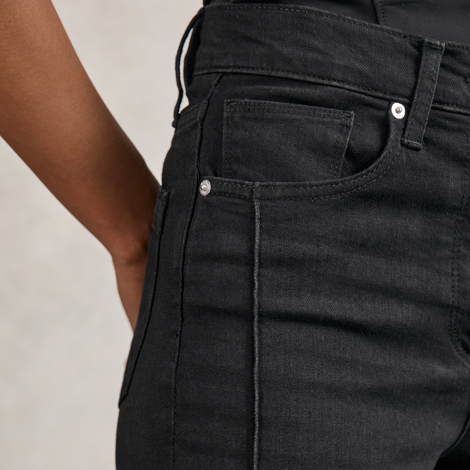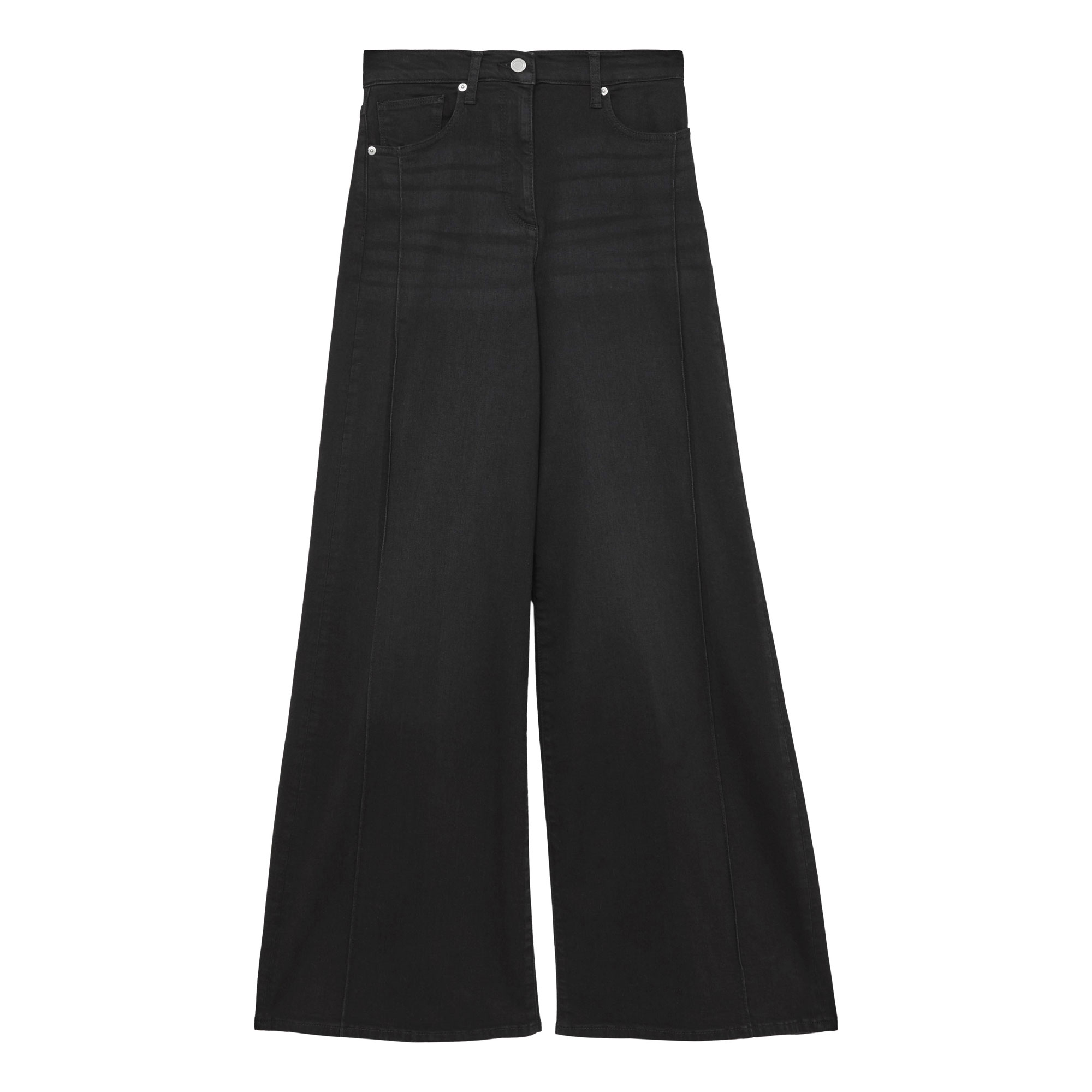 • Stretch cotton-modal fabrication, wide leg, high-rise, pintuck detailing, light feathering at the thigh, five pocket styling, front button and zip fastening