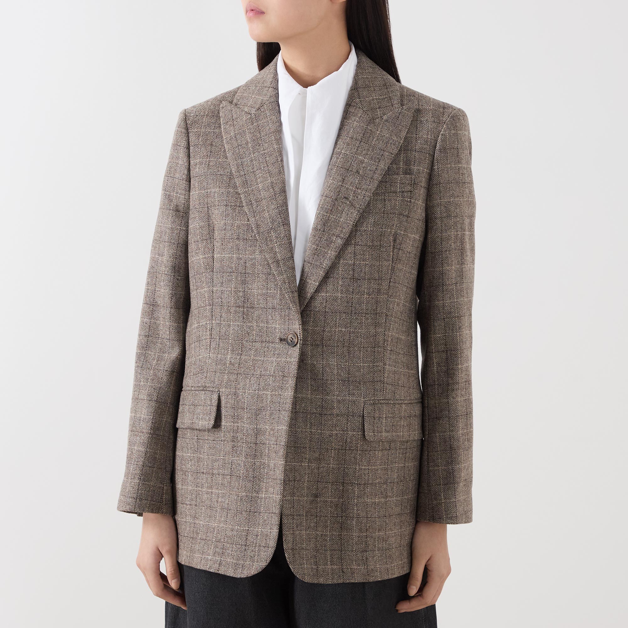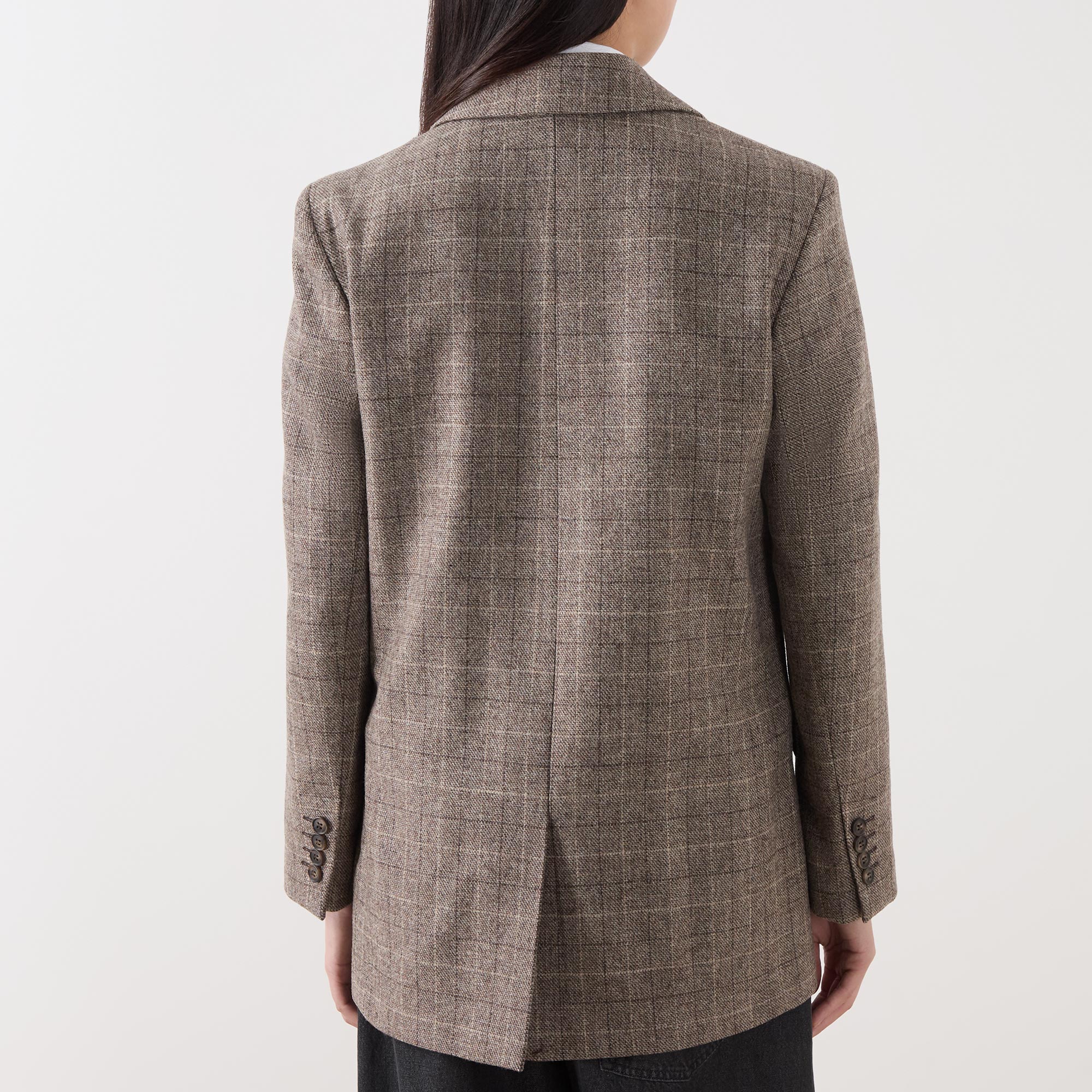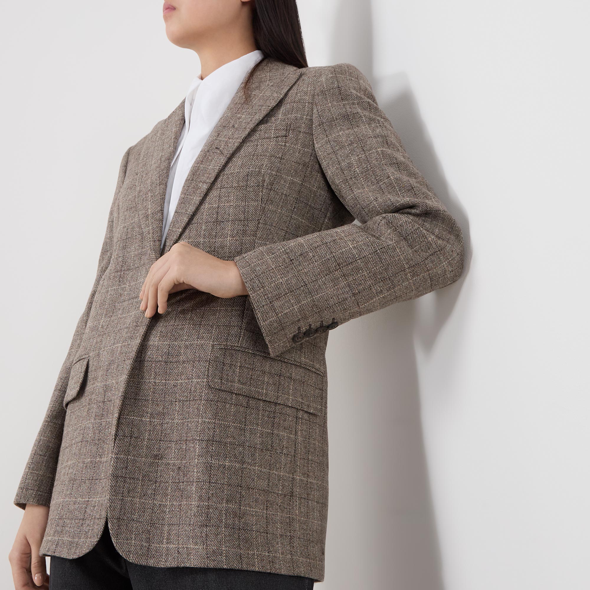 • Single breasted, peak lapel collar, structured shoulders, long sleeves, buttoned cuffs, front button fastening, one chest welt pocket, two hip flap pockets, curved front hem, rear vent, check print, soft finish, lined