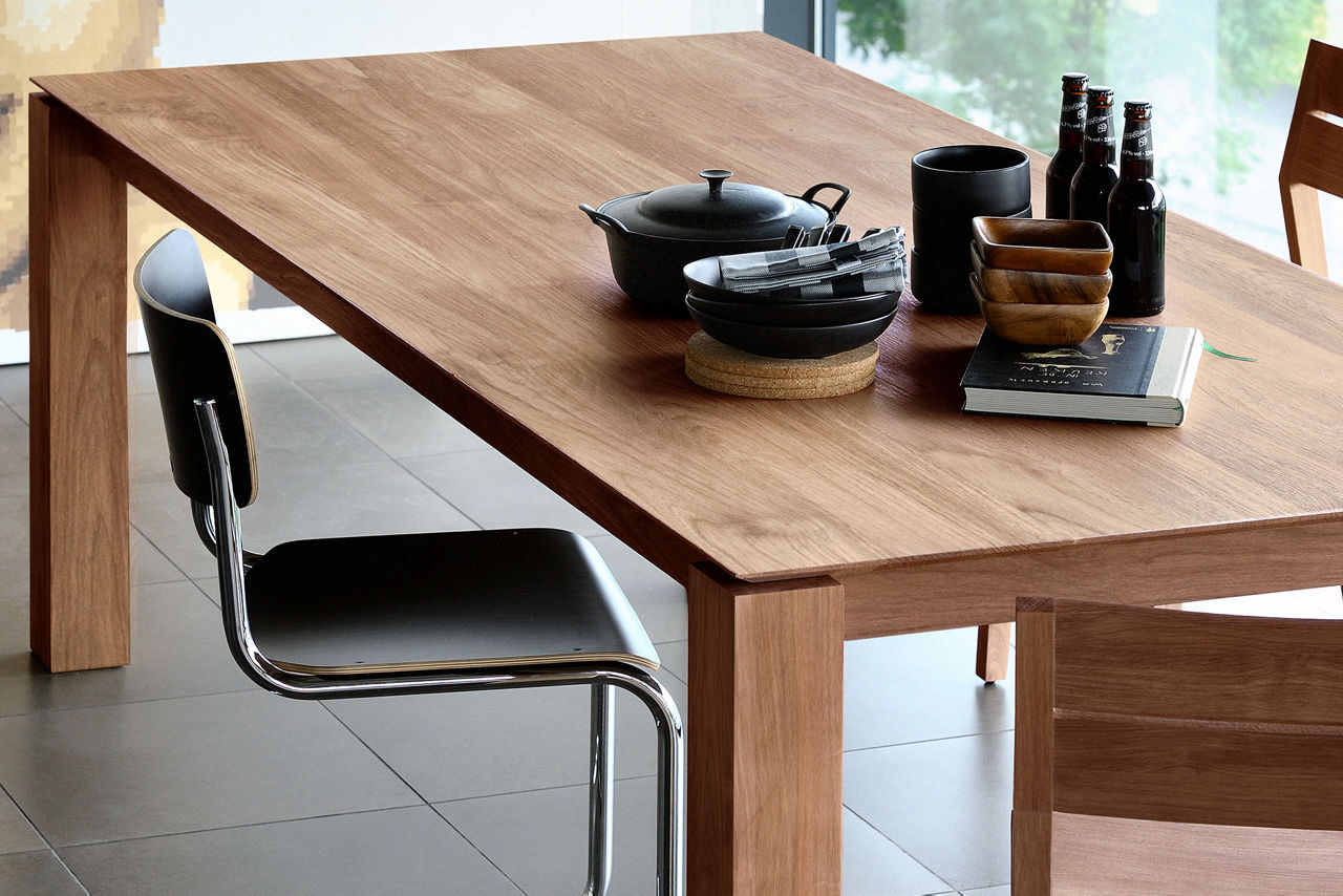 The robust legs of the teak Slice extendable table move with the extension, allowing you to keep seating space at a maximum. Available in two sizes, the Slice extendable dining table is also available in oak and walnut.