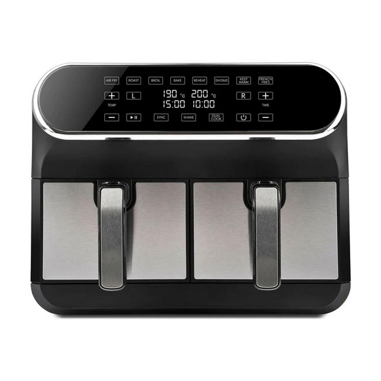 SYNC COOK - Set each basket to cook different foods and then Press the SYNC option to finish foods at the same time.
