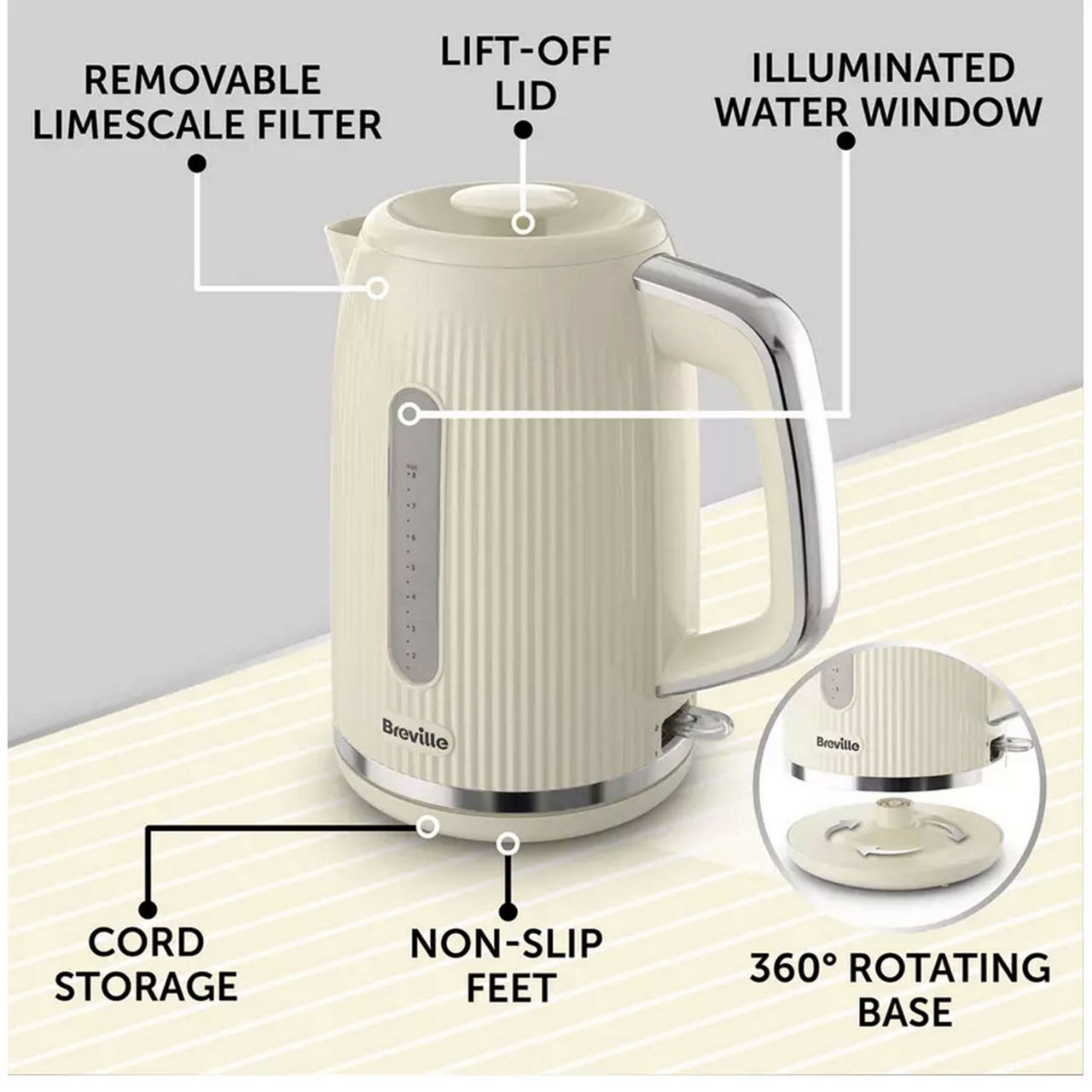 This Breville kettle looks stylish and also handles the basics with ease. The large 1.7L capacity boils up to 8 cups at once with the concealed 3kW element providing a quick boil. Accurate filling is easy thanks to a double sided water window, while the 360 degree cordless base is perfect for left and right hand use. An easily removable, washable fine mesh filter helps keeps limescale at bay and cord storage in the base helps keep your worktop tidy.