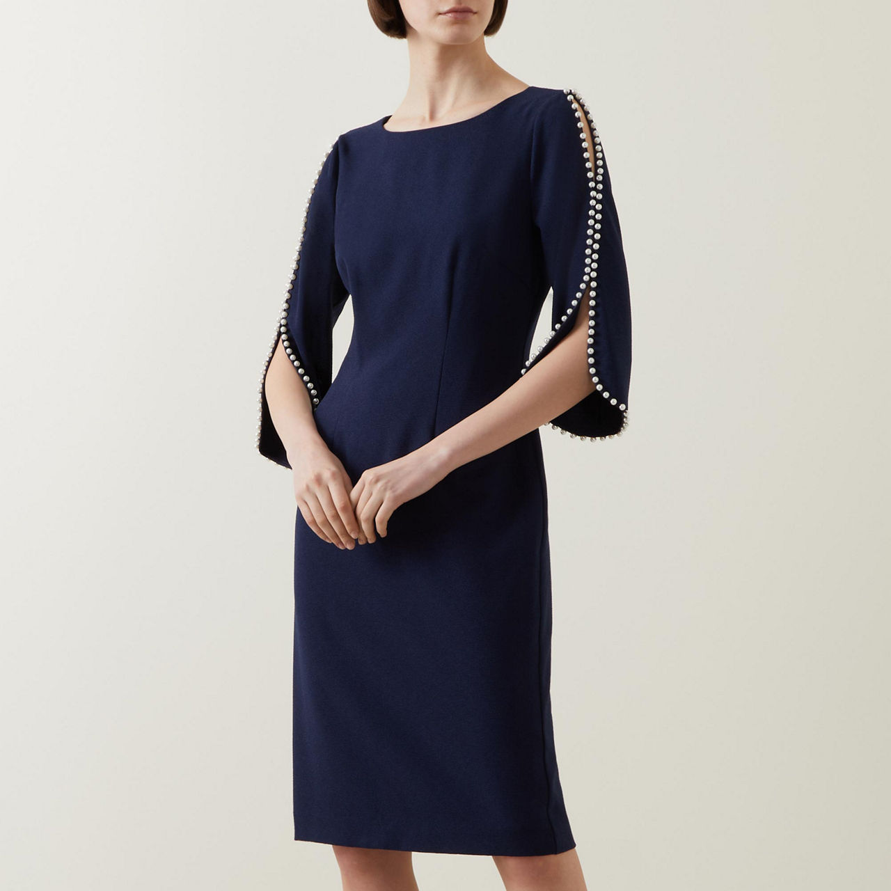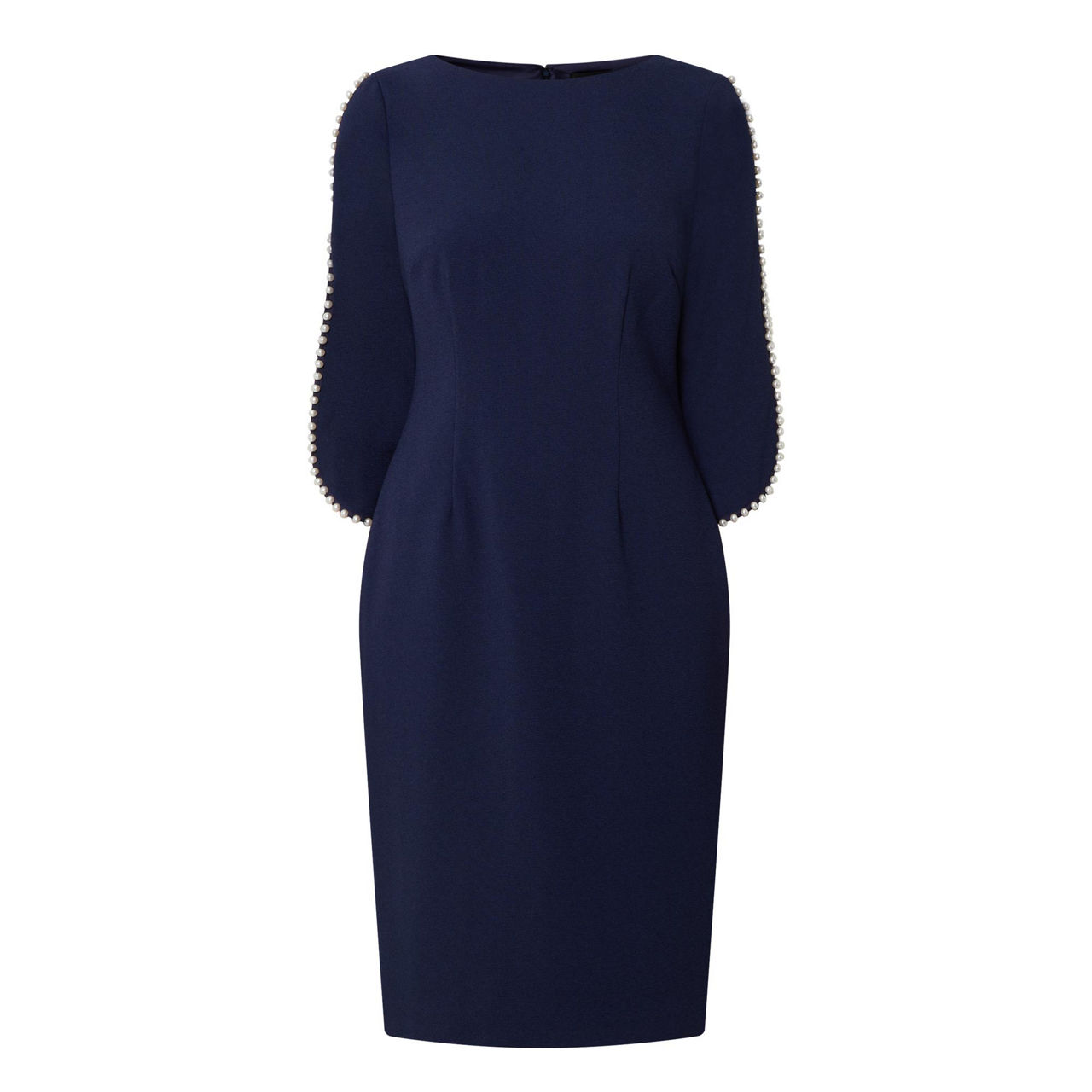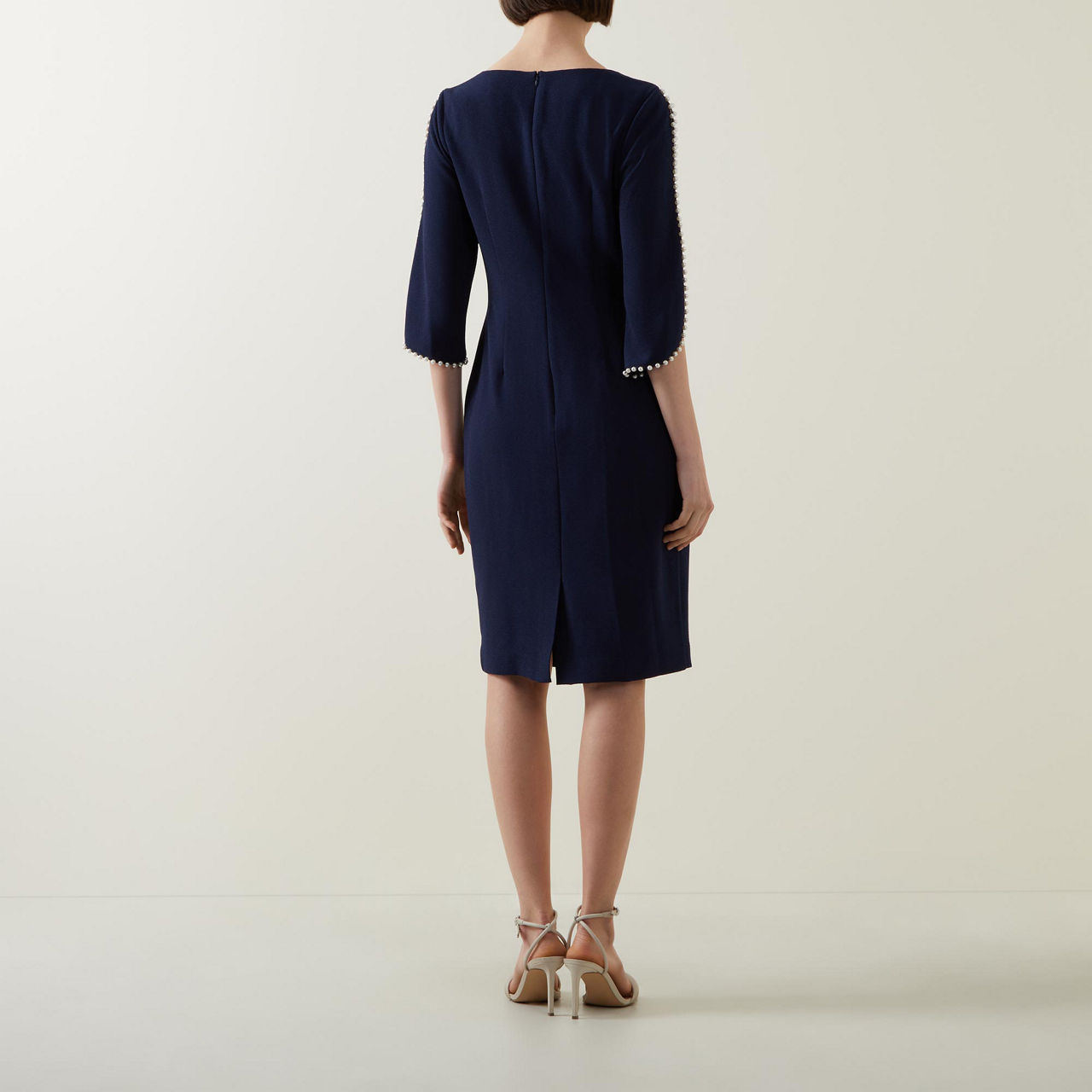 - Boat neckline, half-length sleeves with pearl detailing, fitted bodice, rear zip fastening, fitted through the hips, rear vent design, crepe-textured fabric, midi length