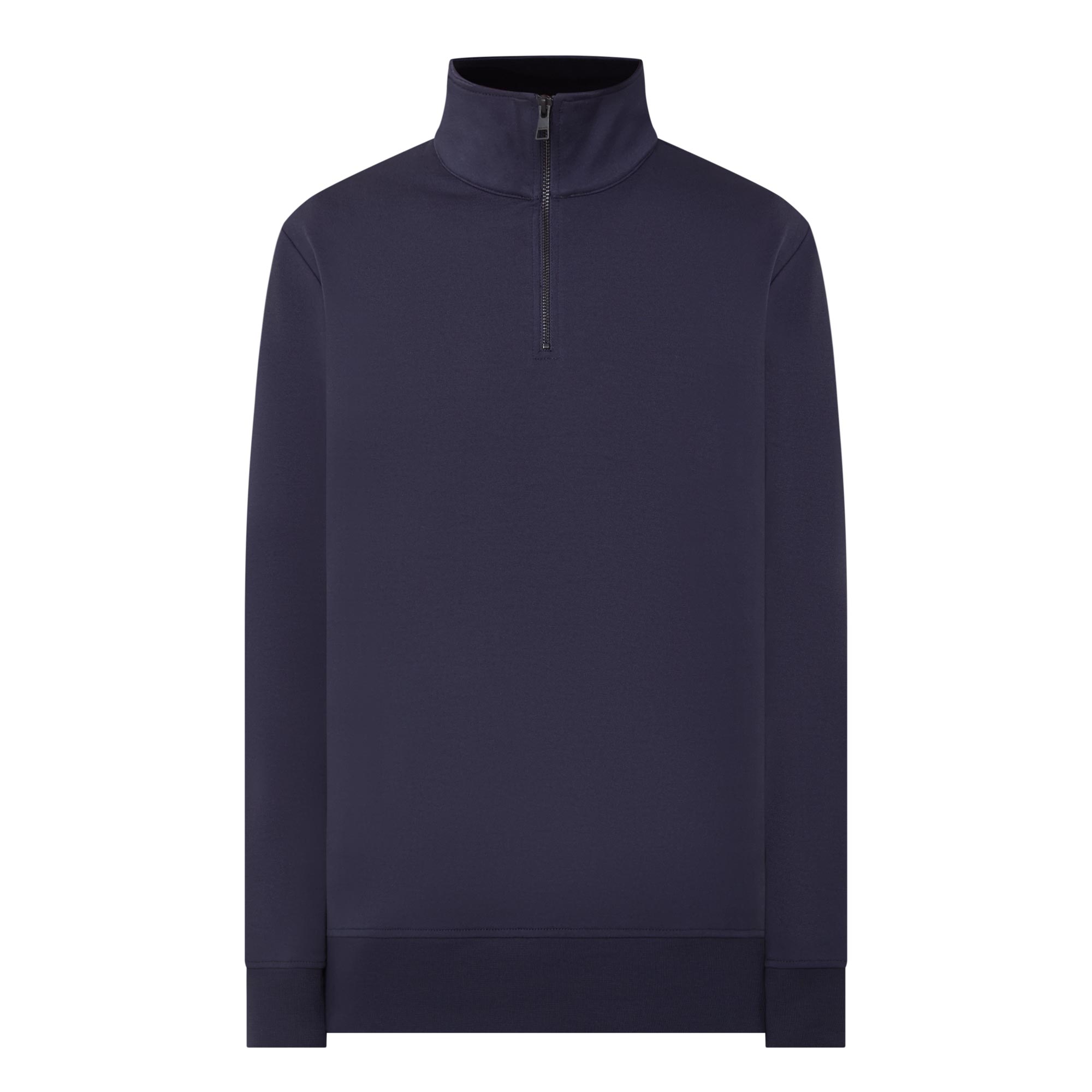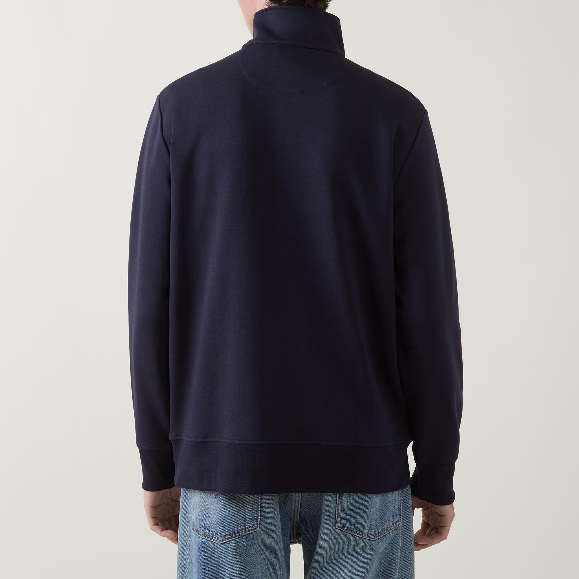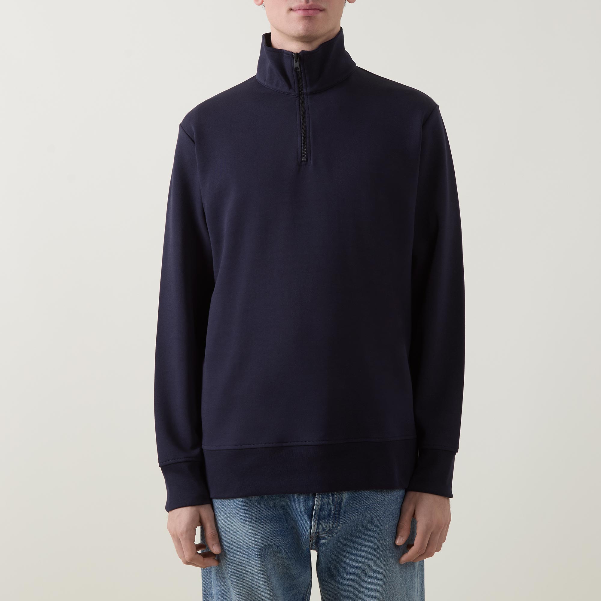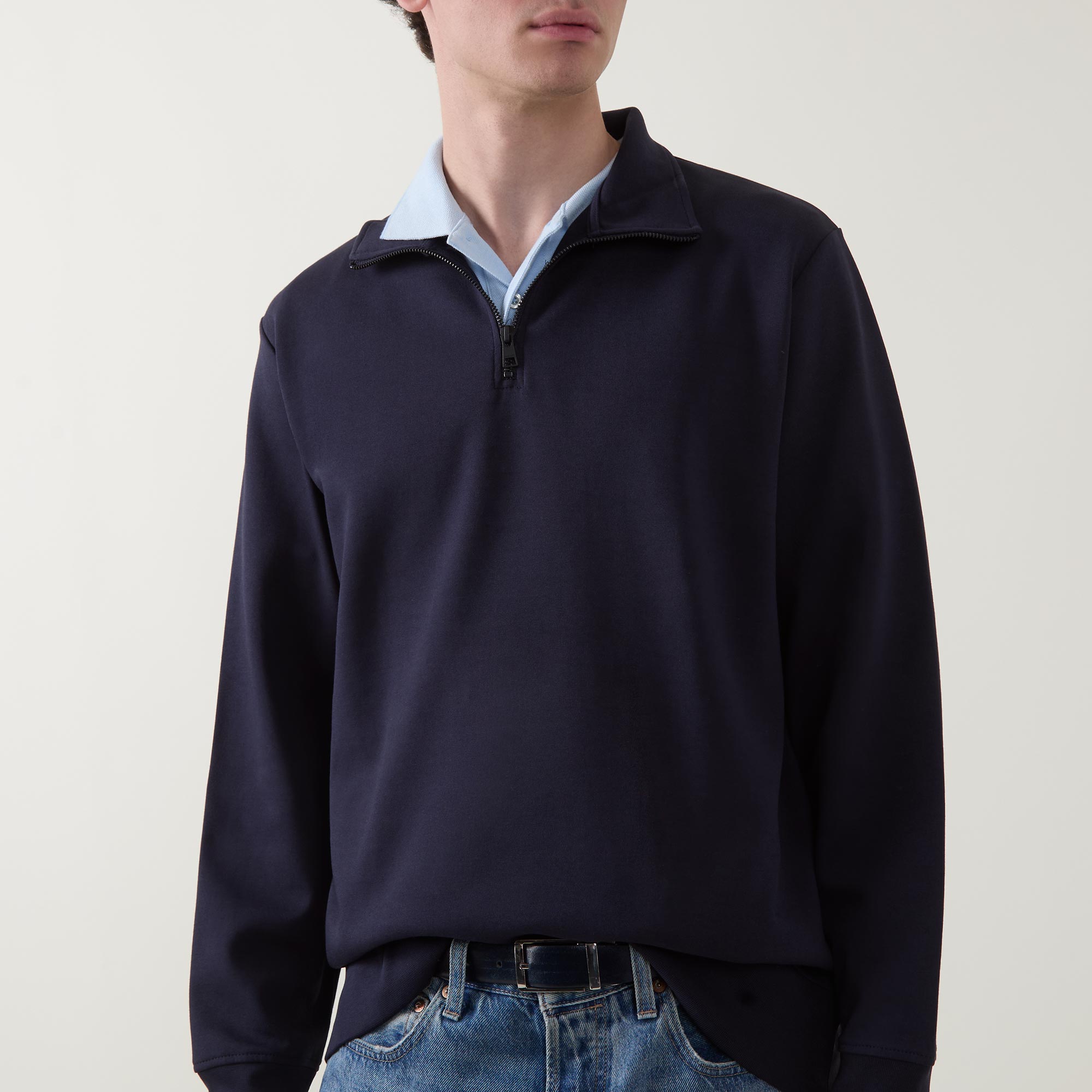 - Funnel neck, half zip placket, dropped shoulders, long sleeves, straight hem, ribbed trims, smooth finish