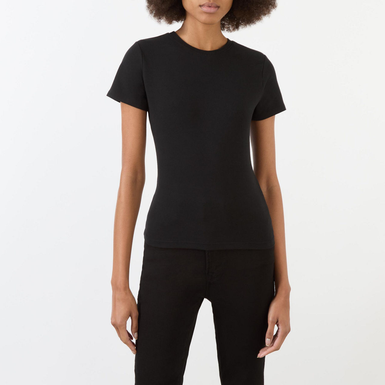 - Crew neck, short sleeves, super-stretch fabric, straight hem, classic design