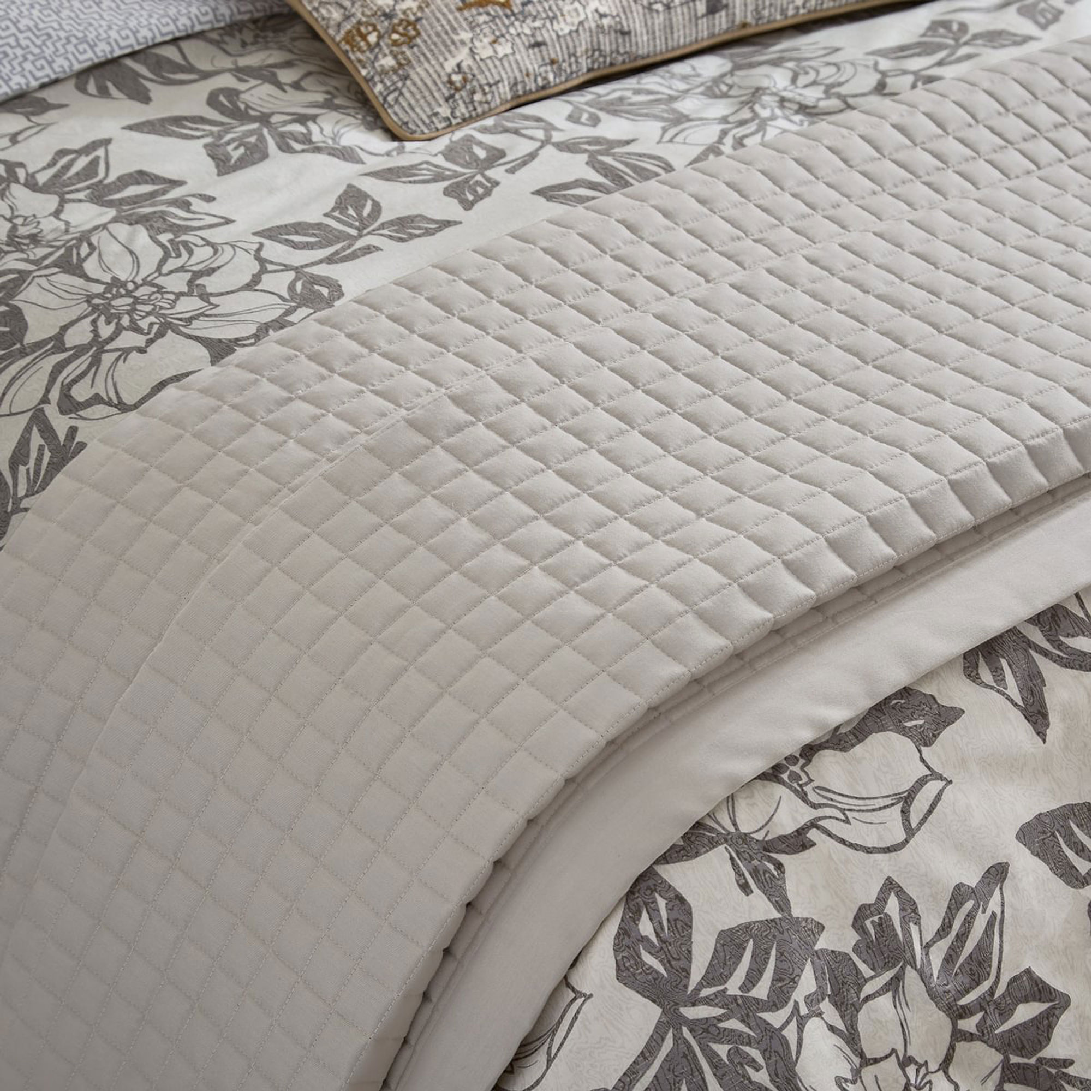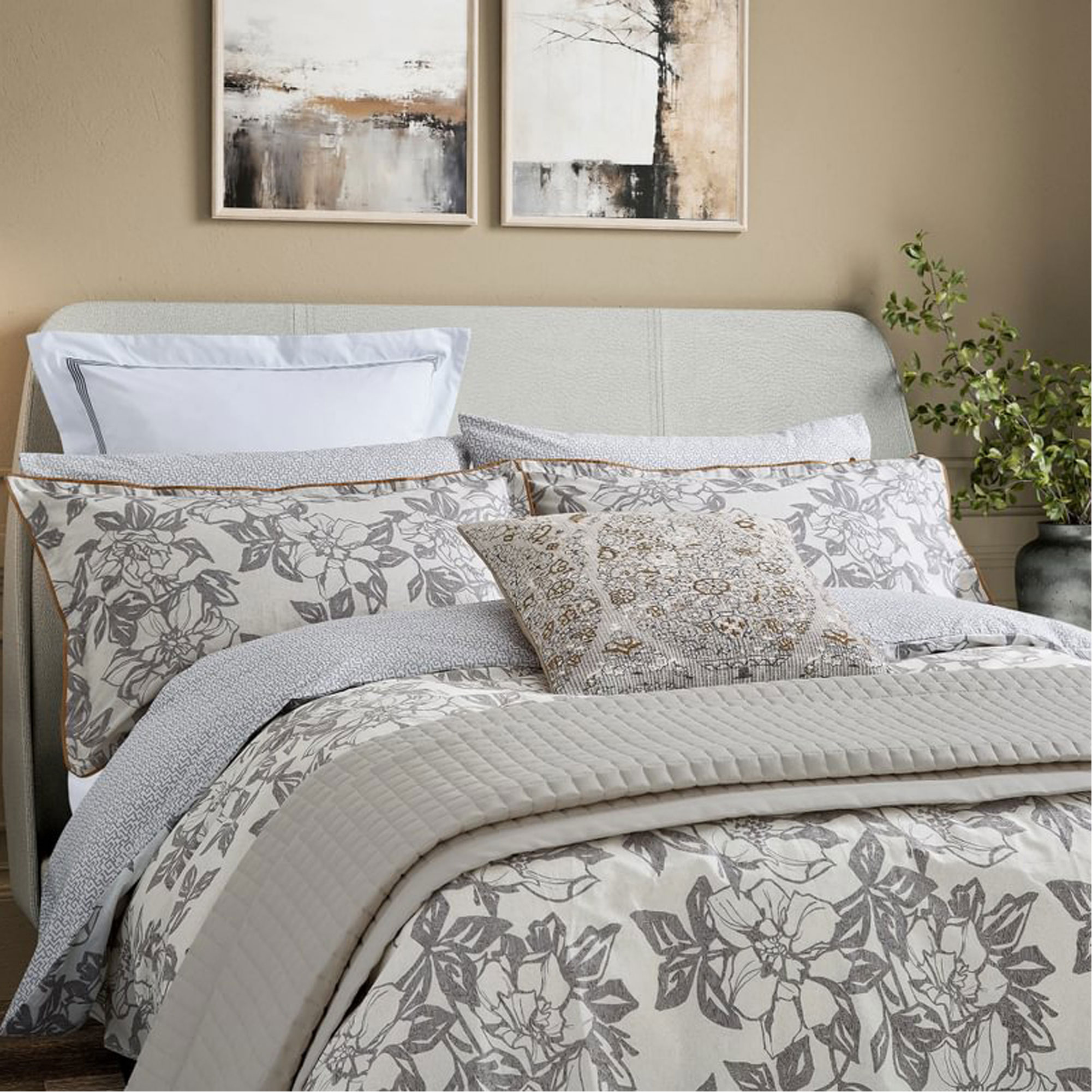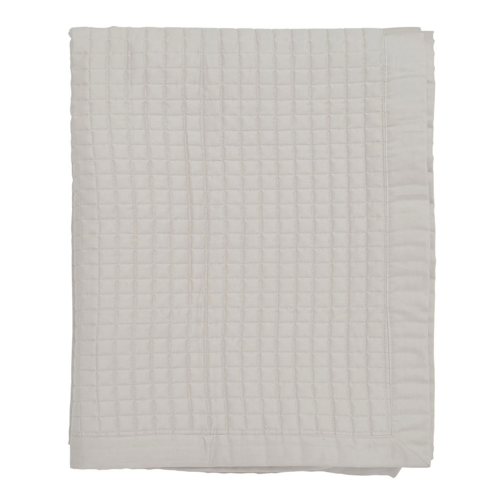 Stripes are timeless, bringing enduring style and sophistication to any bedroom. This design features a multi-width stripe rendered in a neutral palette of charcoal grey, chalk, and tan, printed on smooth 200 thread count cotton percale. The reverse of the duvet cover and coordinating standard pillowcases showcase a delicate pinstripe for a subtle contrast. The linear motif continues with square pillowcases finished with ribbon trim and a beautifully quilted cotton throw. A paisley-patterned cushion, adorned with intricate embroidery, adds the perfect finishing touch to this elegant, layered bed. Duvet Set includes pillowcase(s). These white cotton square pillowcase pairs are adorned with a charcoal grey striped ribbon trim for an elegant finishing touch. Complete the look with the Alba/Maria Cushion and throw in the shade Charcoal, a generously sized quilted cotton throw, perfect for adding comforting layers on cooler nights. Finished with a 10cms bound edge and fully reversible.