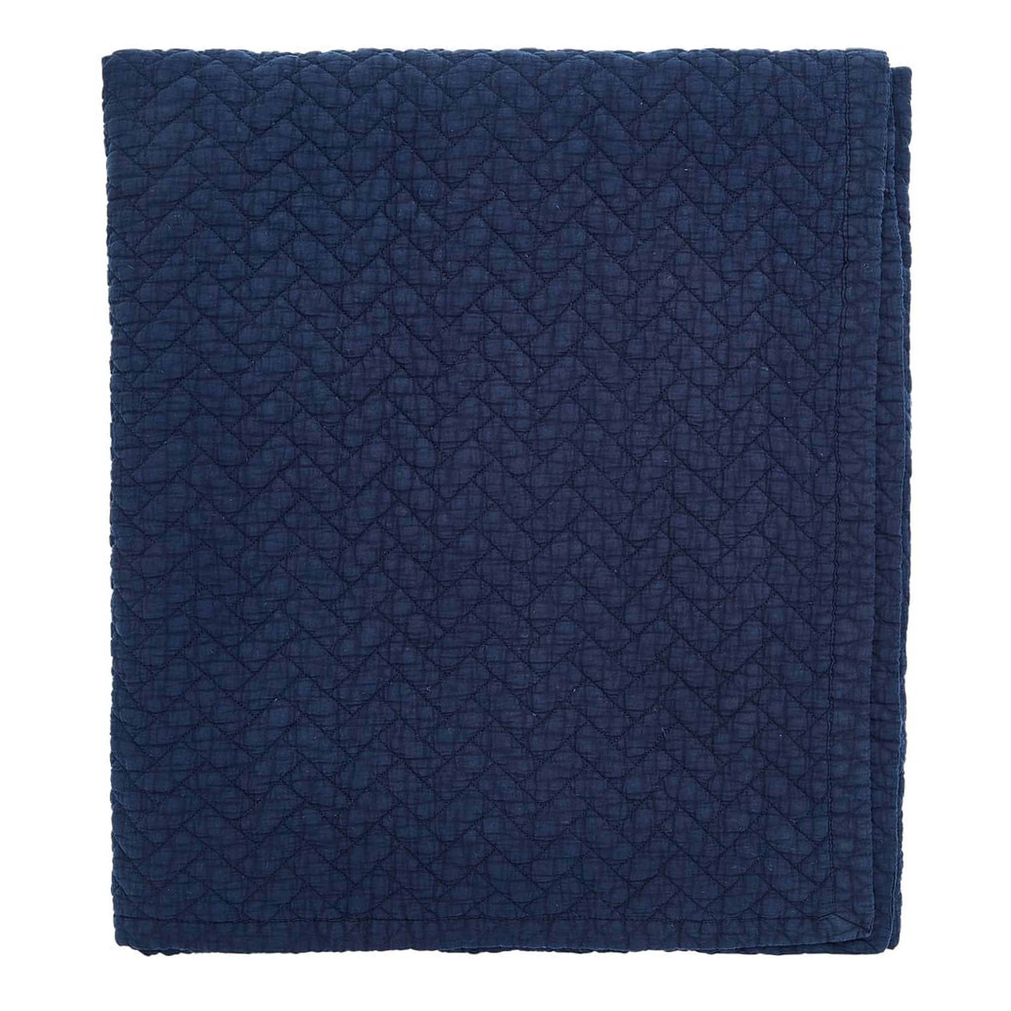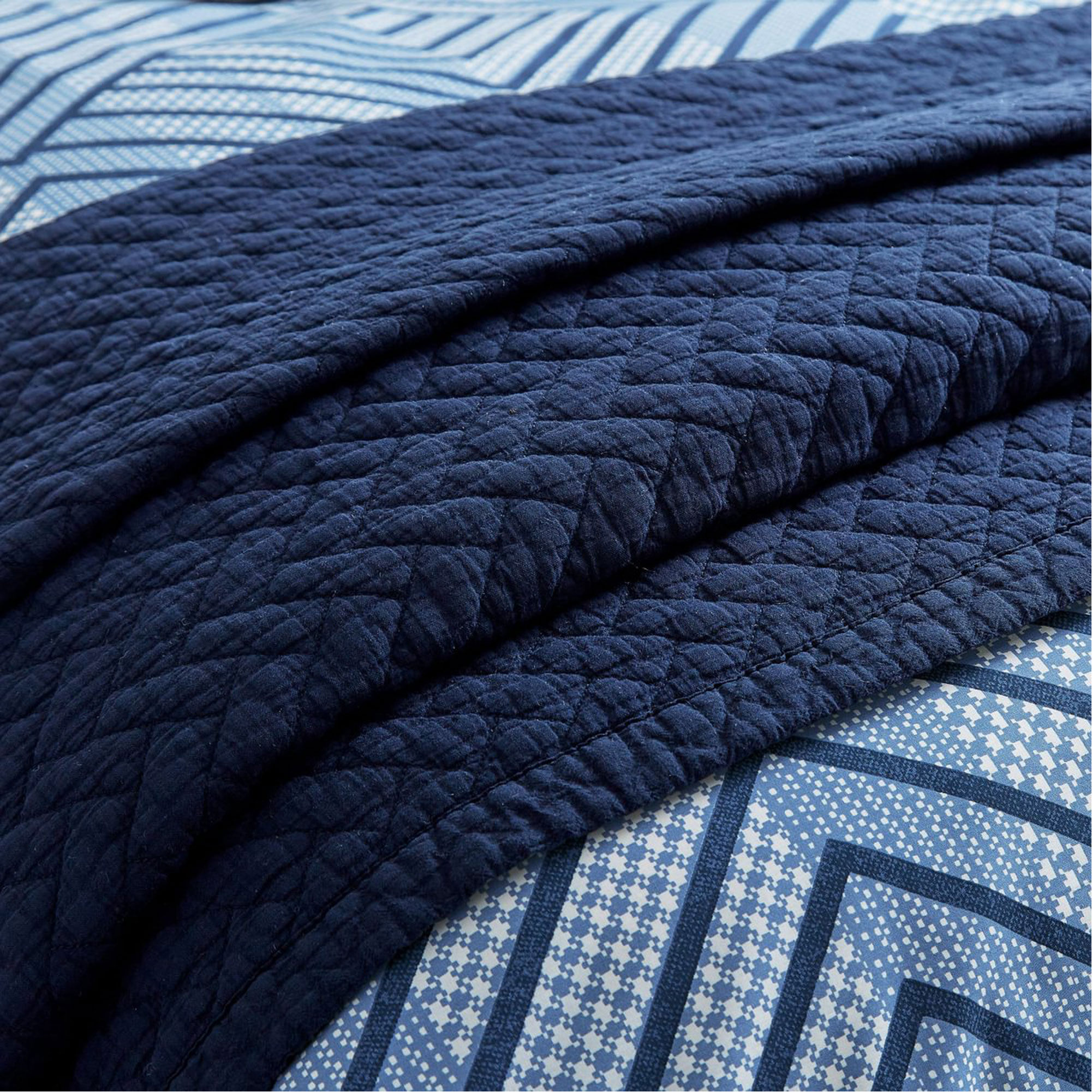 This textured cotton cushion features printed stripes in a charcoal and indigo colour palette, accented with embroidered detailing and a plain reverse. Pair with These square pillowcase pairs offer a simple, elegant way to add pattern to the bed, featuring a double layer of fabric around the outer edges of the pillowcases overlocked in charcoal grey and navy threads. Complete the look a generously sized cotton throw, coloured in deep indigo tones, featuring a quilted geometric tile pattern and plain bound edges.