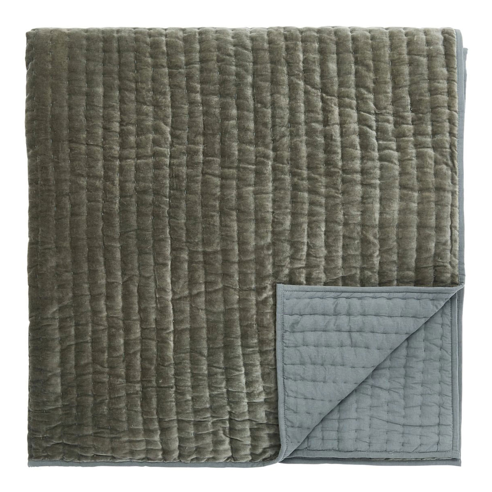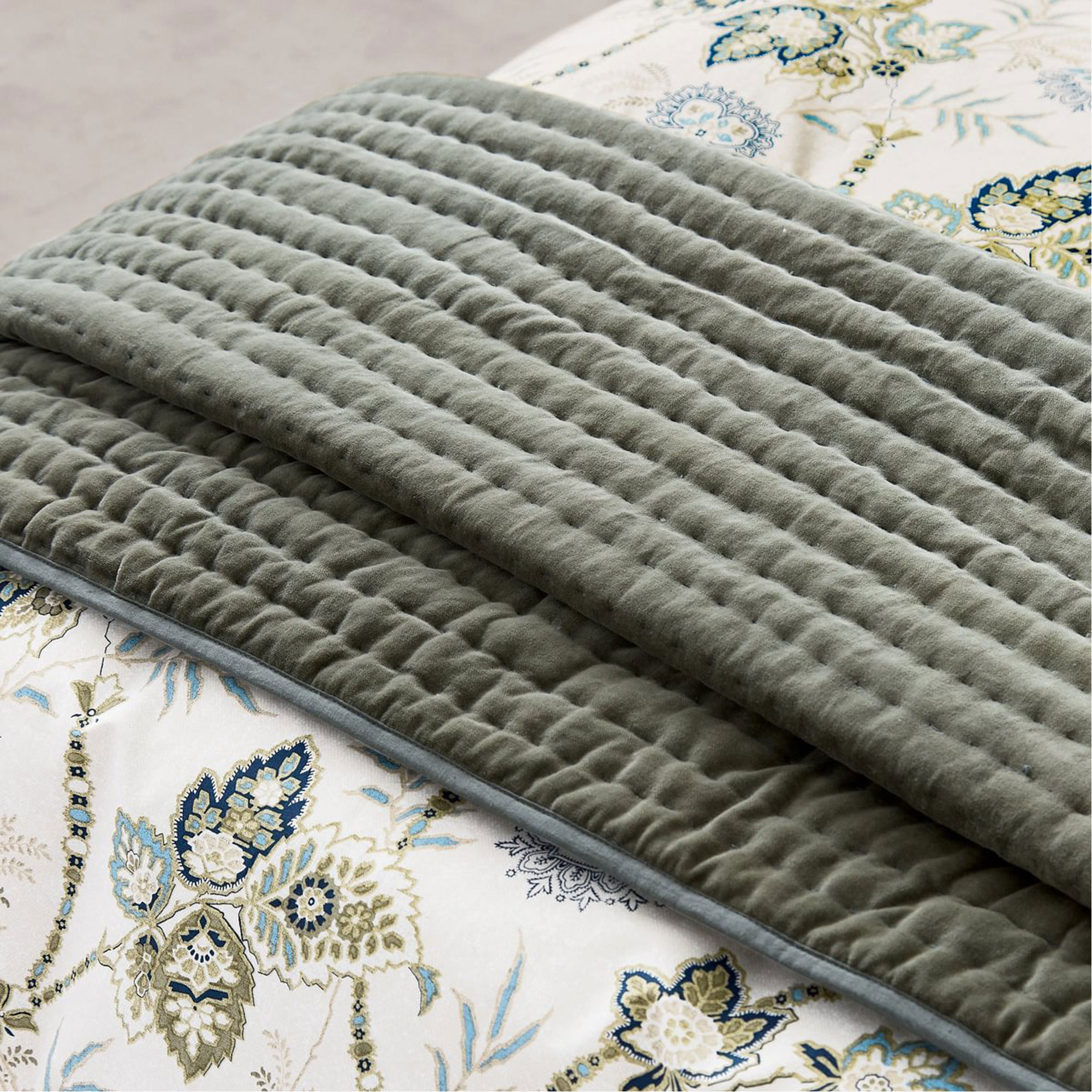 A textured cotton cushion digitally printed with an intricate paisley design with embroidered accents. It has a plain reverse and is finished with a piped edging. Pair with a green velvet sham featuring hand-quilted vertical lines with a green cotton reverse and bound edges. Complete the look with Tactile layers are introduced with the hand quilted green velvet throw, featuring a plain cotton reverse and bound edges.