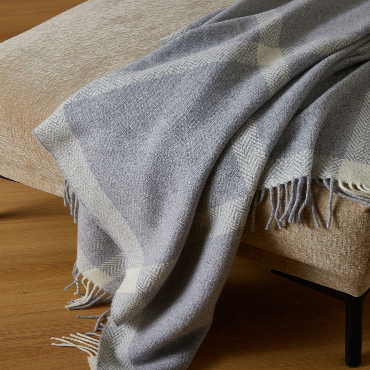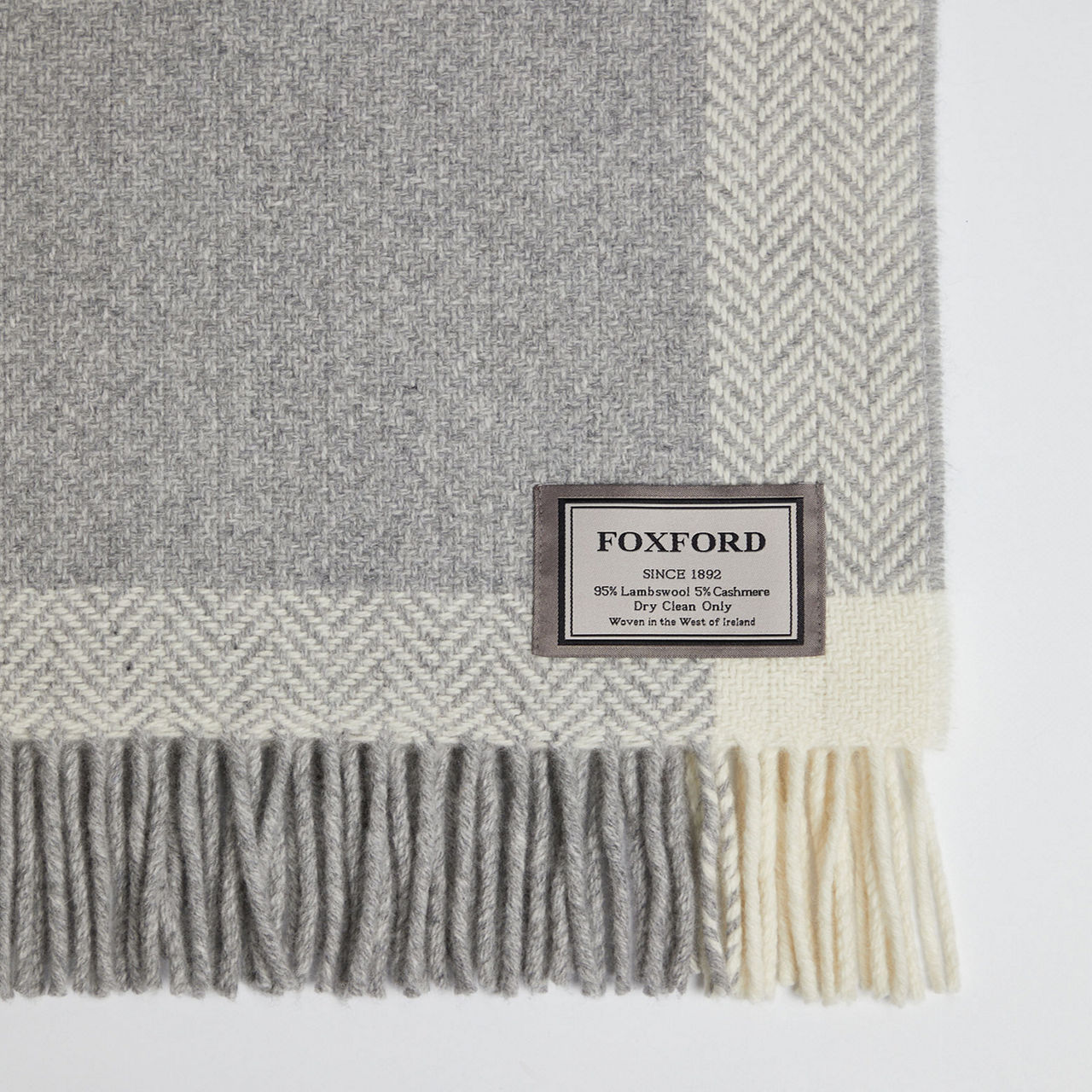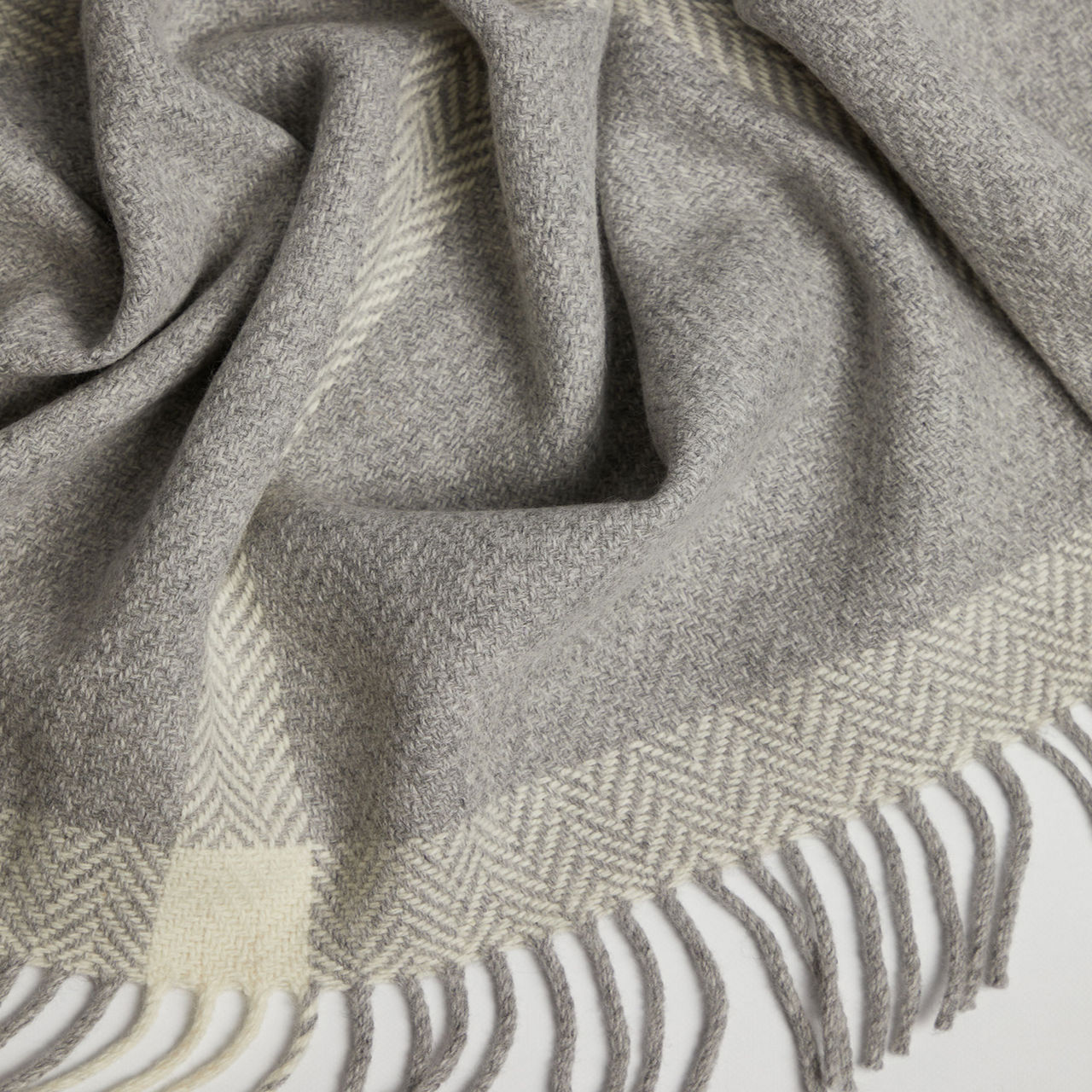 The Dunes throw is a delicately soft fine lambswool and cashmere blend expertly woven by FOXFORD. This design features a traditional windowpane pattern in a stunning palette of white and pearl grey and is finished with a rolled fringe trim.