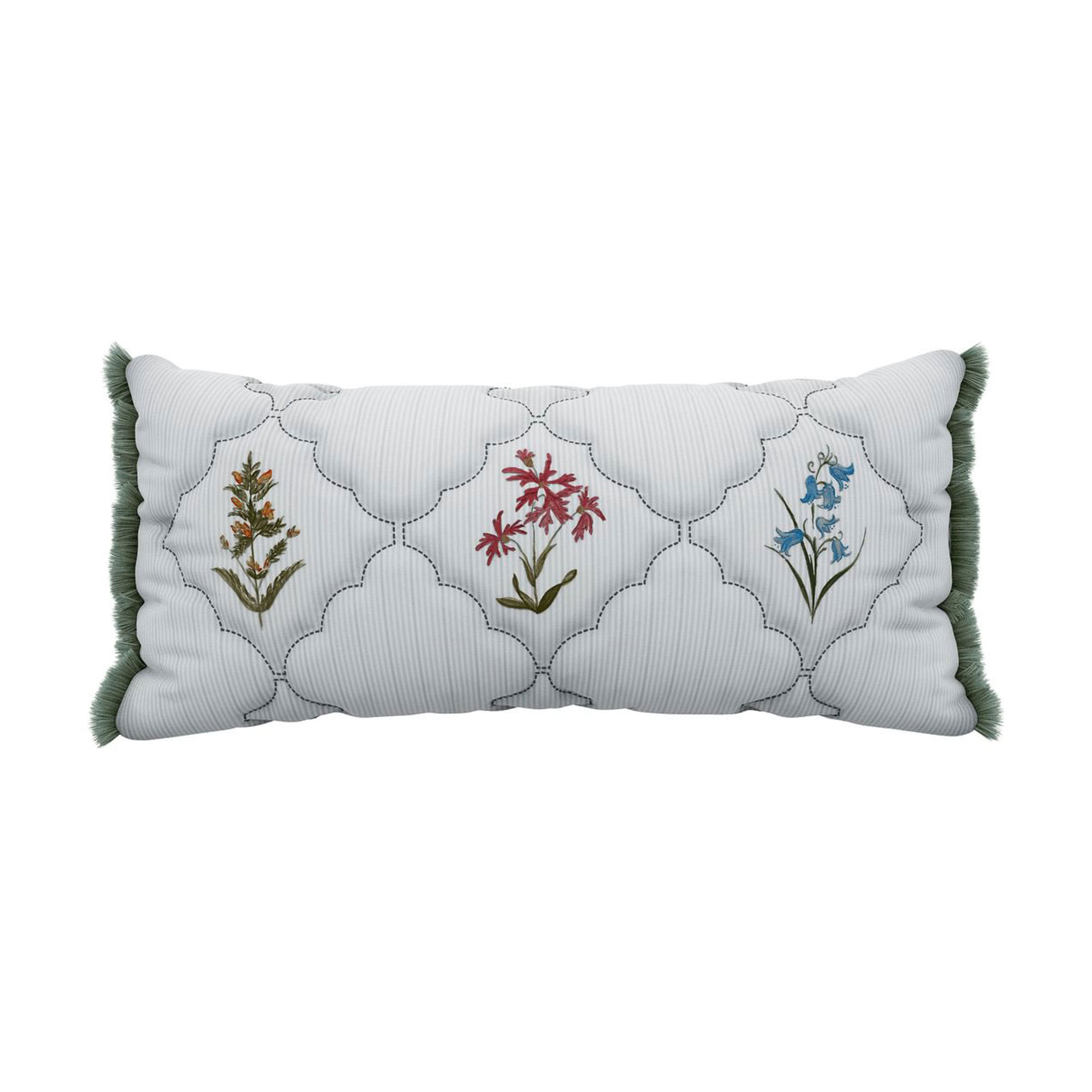 Delicately rendered in a botanical trellis style, this design draws from the wildflower meadows of the National Trust’s Brockhampton estate — where bluebells, pyramidal orchids, wood anemones and more bloom in quiet abundance. This beautiful bedding is made from 180 thread count cotton percale and features a fine vertical striped reverse. The co-ordinating pillowcases are finished with charming ties along the outer edge, for a thoughtful flourish. Duvet Set includes pillowcase(s). Complete the look with The Spring Meadow cushion (70x30cms) features delicately embroidered flowers contained within a quilted trellis pattern, inspired by the wildflower meadows of the National Trust’s Brockhampton estate — where bluebells, pyramidal orchids, wood anemones and more bloom in quiet abundance. Accented with fringe detailing on each end.