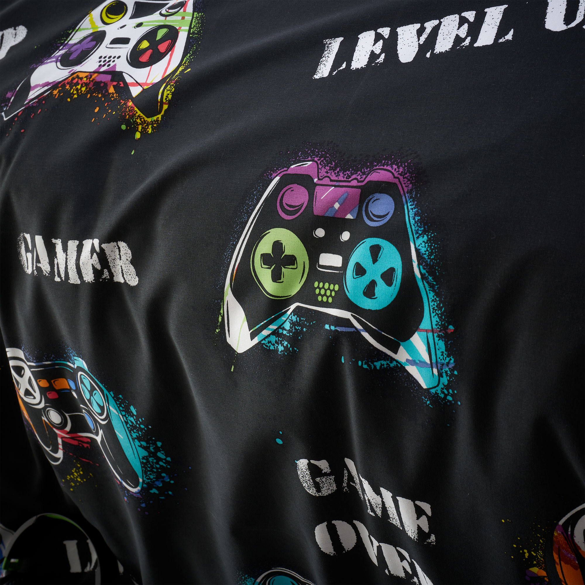Level up your bedroom. Finish their room with this fun fully reversible games controller bedding set, flashes of neon give this set an extra modern look. Created from easy-care recycled polyester and soft cotton, blended for everyday use. Add the matching fitted sheet to complete the look. Duvet set includes pillowcase(s)