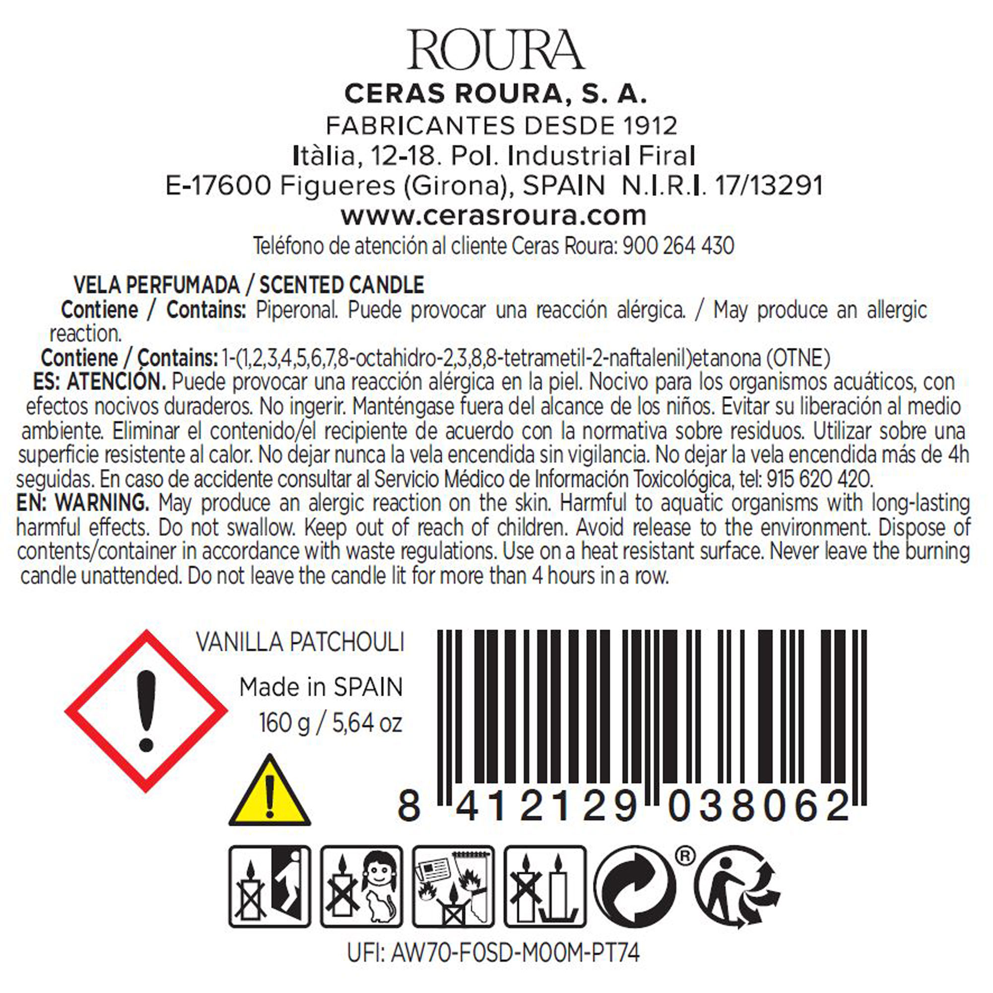 A sweet and mysterious scented candle from Roura that offers a sweet vanilla aroma mixed with patchouli, where the notes of ginger give a sophisticated touch and the intensity of Benzoin resin brings a sensuality that crowns this intriguing perfume.
