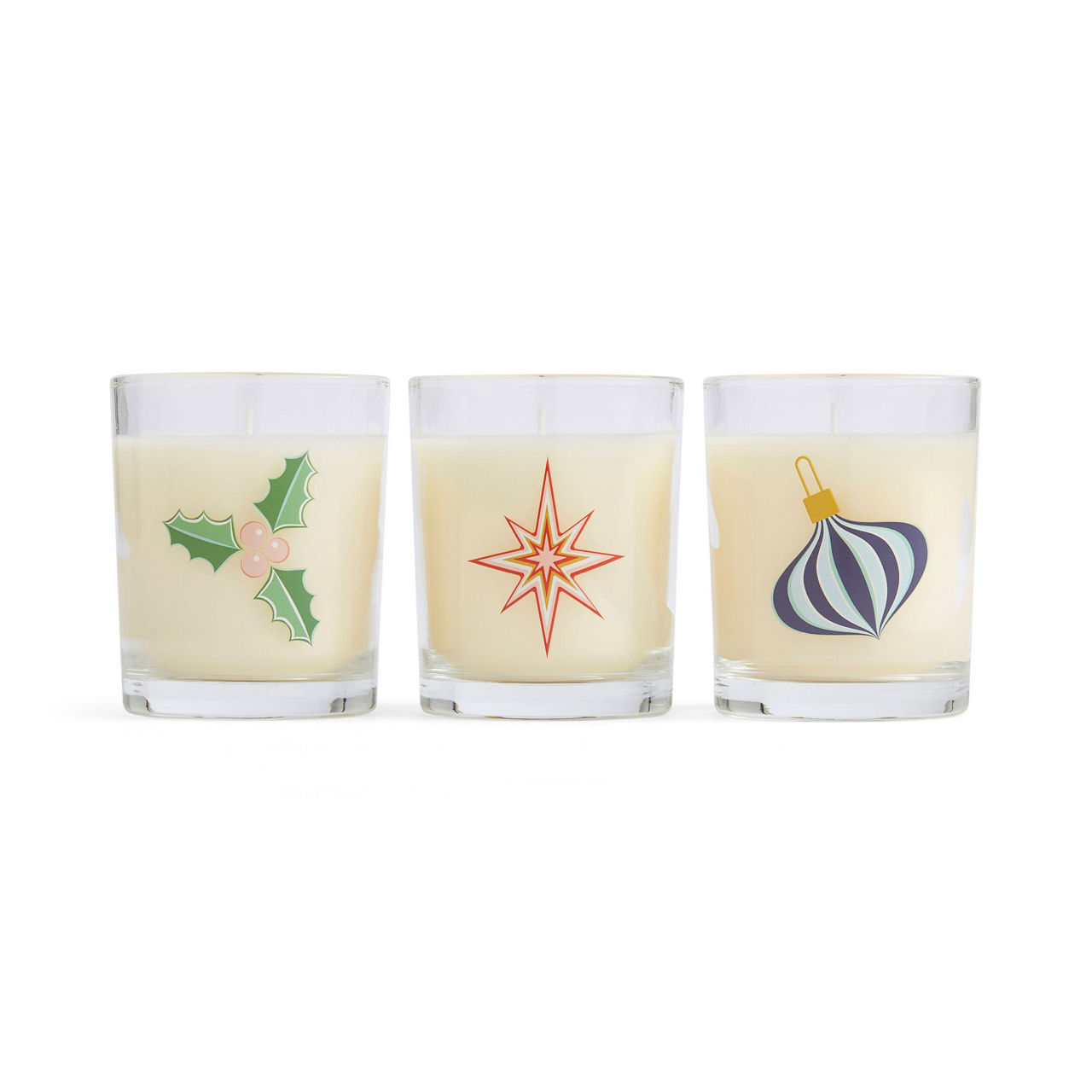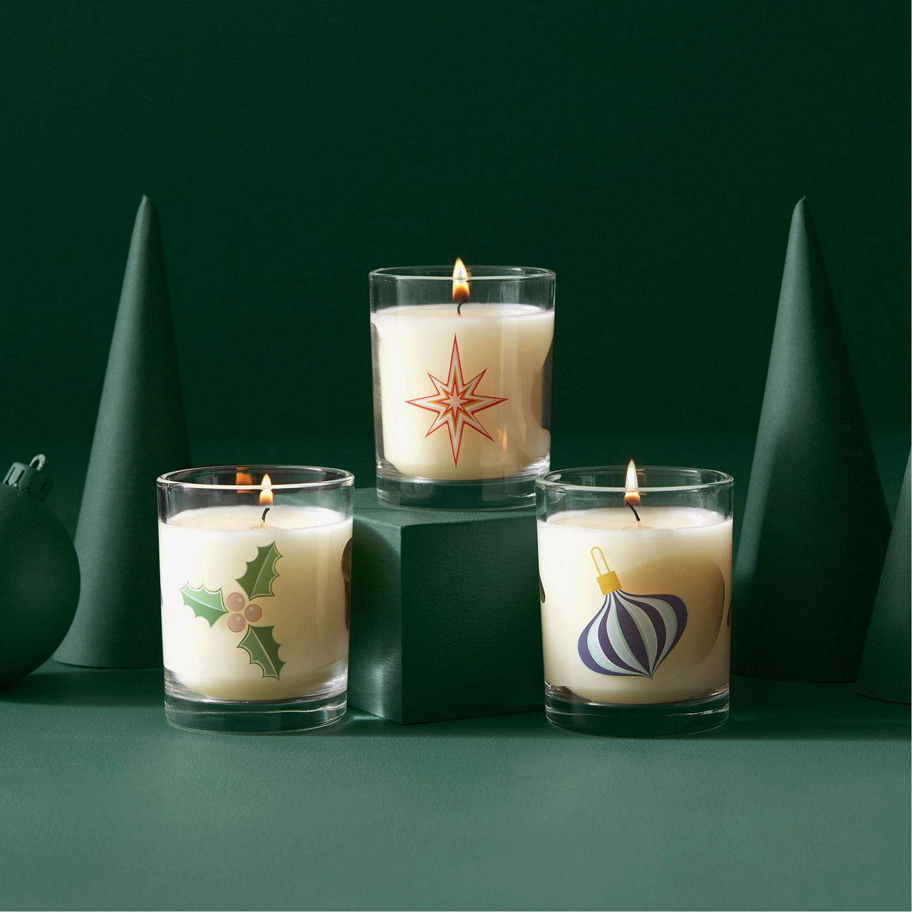 - A trio of scented votive candles—Merry & Bright, Glitz & Glam and Fir & Frost—each offering up to 28 hours of burn time