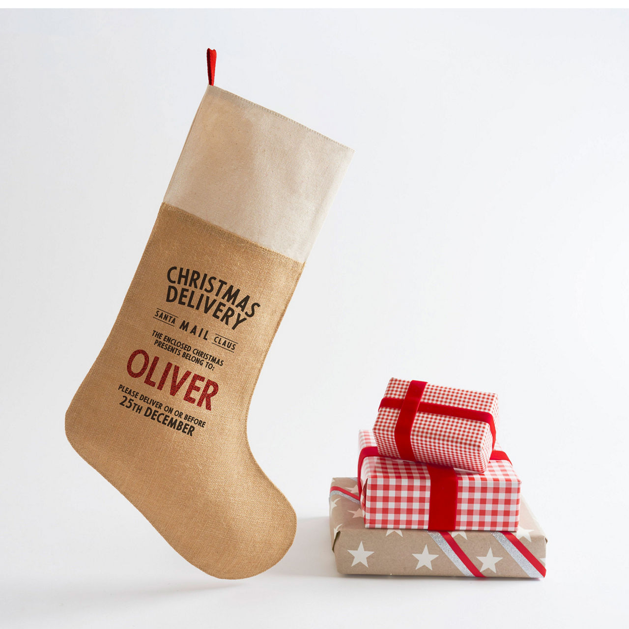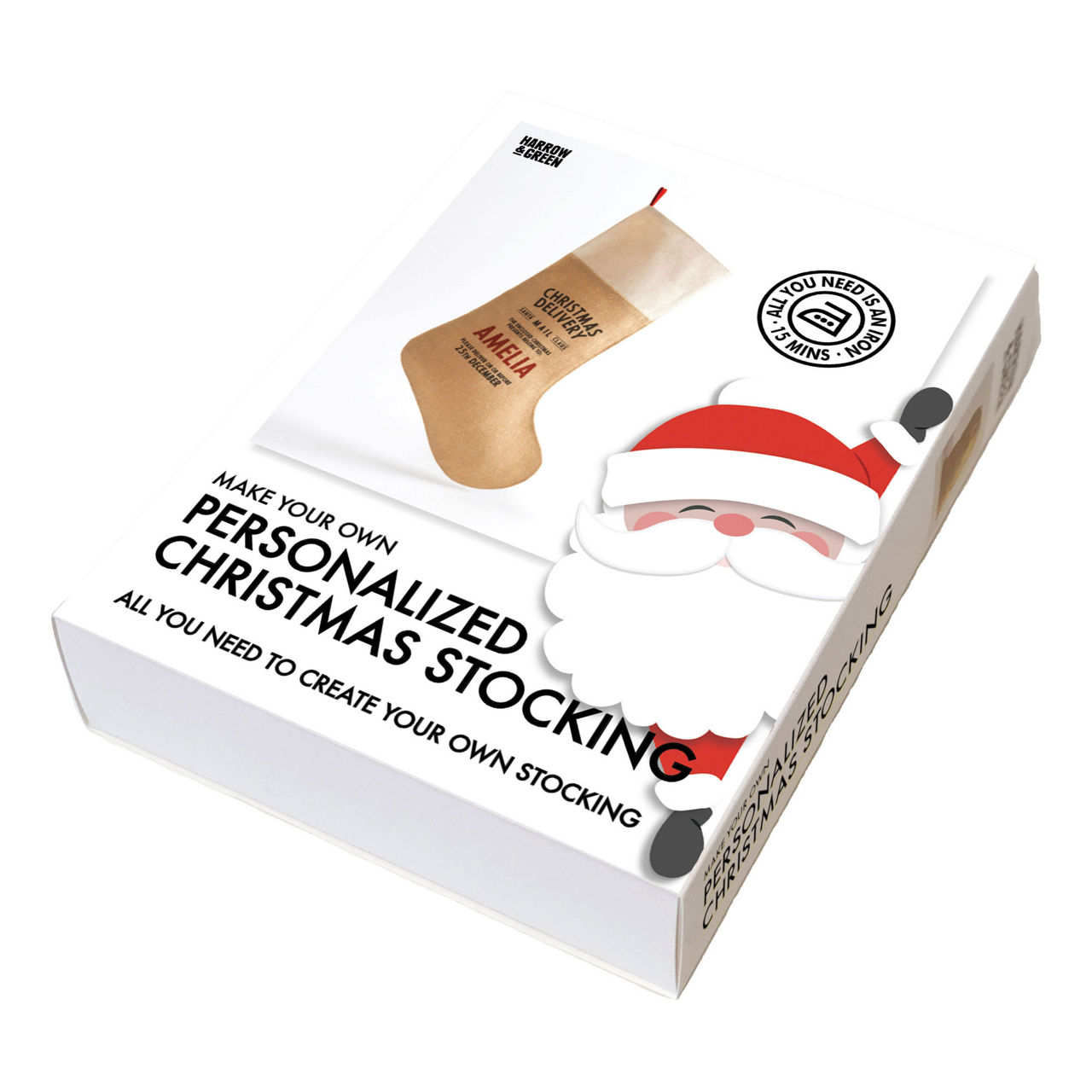 A fabulous boxed kit which gives the you everything you need to personalise a Christmas stocking at home - all you need is an iron.The personalisation process is very simple and will only take around 15 minutes. Each kit contains the following:- High-quality printed hessian Christmas stocking with a cotton cuff - Selection of red glitter iron-on letters (selected to ensure 95% of all names can be spelled)- Letter placement template (to help you line-up the letters on the stocking)- Instruction sheet showing how to personalise the stocking