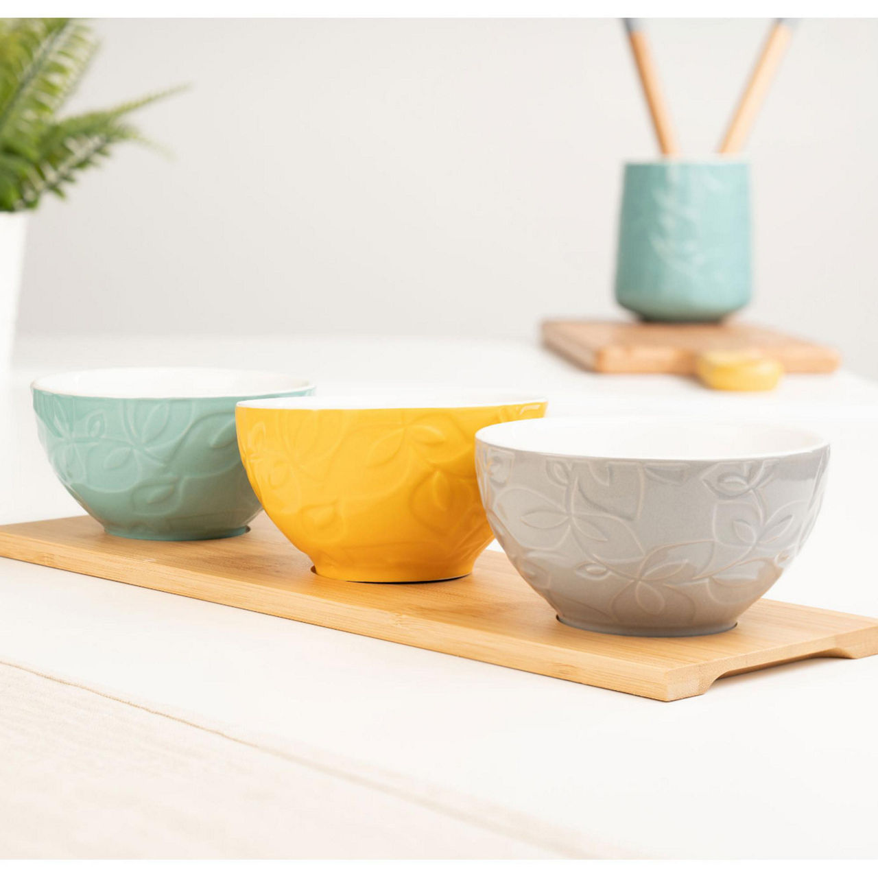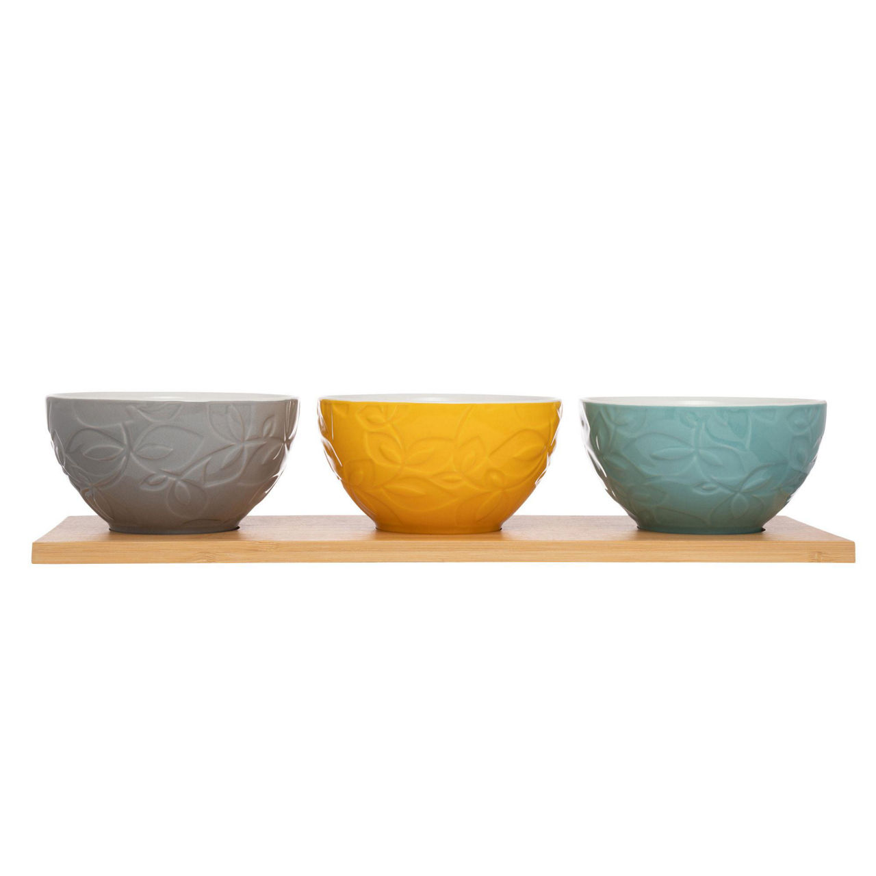 Entertain in style with the Catherine Lansfield Inga Set of 3 Dip Bowls with a Bamboo Platter. Perfect for serving your favourite dips, snacks, and sauces, perched atop their bamboo base to keep them neat and tidy on your table. Dishwasher safe for easy clean-up (not the platter).