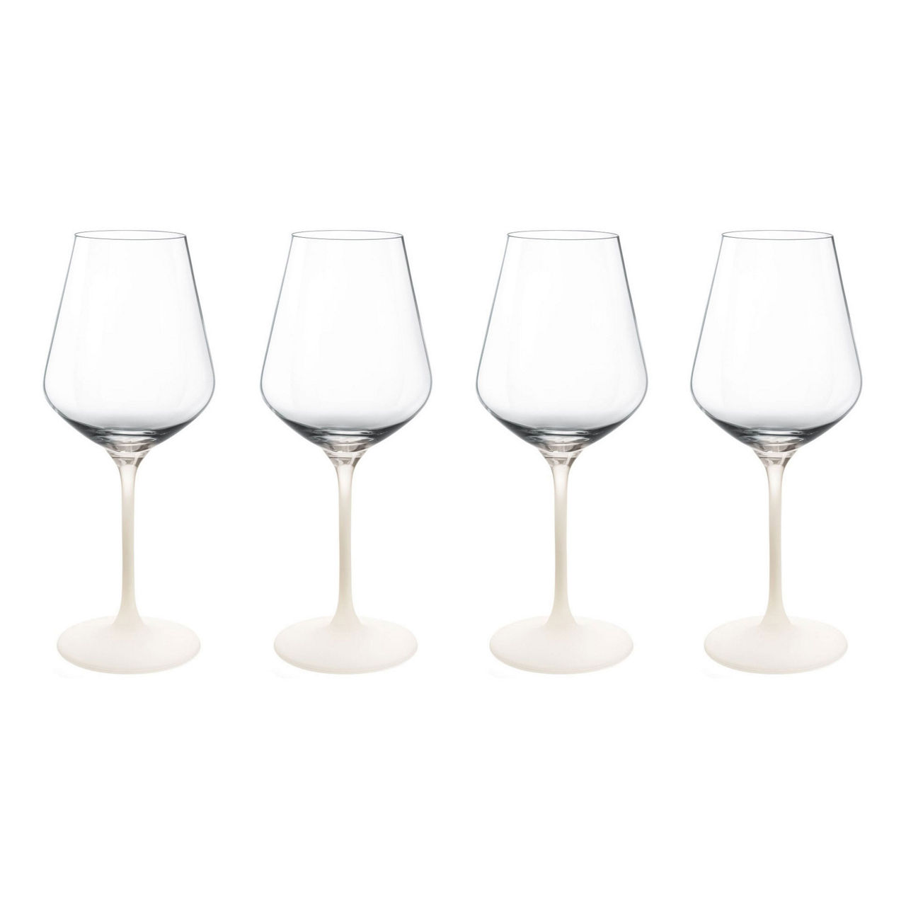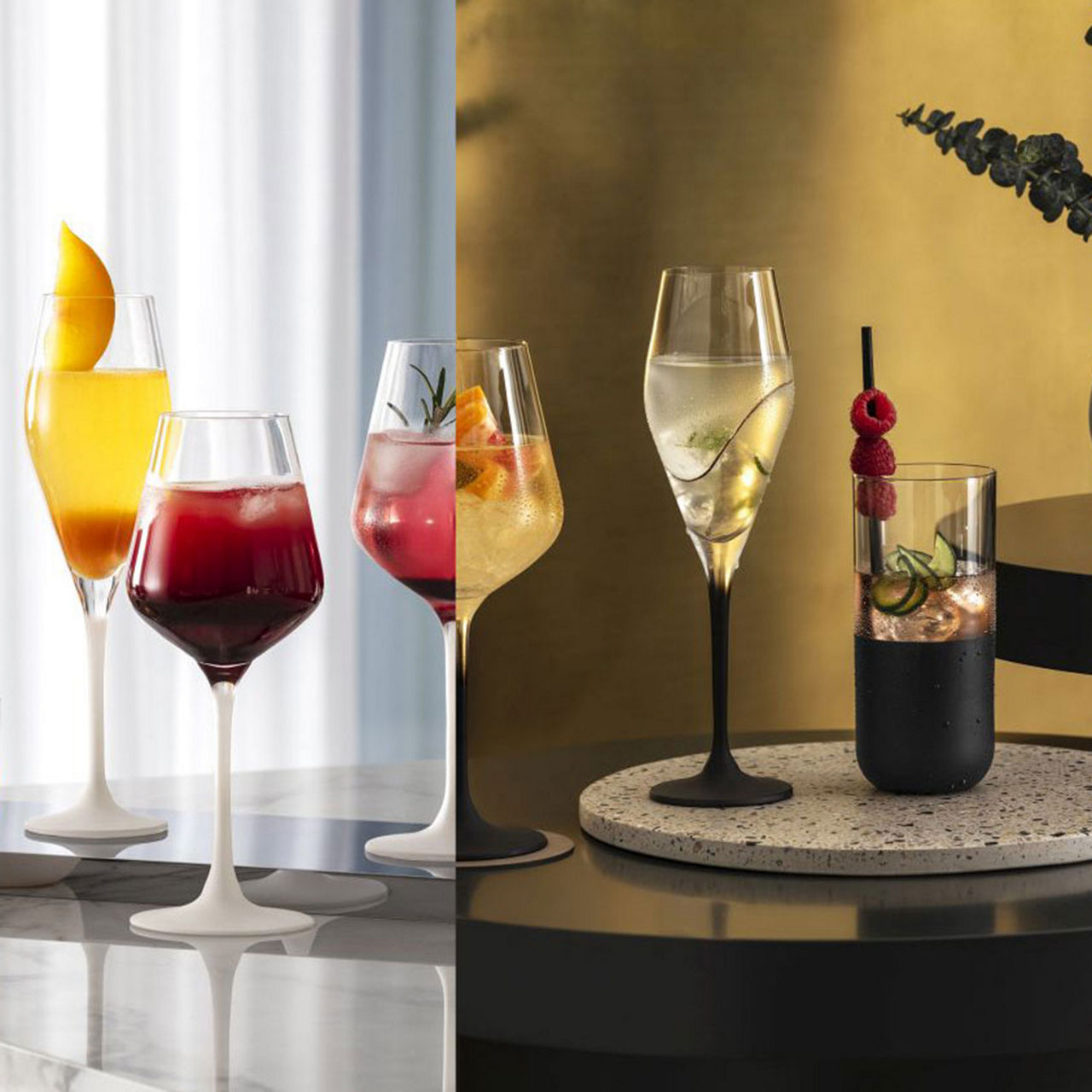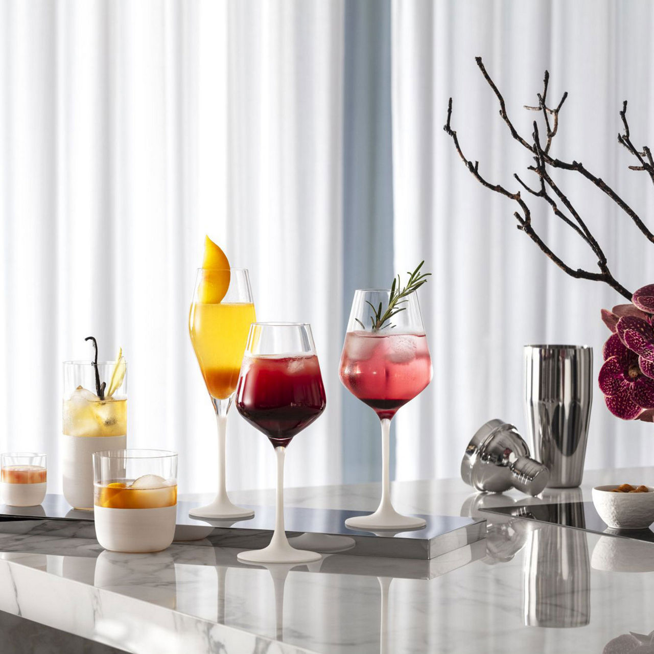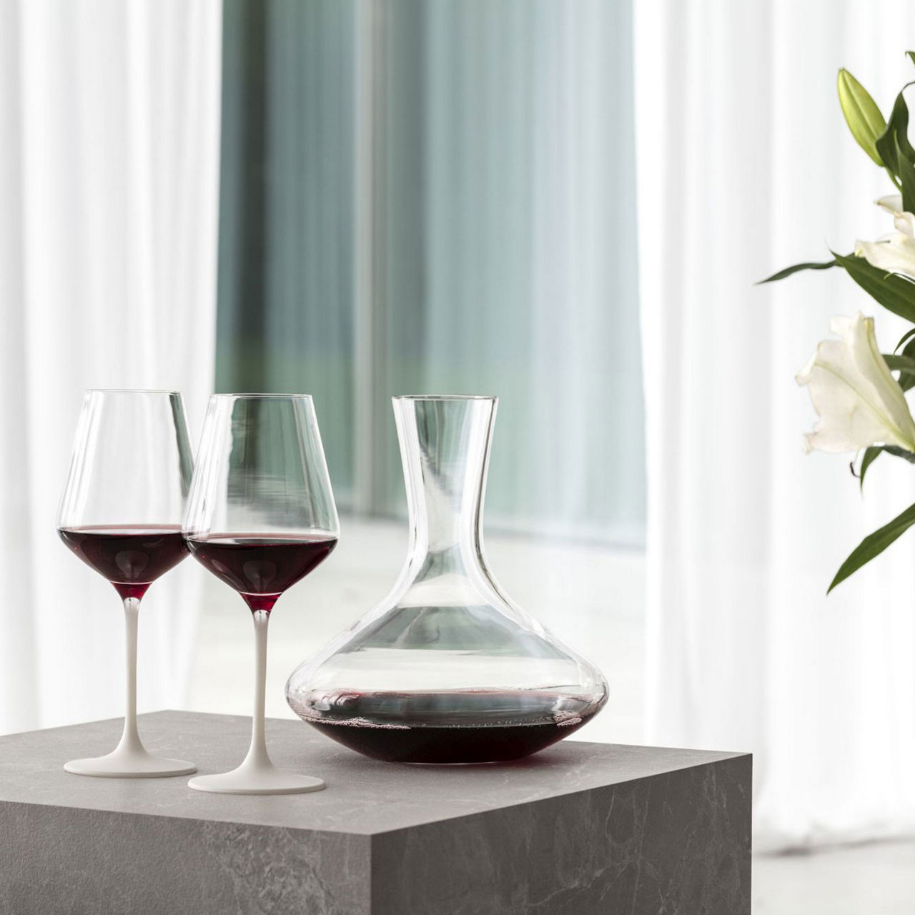 The Manufacture Rock glass collection from Villeroy & Boch impresses with its sophisticated design featuring an exquisite matt white finish in premium crystal glass. The red wine goblet set from the collection consists of four wine glasses with a special tactile surface that feels very comfortable to hold. The glasses impress with their matt white stem, creating an elegant look on any table.
