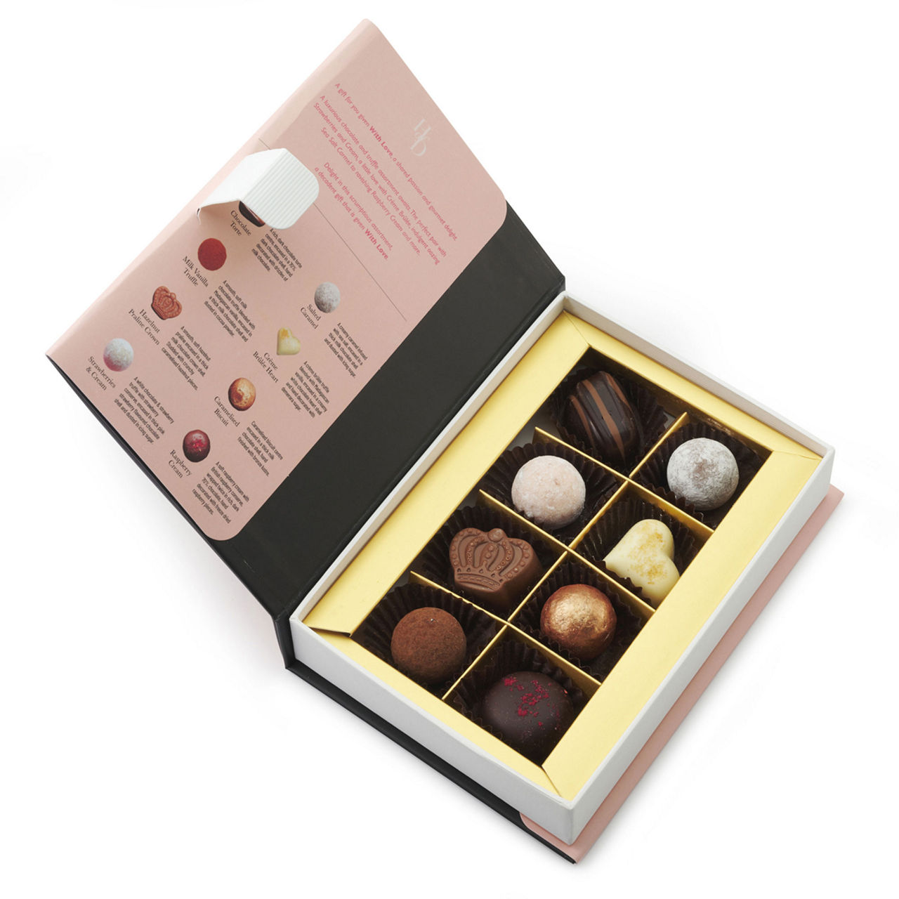 - Chocolate Torte, Milk Salted Caramel, Strawberries & Cream truffle, Crème Brulee Heart, Hazelnut praline crown, Caramelised biscuit truffle, Milk vanilla truffle, Raspberry cream