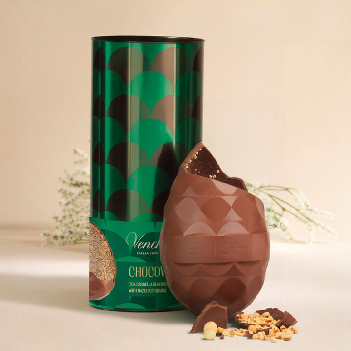 - Gianduja chocolate egg made with antica ricetta, piedmont hazelnut crumbs, inspired by iconic chocoviar.