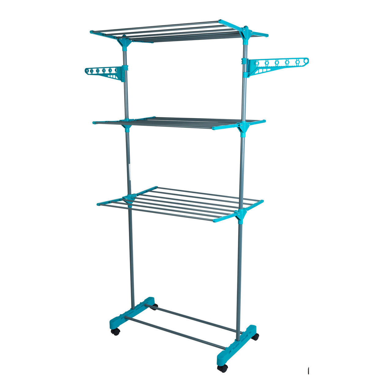 With 3 tiers, 2 side wings and a turquoise finish, the airer is perfect for family laundry and can be folded down to save space. The airer has a huge 15 metres of drying space, so you can air a load of laundry. Also has wheels so is easily transportable