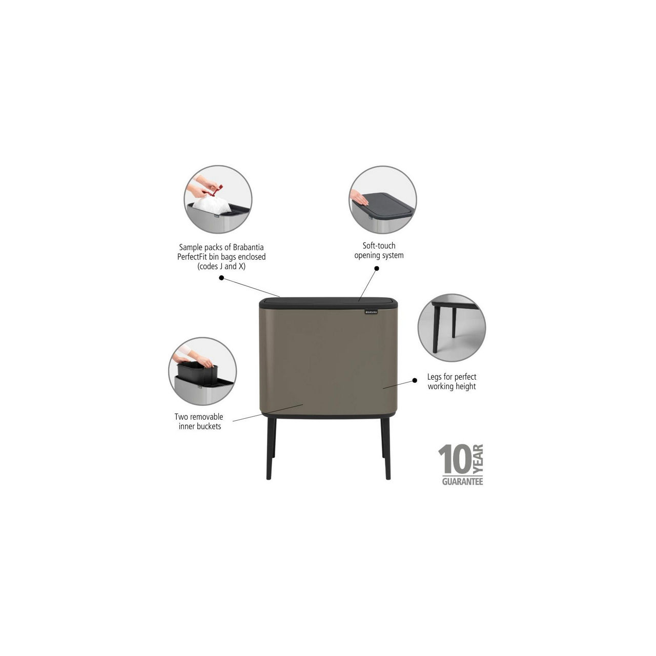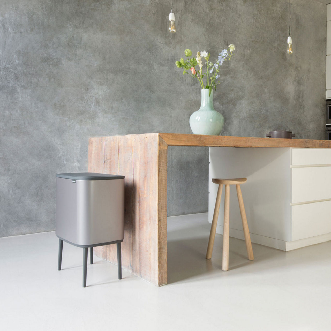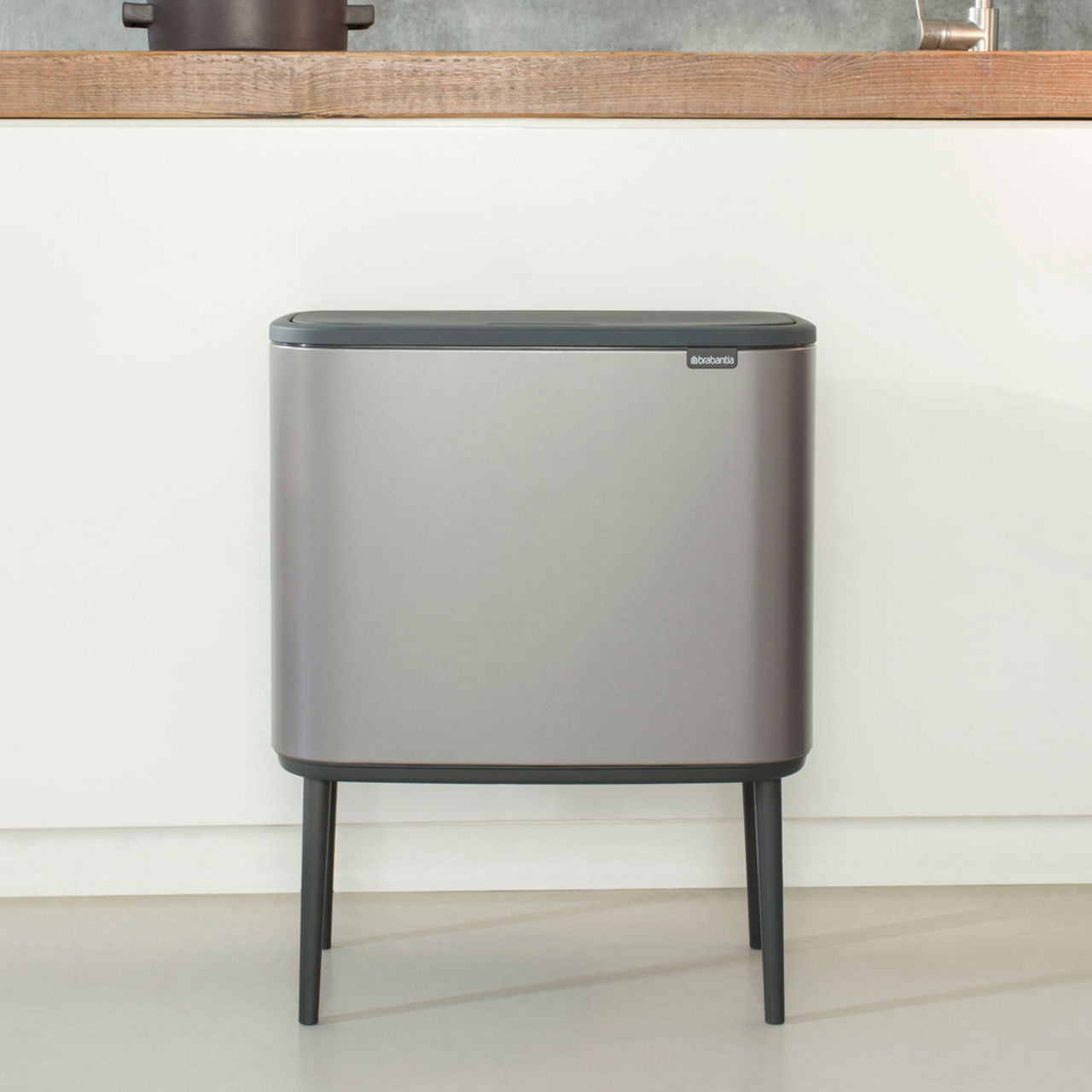 Looking for a beautiful solution for waste separation? This 23 + 11 litre Brabantia Bo Touch Bin both looks like a piece of furniture and has all you need for easy waste separation. It has two removable inner buckets for two kinds of waste, fits perfectly against a wall, and is very stable thanks to its adjustable non-skid legs. The soft-touch opening makes for easy and light operation at the touch of your hand. Now that's separating in style!