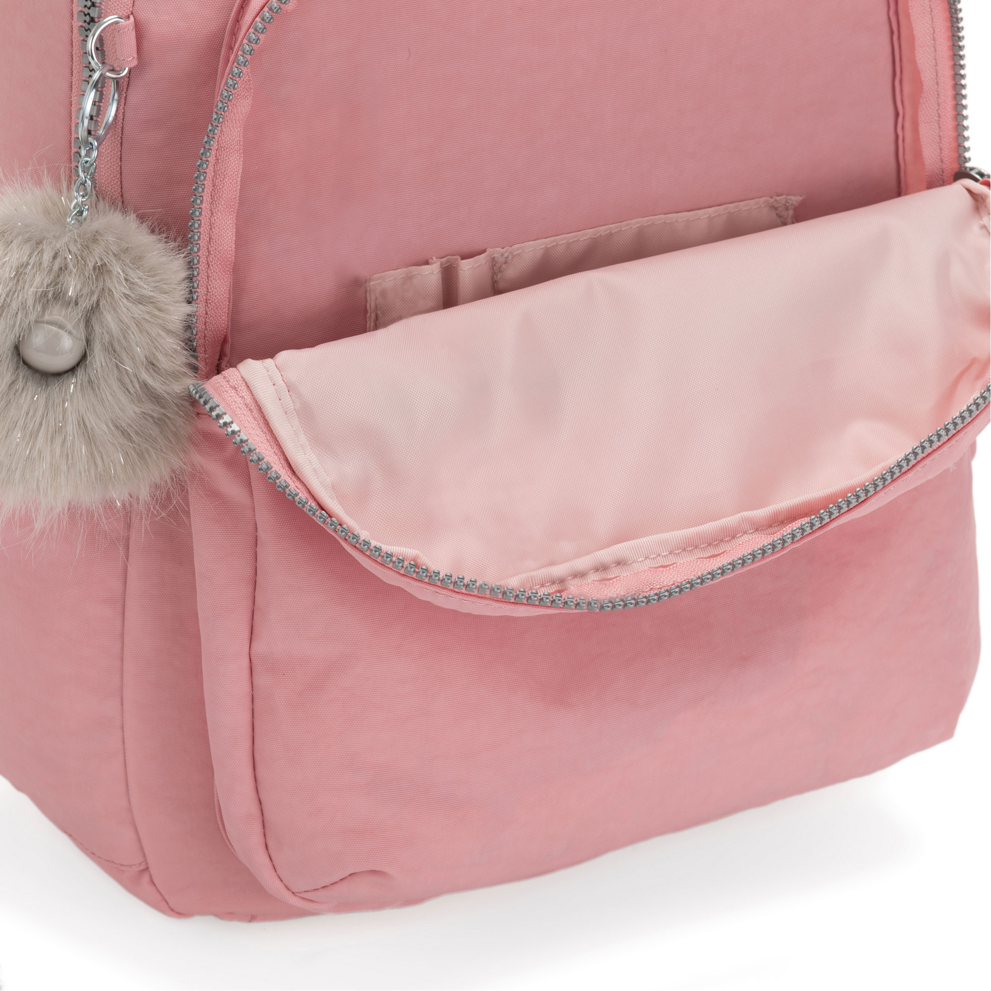 - Padded adjustable straps, top carry handle, three zipped front pockets, two elasticated open side pockets, round Kipling logo, signature monkey keyring, key fob