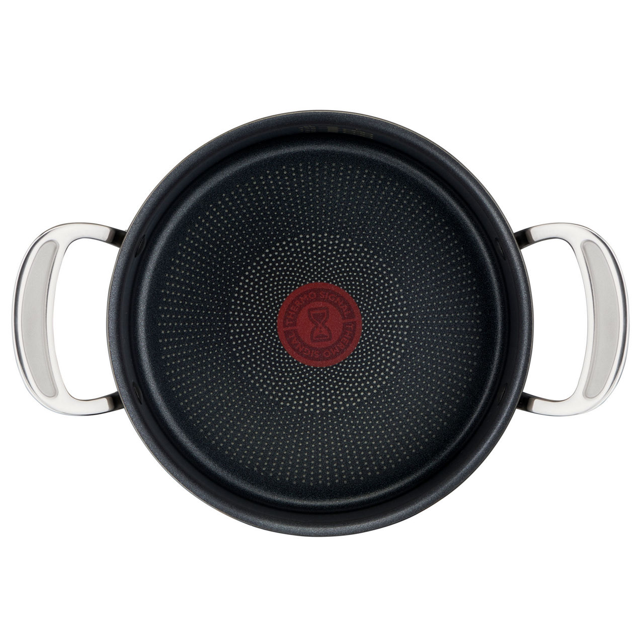 handles with silicone inserts provide a secure grip and more comfortable cooking experience. To really up your cooking game, all pots and pans now feature our new Thermo-Signal™ technology: when the hourglass
