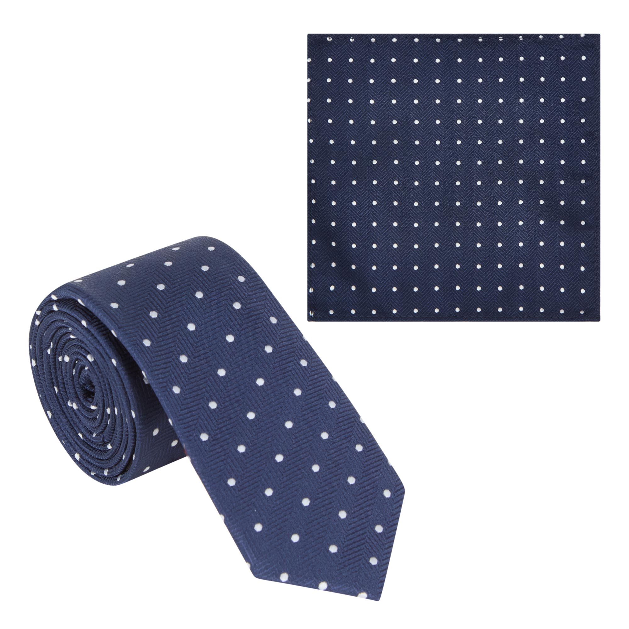 • Two-piece set, tie with pointed tip, pocket square, polka dot pattern, tonal stitching