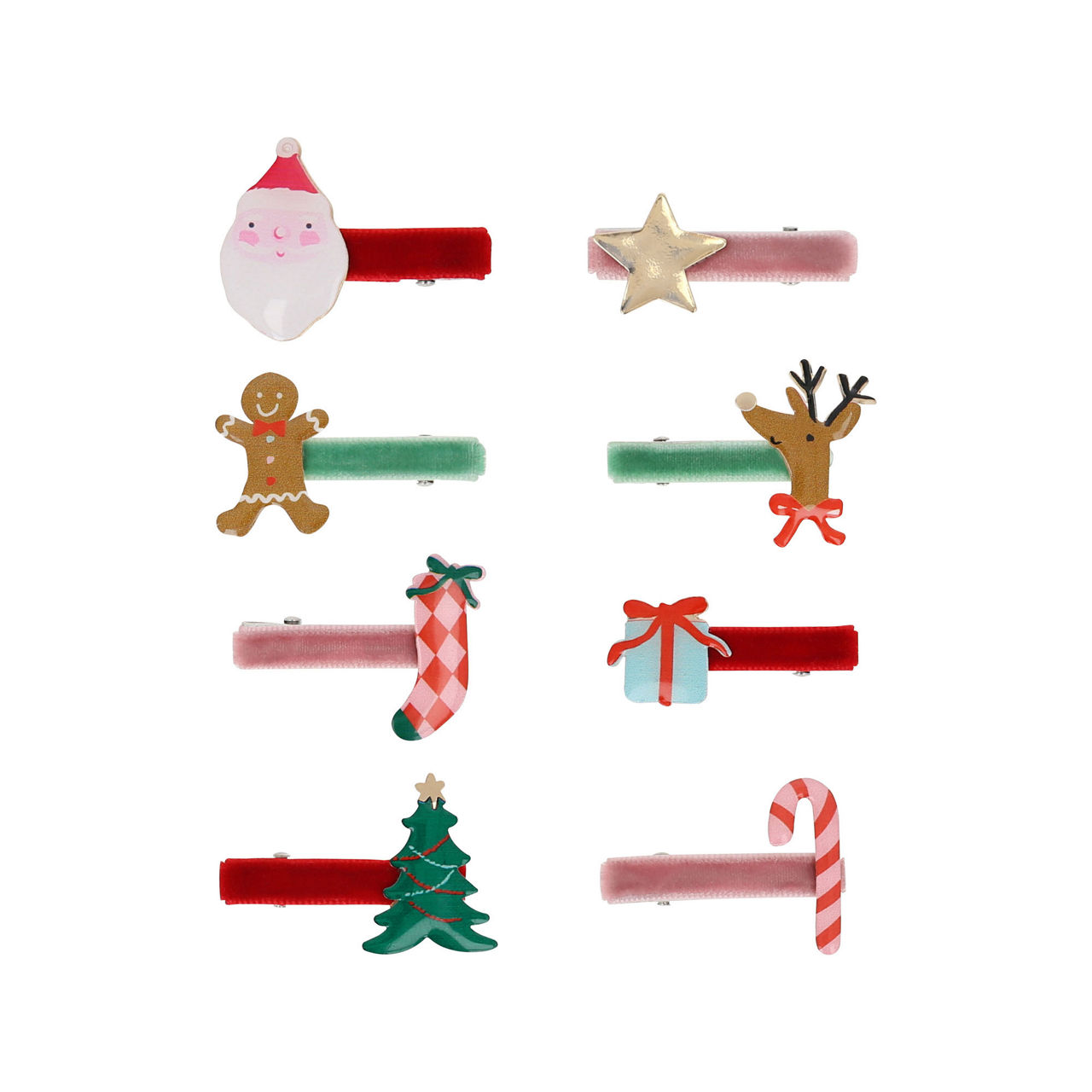 Make your hair look jolly and bright in seconds with these festive hair clips from MERI MERI. Wear a few, or wear them all for a statement look! They're beautifully designed and crafted with luxurious velvet ribbons and fun icons. They're perfect to wear to parties or everyday throughout the season, to gift as stocking fillers, or to pop into party bags.