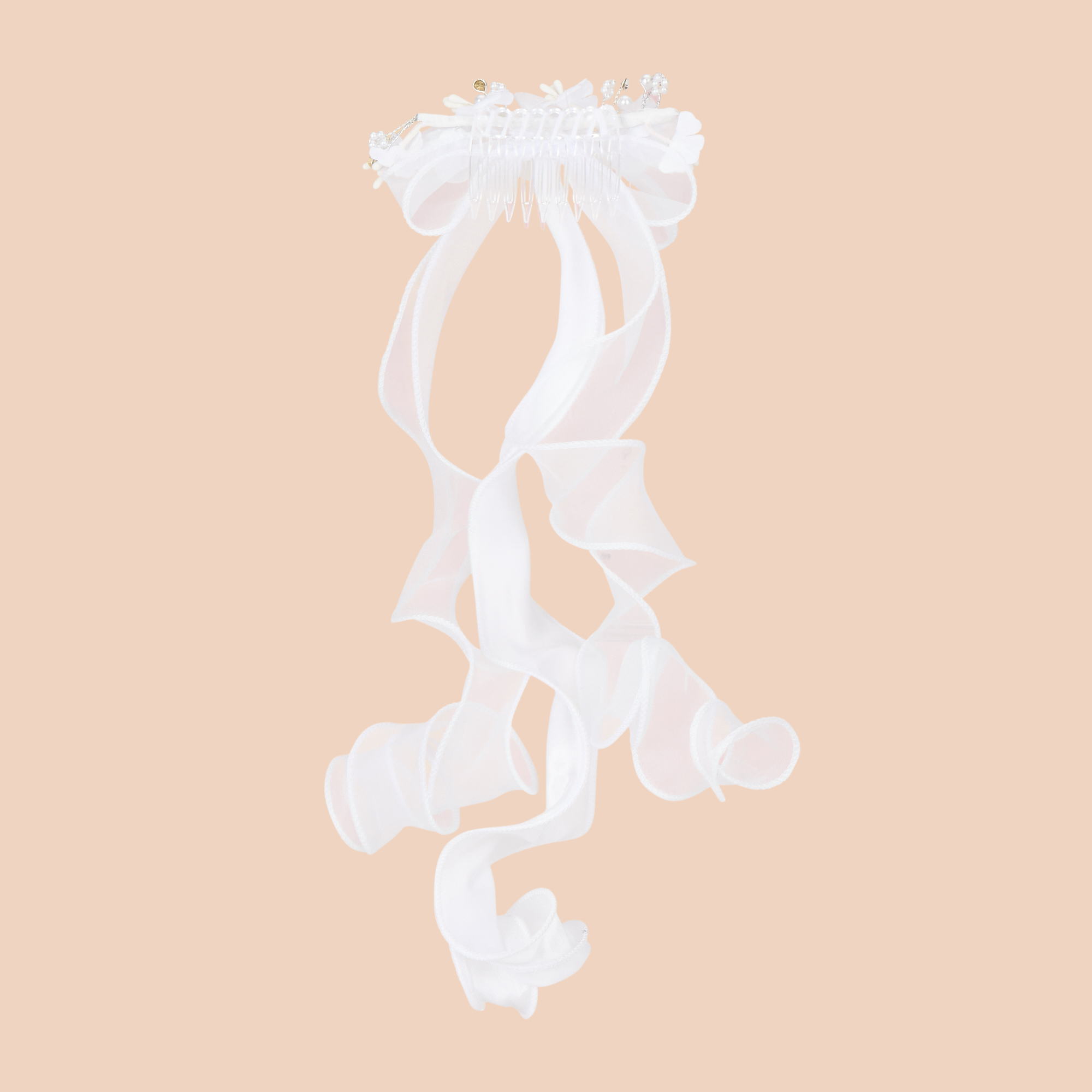 - Large bow design, comb in style, floral appliqué detailing, diamanté embellished, elongated ribbon, tonal piping