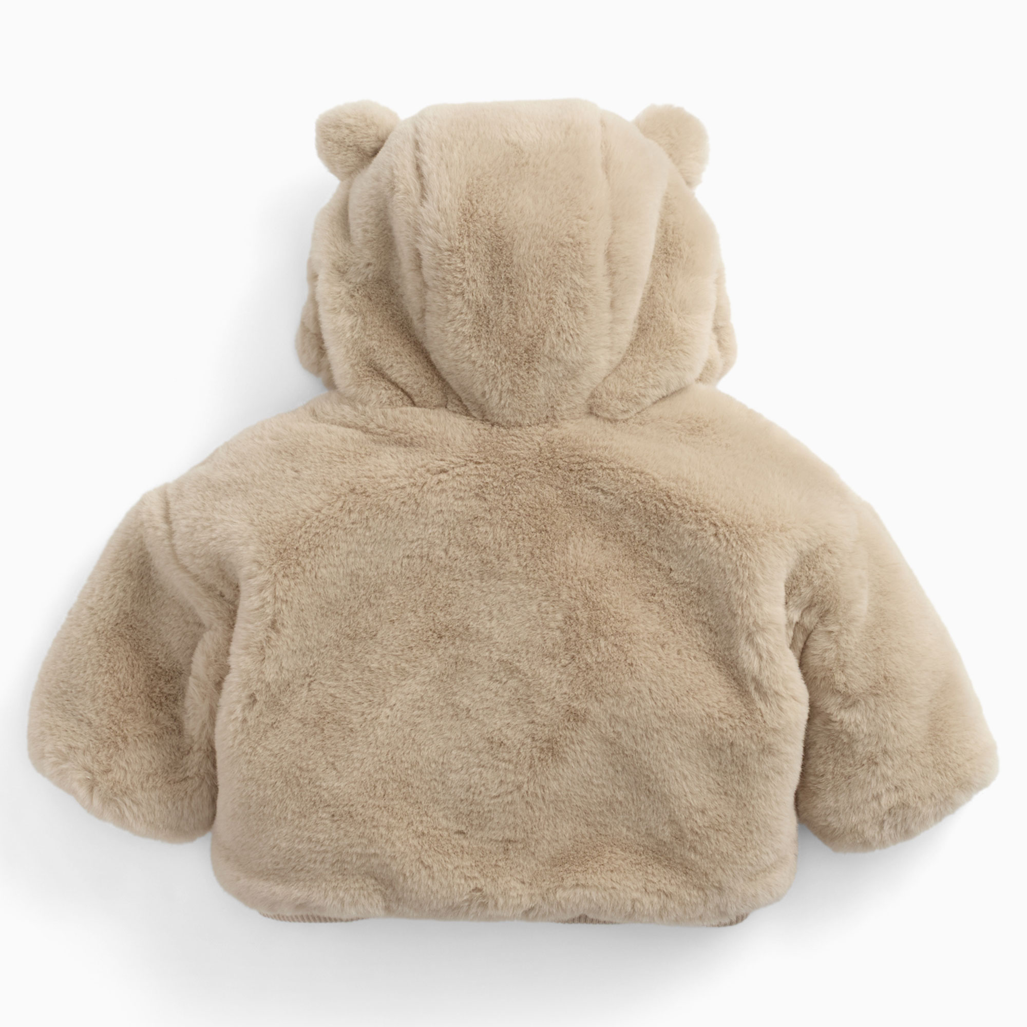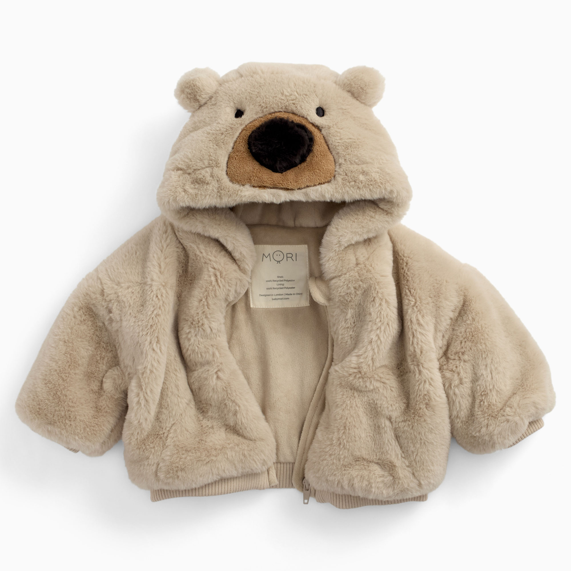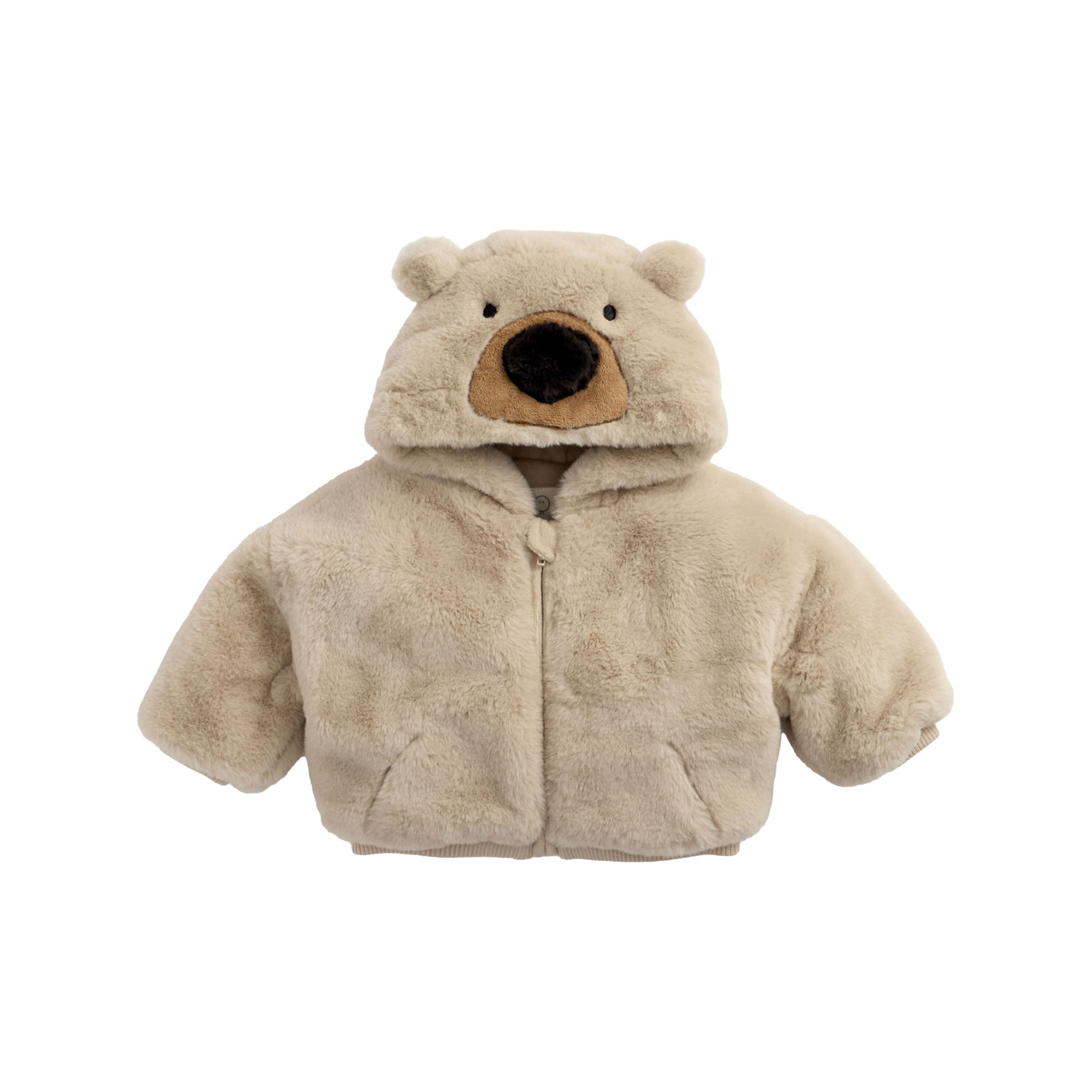 - Faux-fur, bear hood design, soft fleece lining, zip fastening, embroidered face and ears, elasticated cuffs and hem, internal popper cuff straps for attaching mittens (not included)