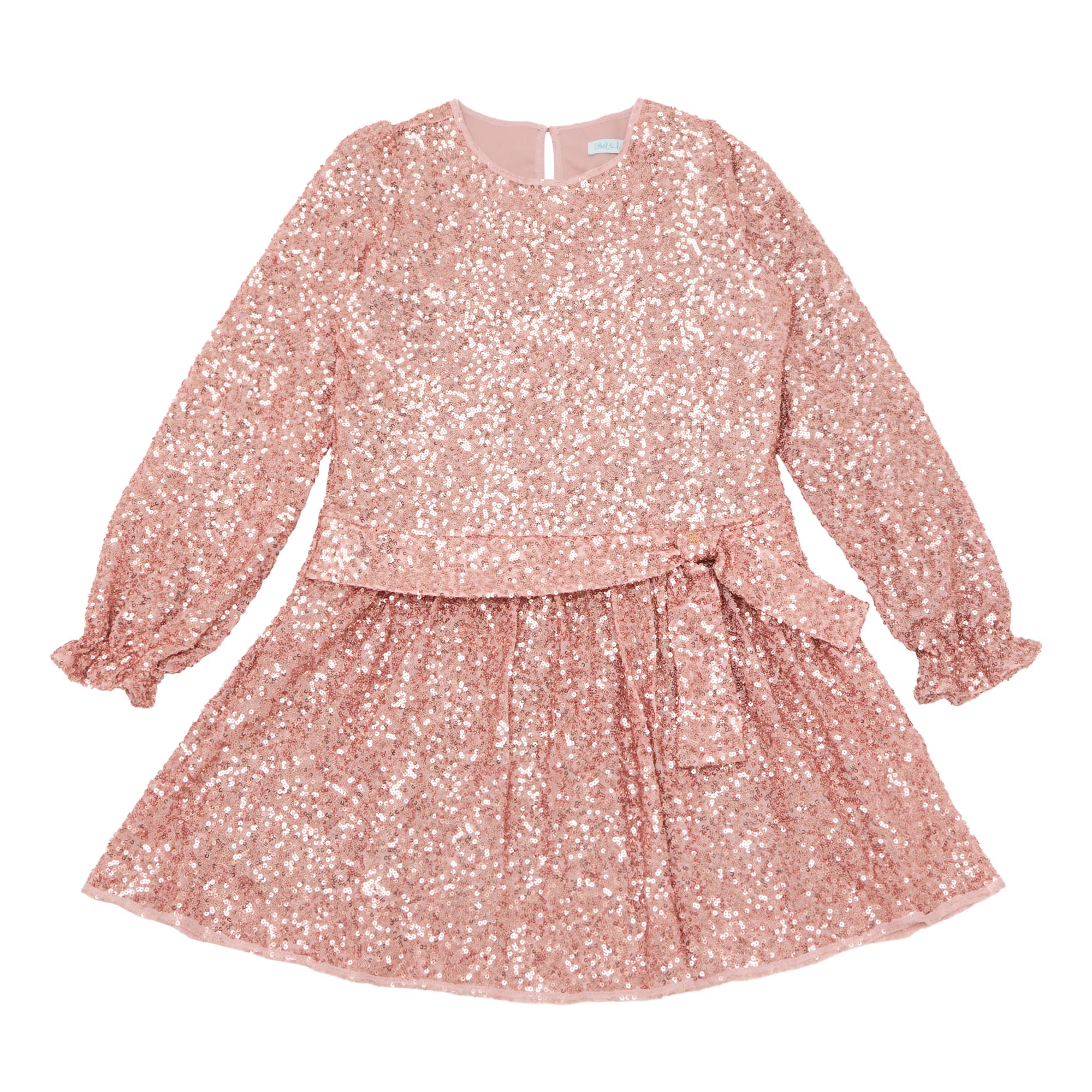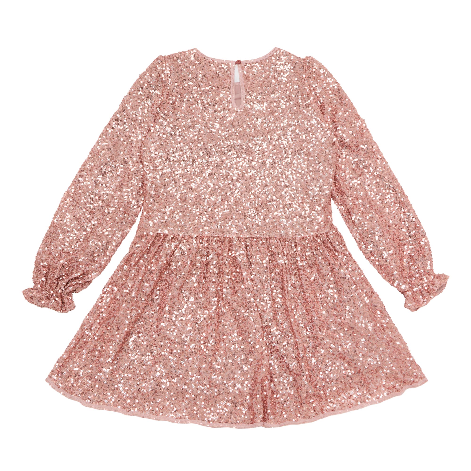 - Round neckline, long sleeves, elasticated fluted cuffs, back keyhole and button fastening, front belt detail, flared silhouette, all-over sequin embellishment, textured finish