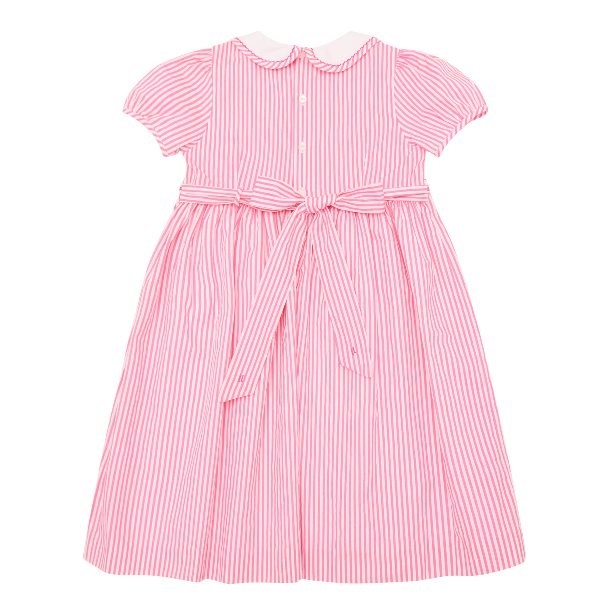 - Peter Pan collar with trim detailing, short sleeves, button fastening to the back, self-tie belt, pleated skirt, stripe print