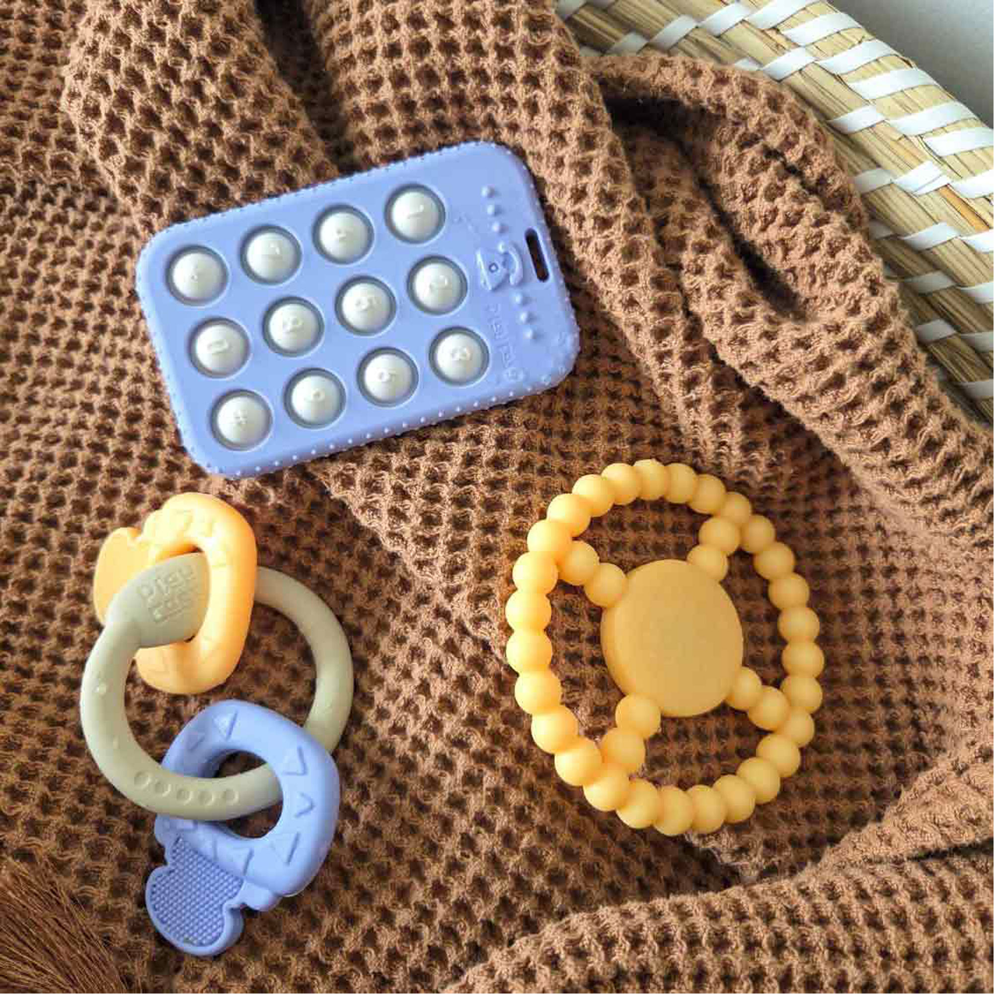 • Teething toys, phone shape with popper buttons, steering wheel shape, set of keys, soothes teething gums, food-grade silicone, BPA-free, textured finish, sensory discovery, early play skills