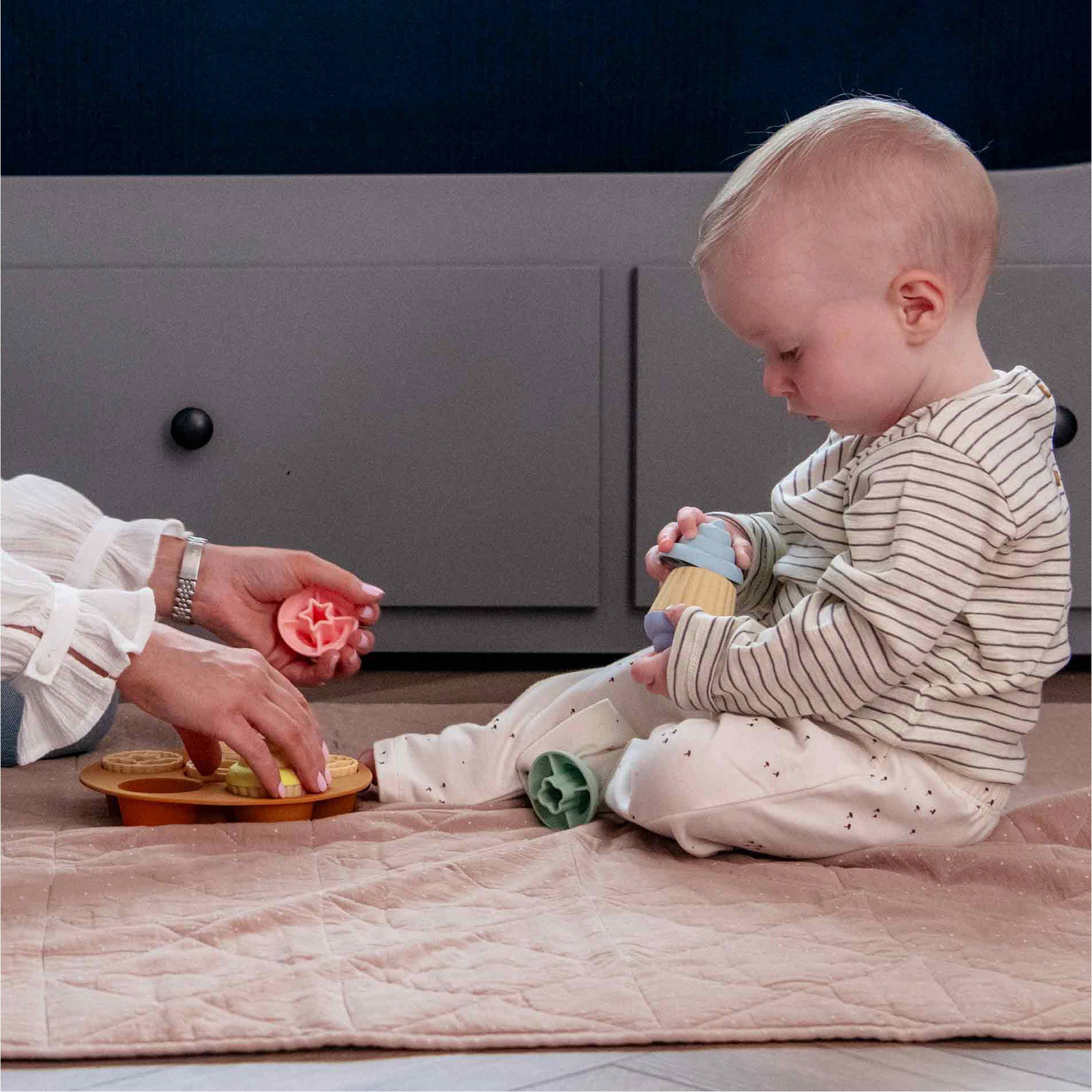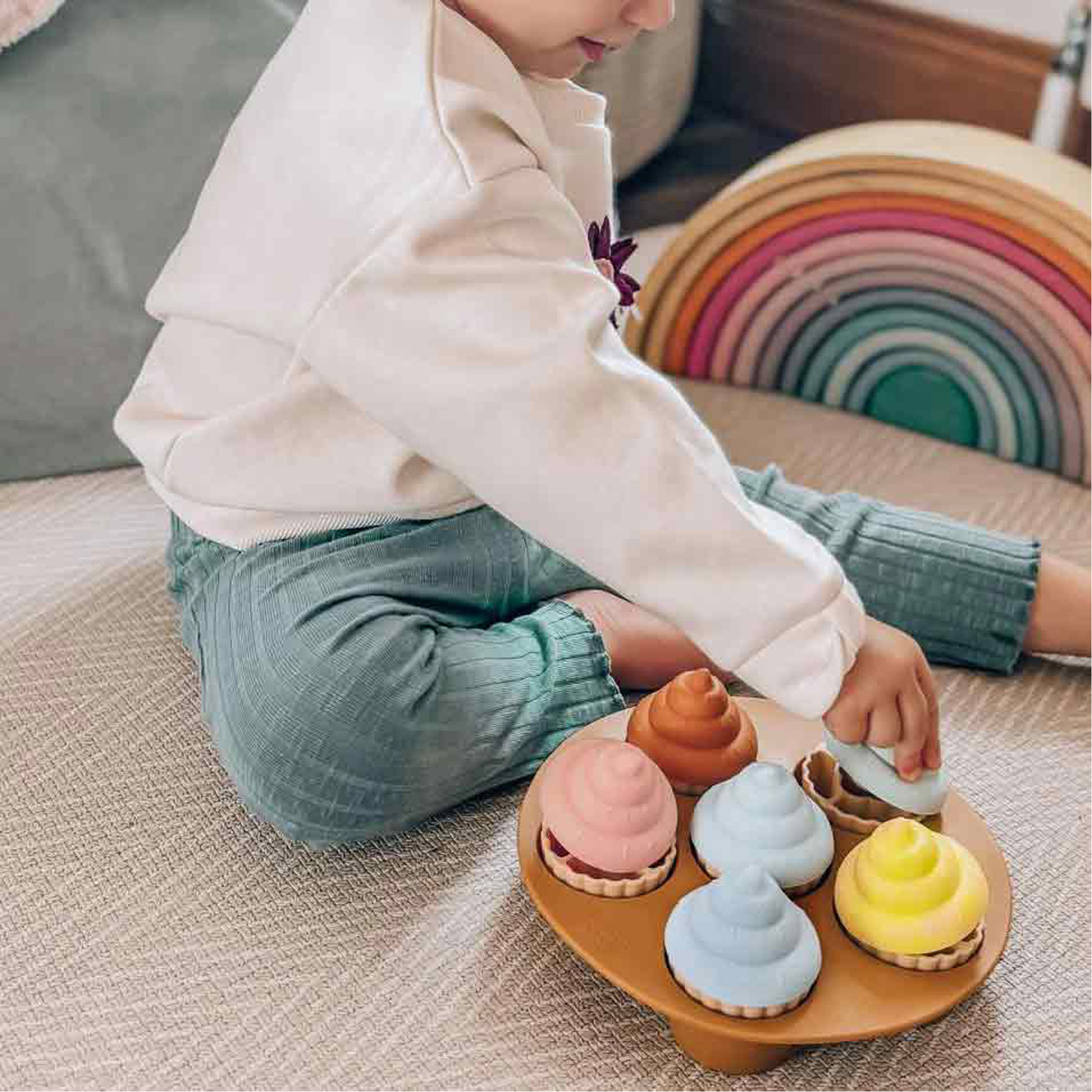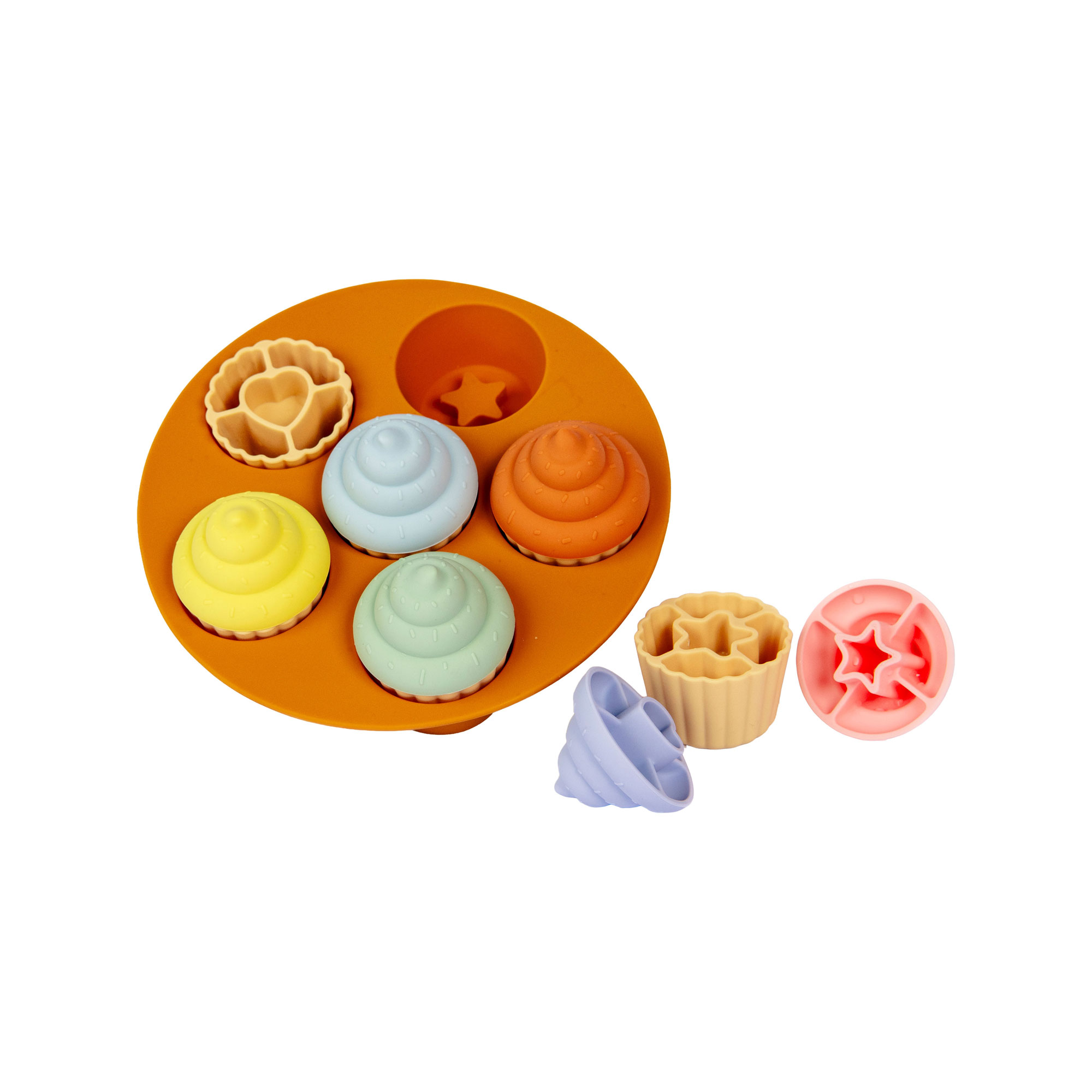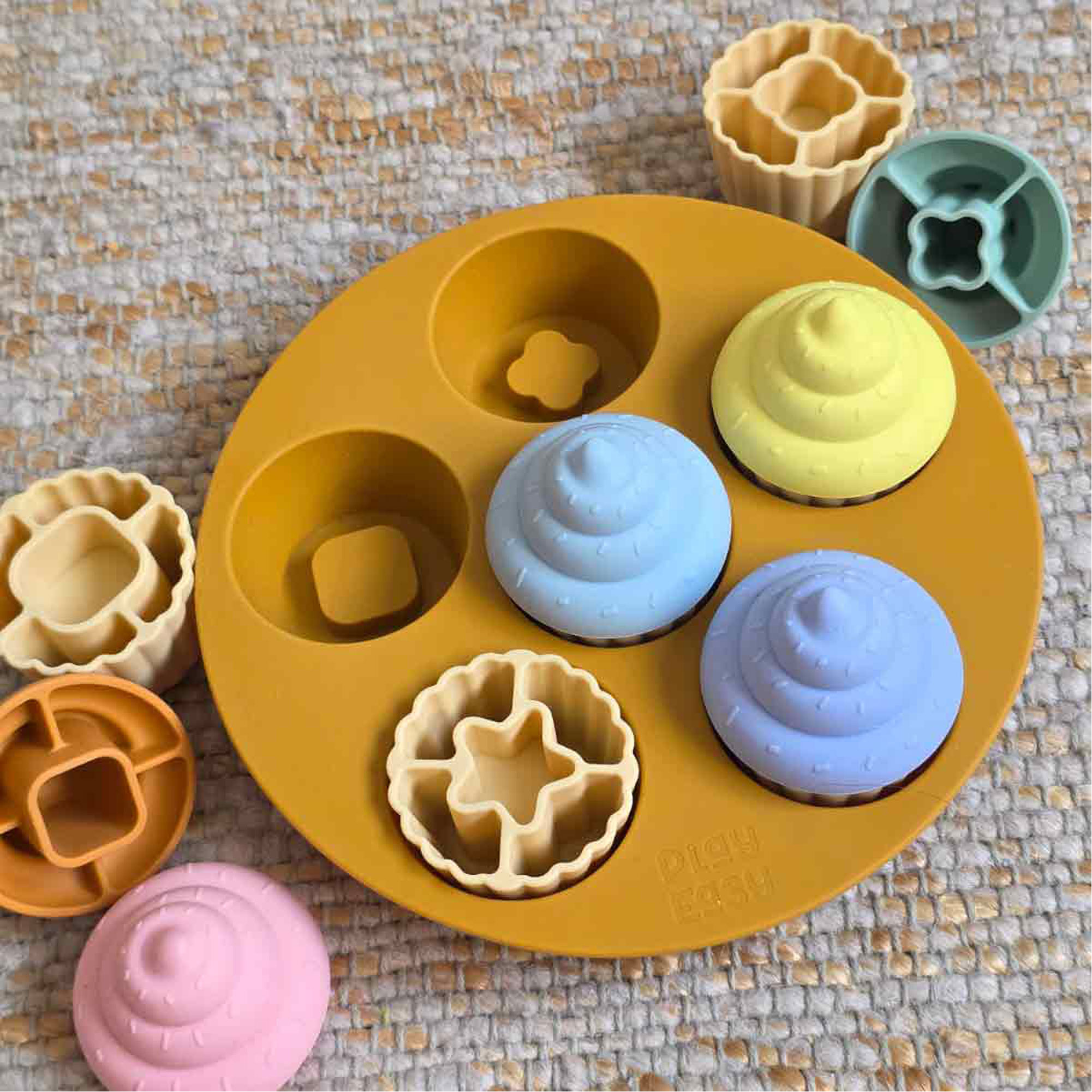 - One tray, six cupcakes, hidden shapes inside, soft feel, food-grade silicone, chew-safe, chunky shapes, easy to grip, encourages fine motor skills, encourages hand-eye coordination, encourages early problem-solving