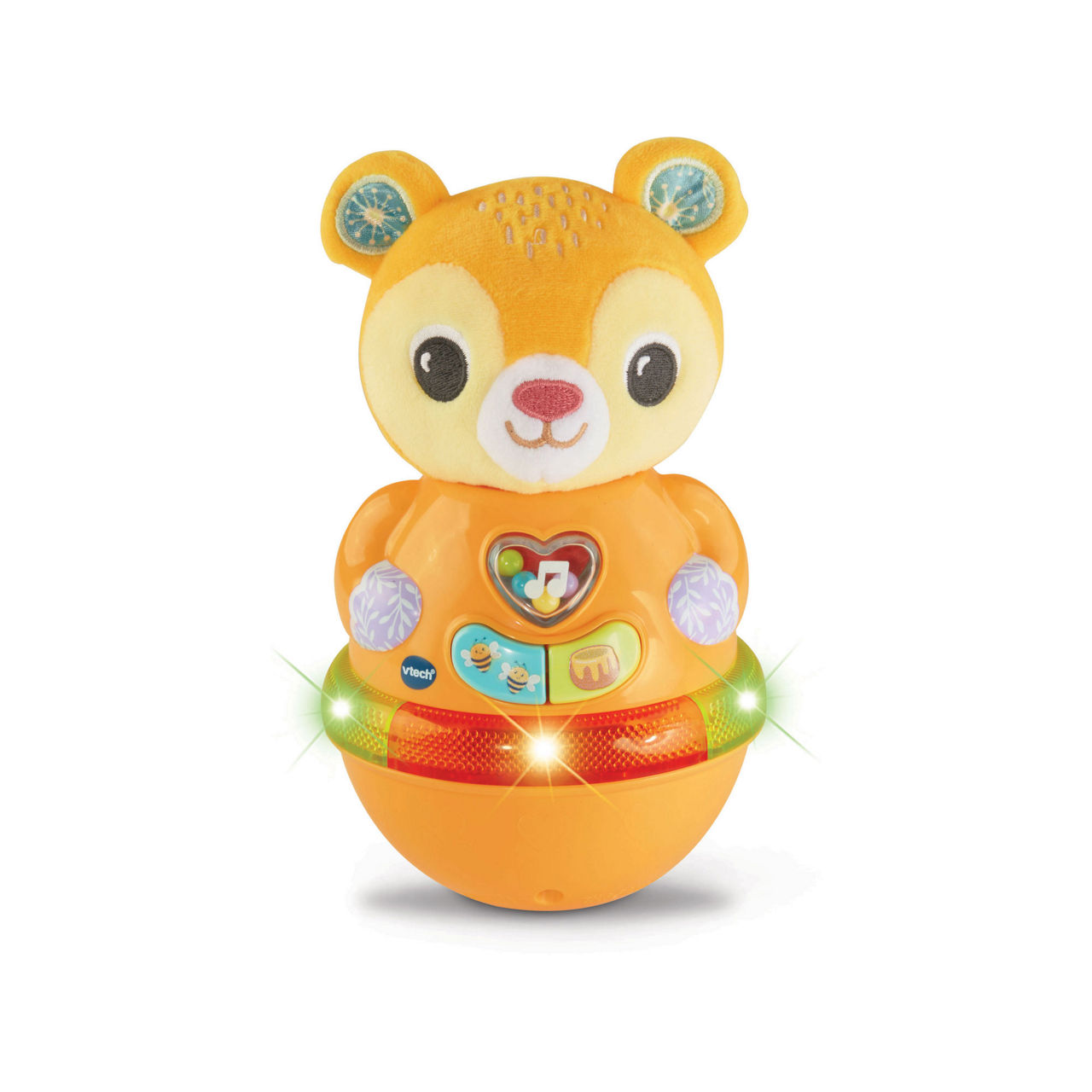 The Rock and Roll Bear from Vtech likes to wobble back and forth! Press the heart, bee or honey pot buttons to hear fun phrases, sing-along songs, melodies and sounds. Soft textured ears provide tactile stimulation. Pushing Bear supports gross motor movement while the bright colours and light up ring provide visual stimulation.
