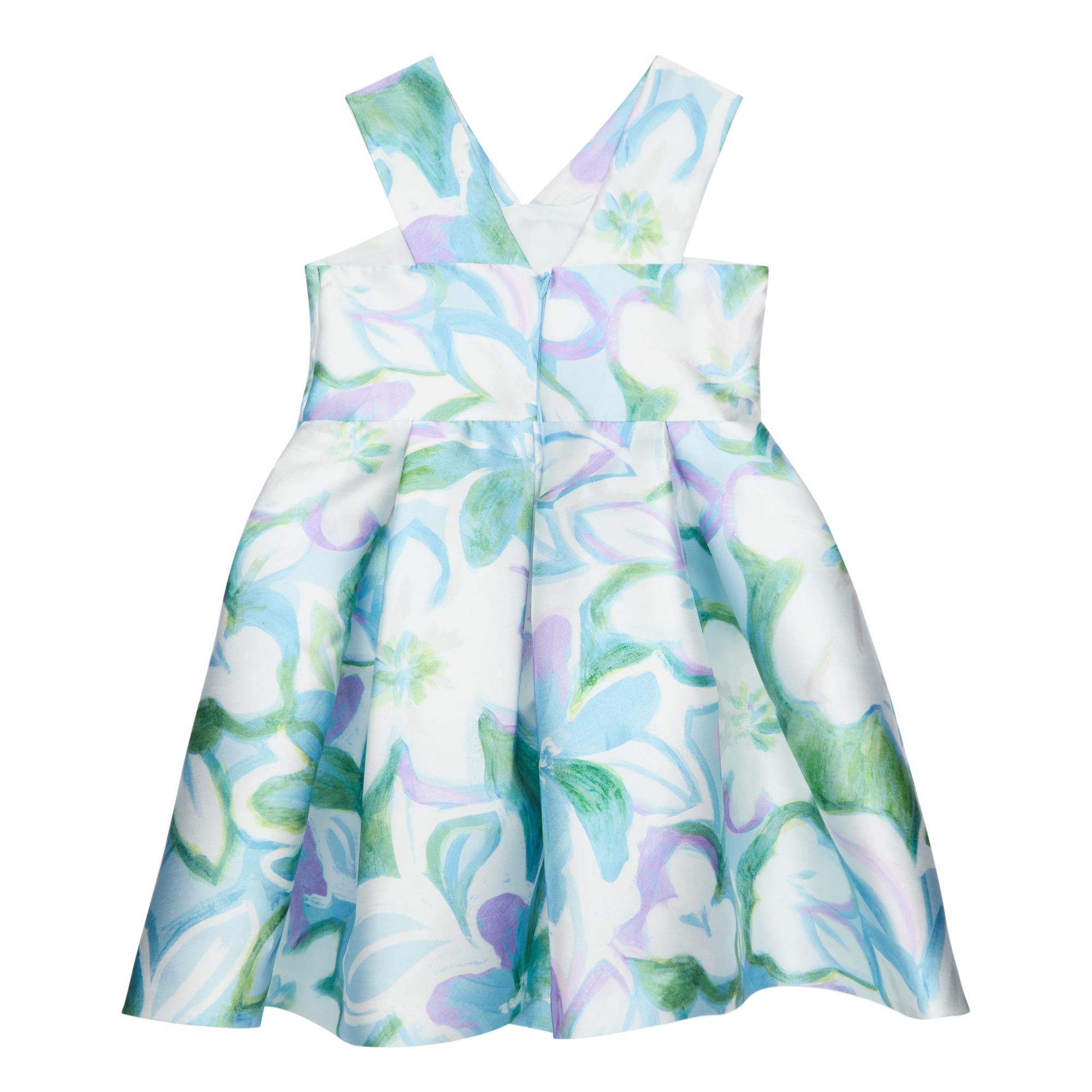 • Sleeveless, floral print, 3D floral details, V-neckline, flared silhouette, zip fastening