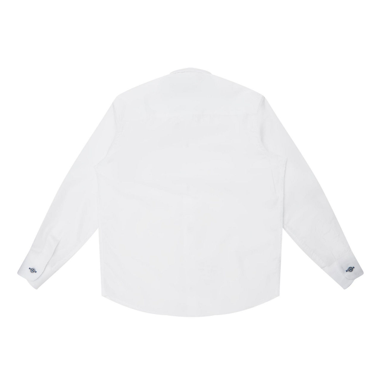 - Point collar, long sleeves, buttoned cuffs, front button fastening, rear yoke, curved hem, interior pattern detailing around the neckline