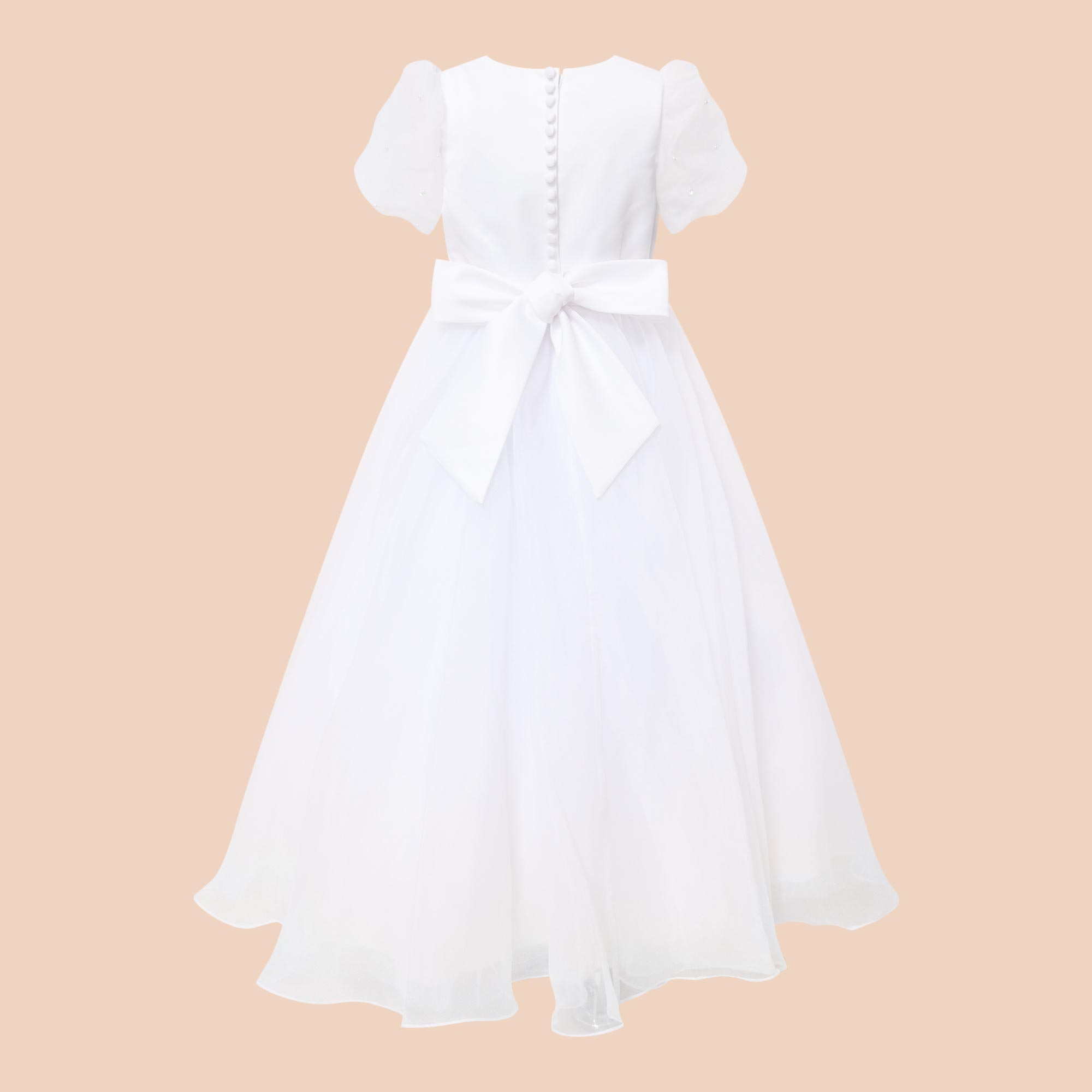 - Round neck, puff cap sleeves, pearl embellished detailing, rear bow detail, concealed back zip fastening with mock button placket, tulle skirt