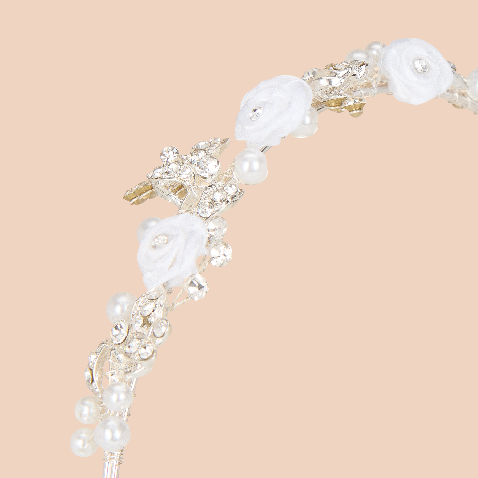 - Diamanté embellished design, floral appliqué detailing, pearlescent stones, polished silver-tone finish