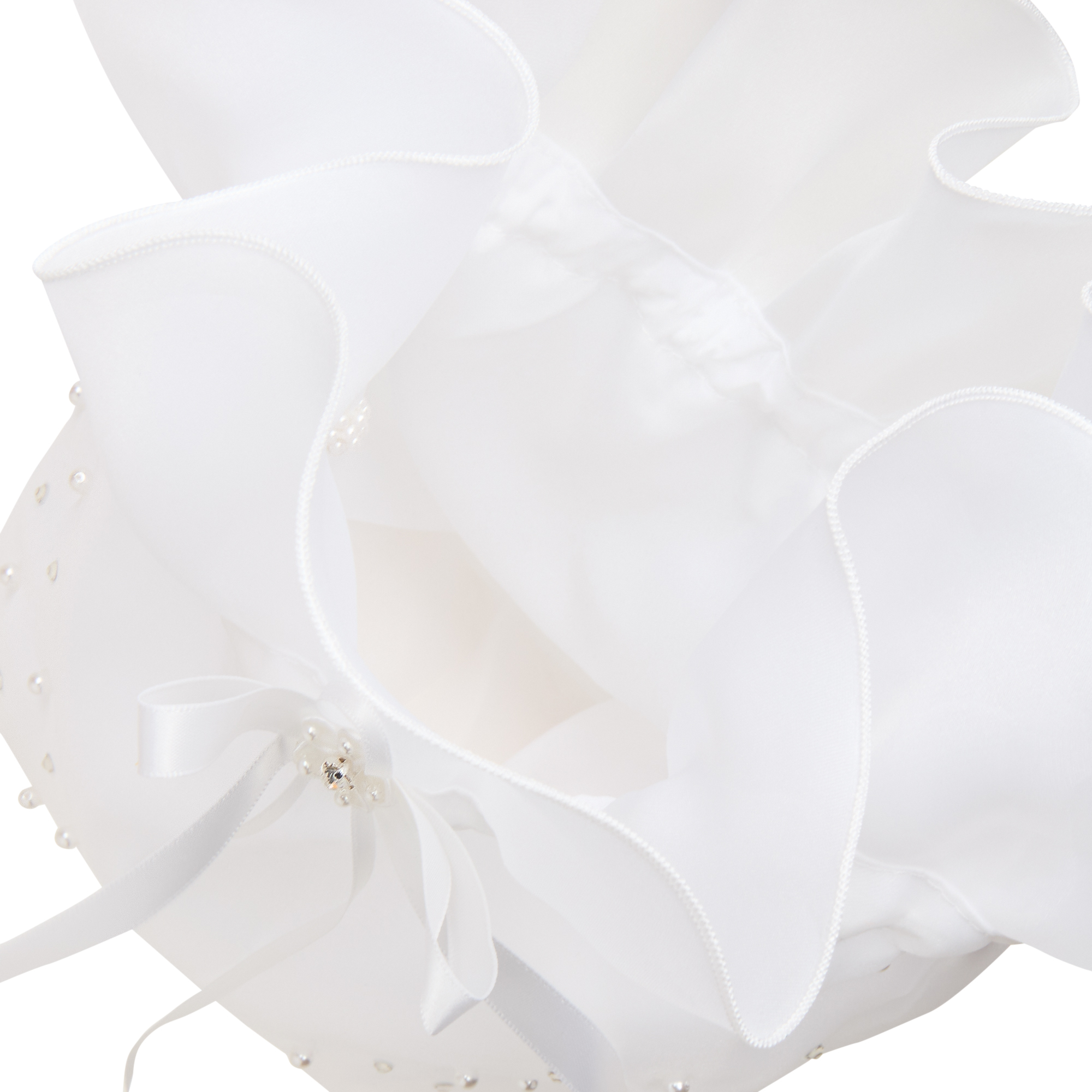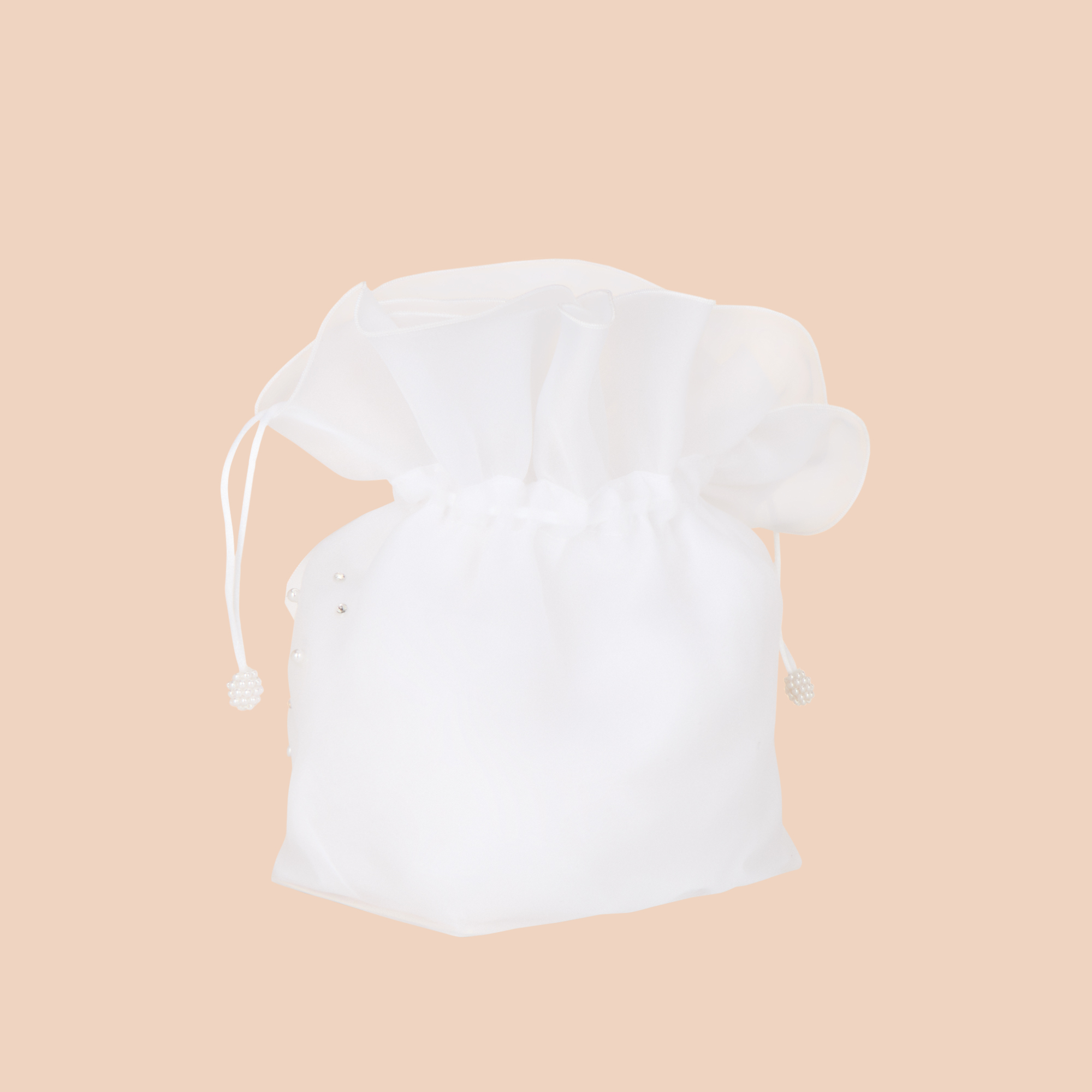 - Drawstring fastening, pearlescent stone embellished ends, bow appliqué, gemstone detailing, satin finish