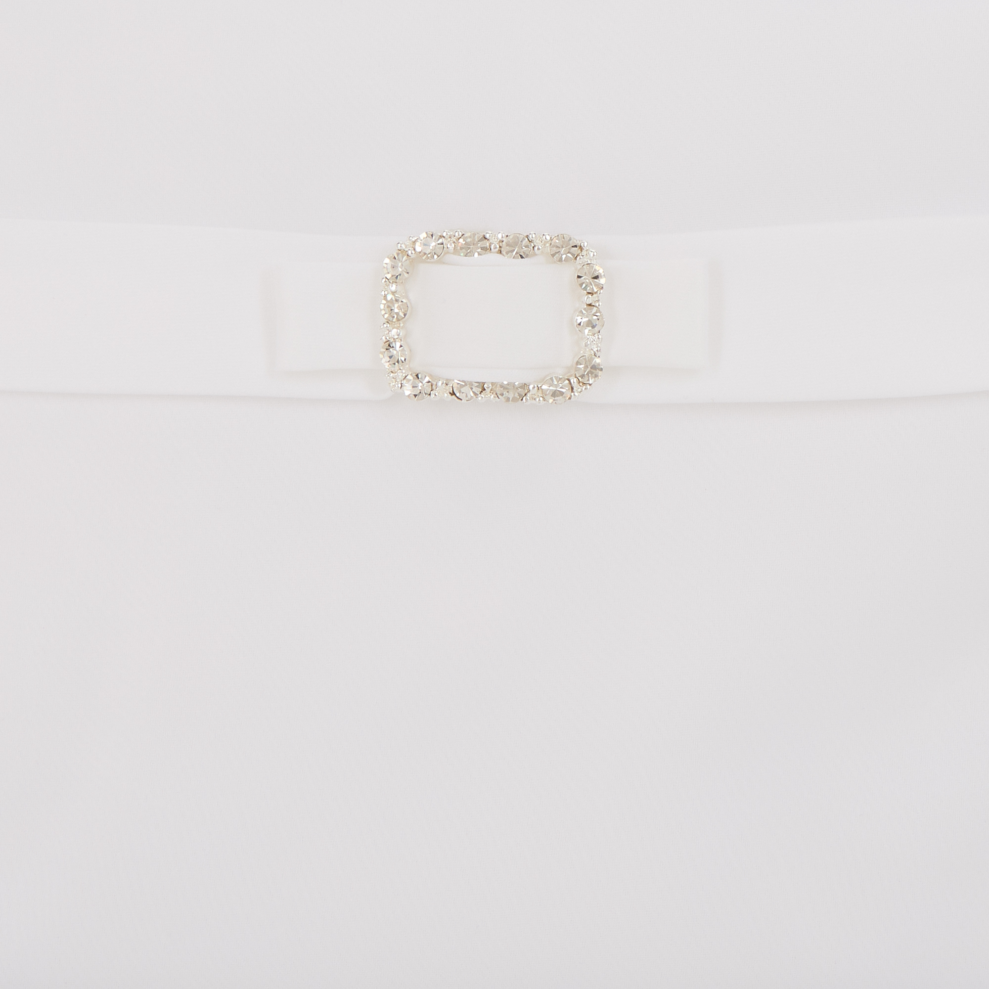 - Shoulder strap, open top design, bow buckle with diamanté detailing, satin finish