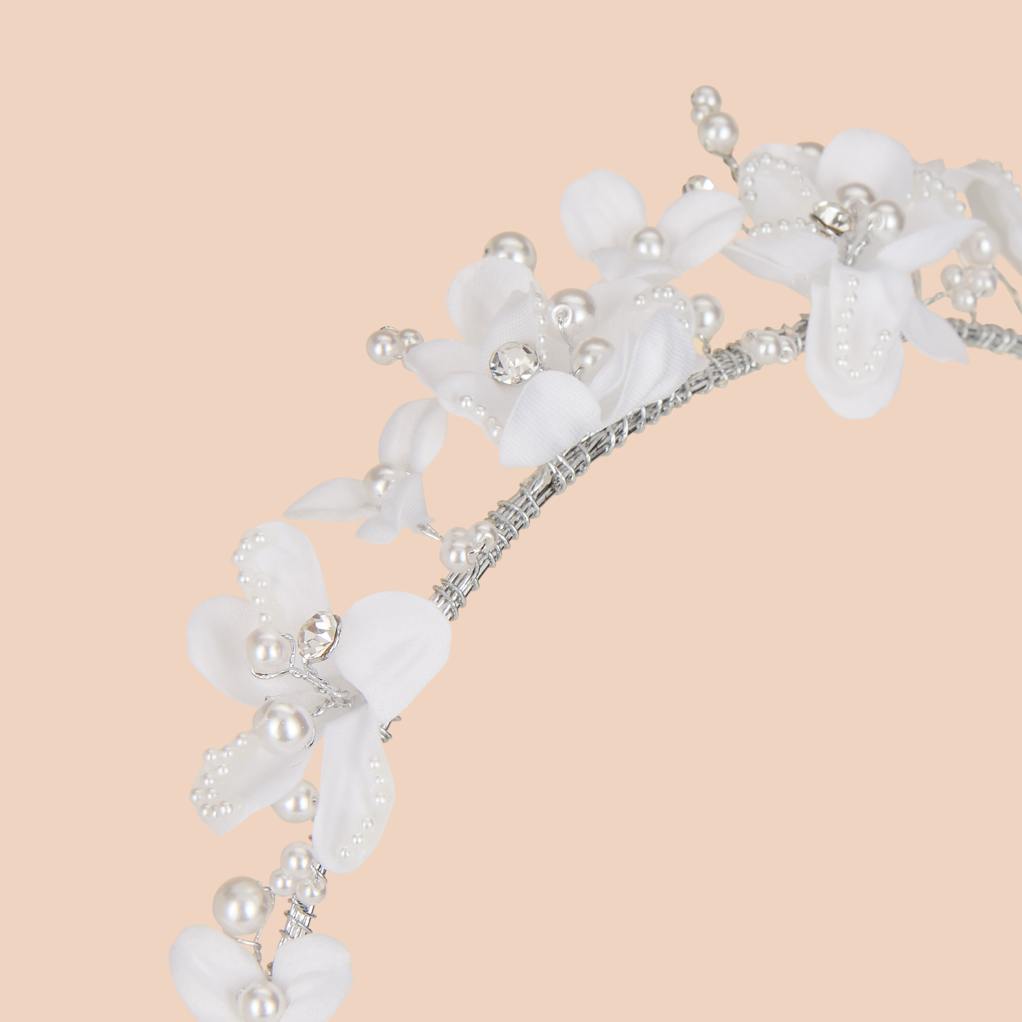 • Slim-style band, faux pearl beaded details, floral embellishment