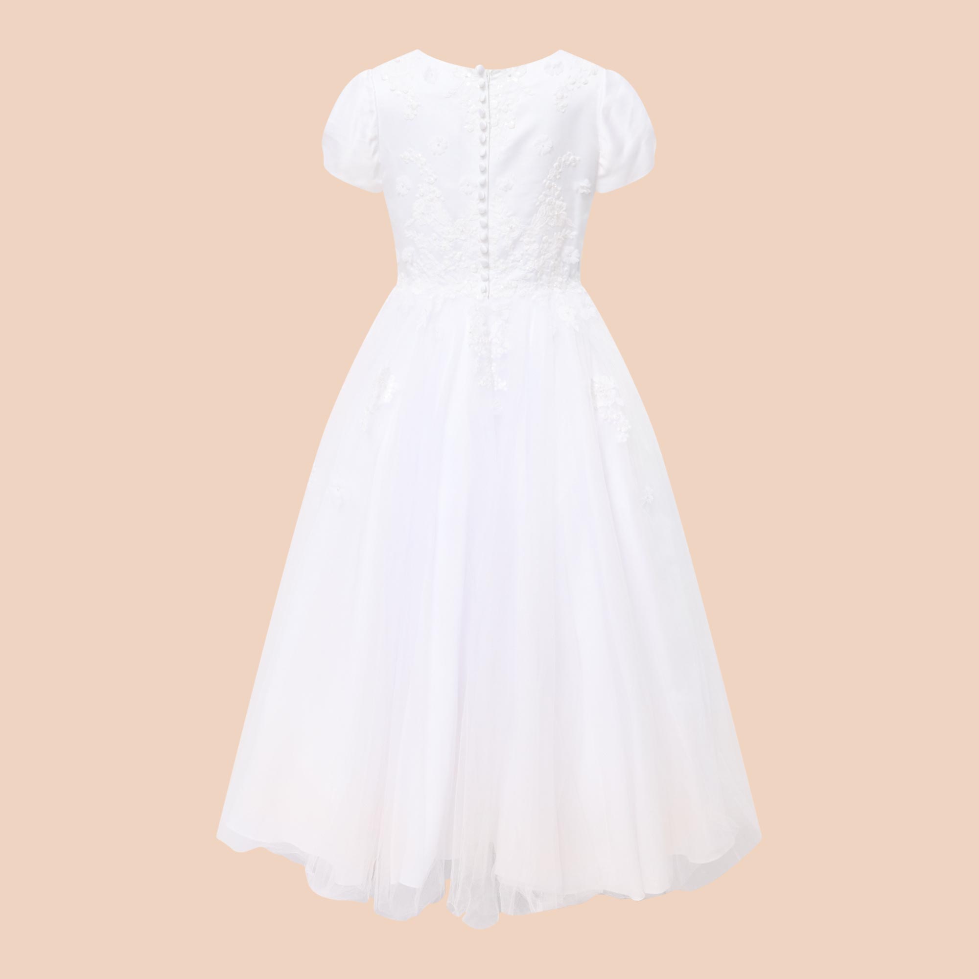 - Round neck, short puff sleeves, floral appliqué bodice, concealed rear zip fastening with mock button placket, tulle skirt, floral embroidered detailing throughout