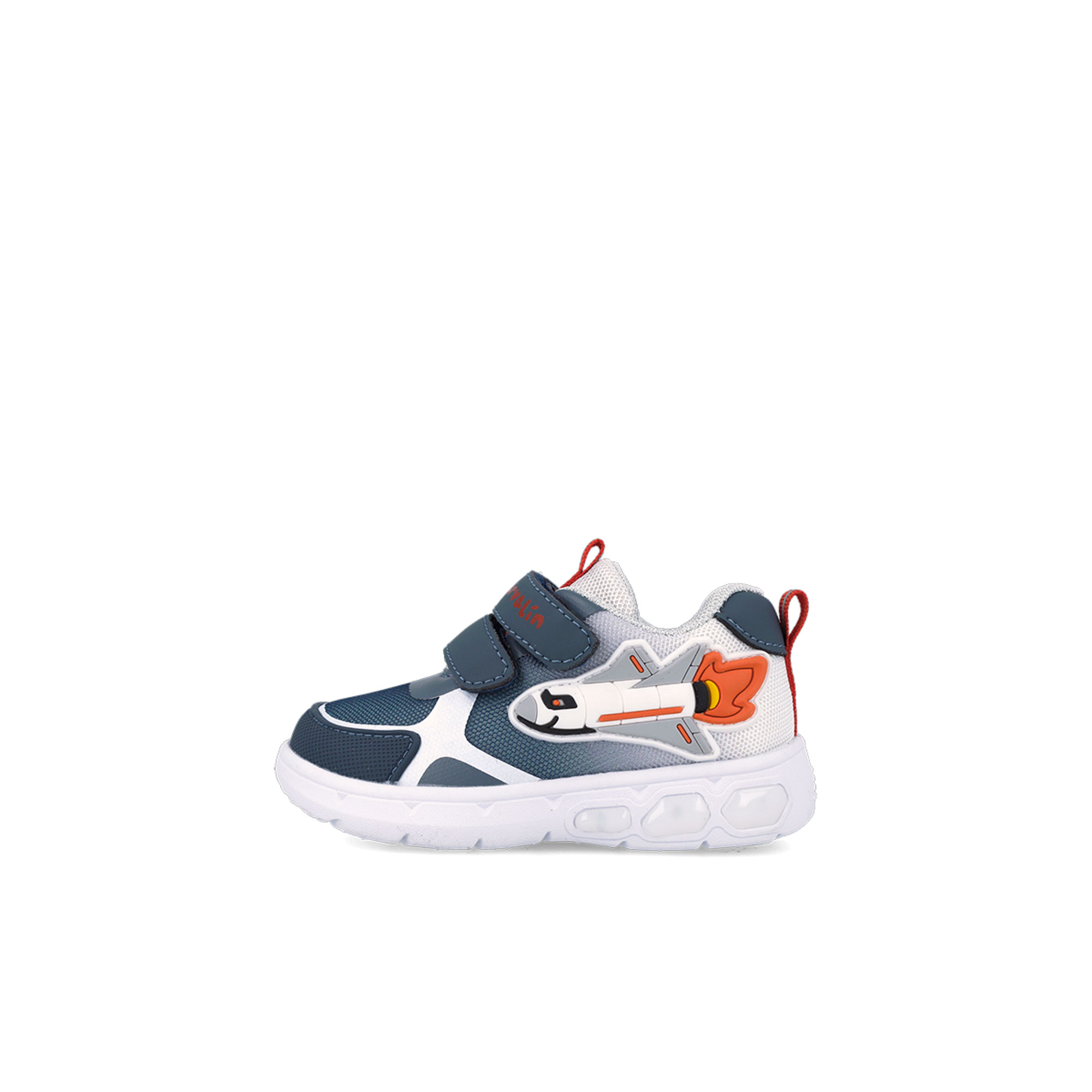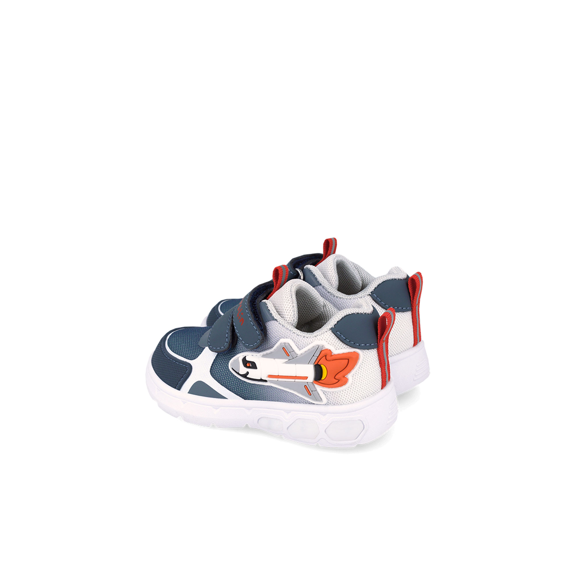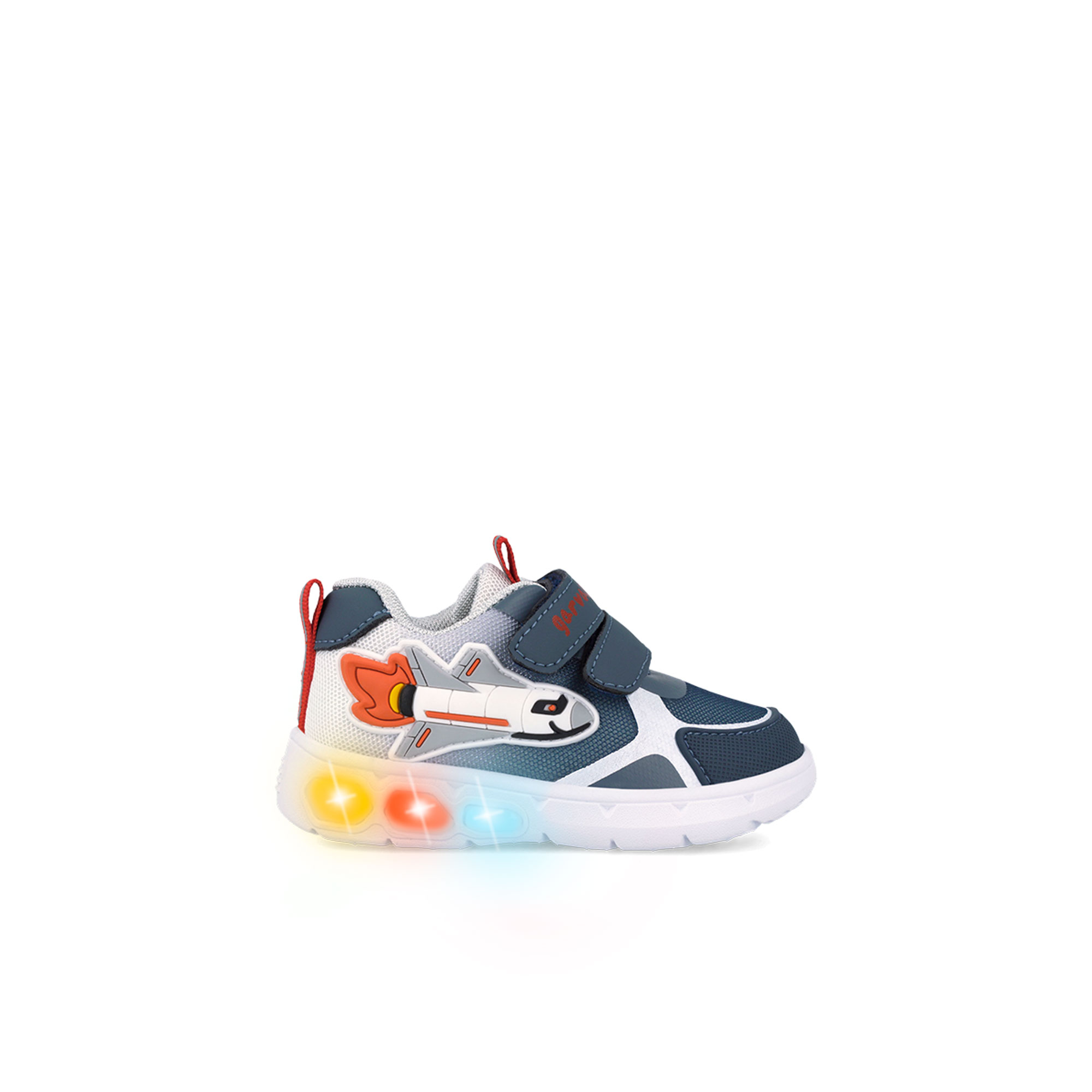 • Dual straps, rip tape fastenings, heel and tongue pull tabs, round toe, mixed panelling, rocket detail, light-up design